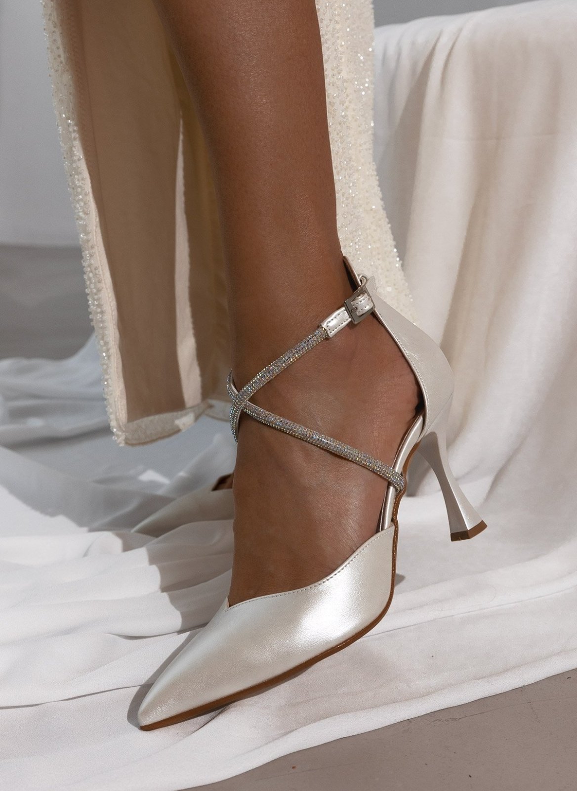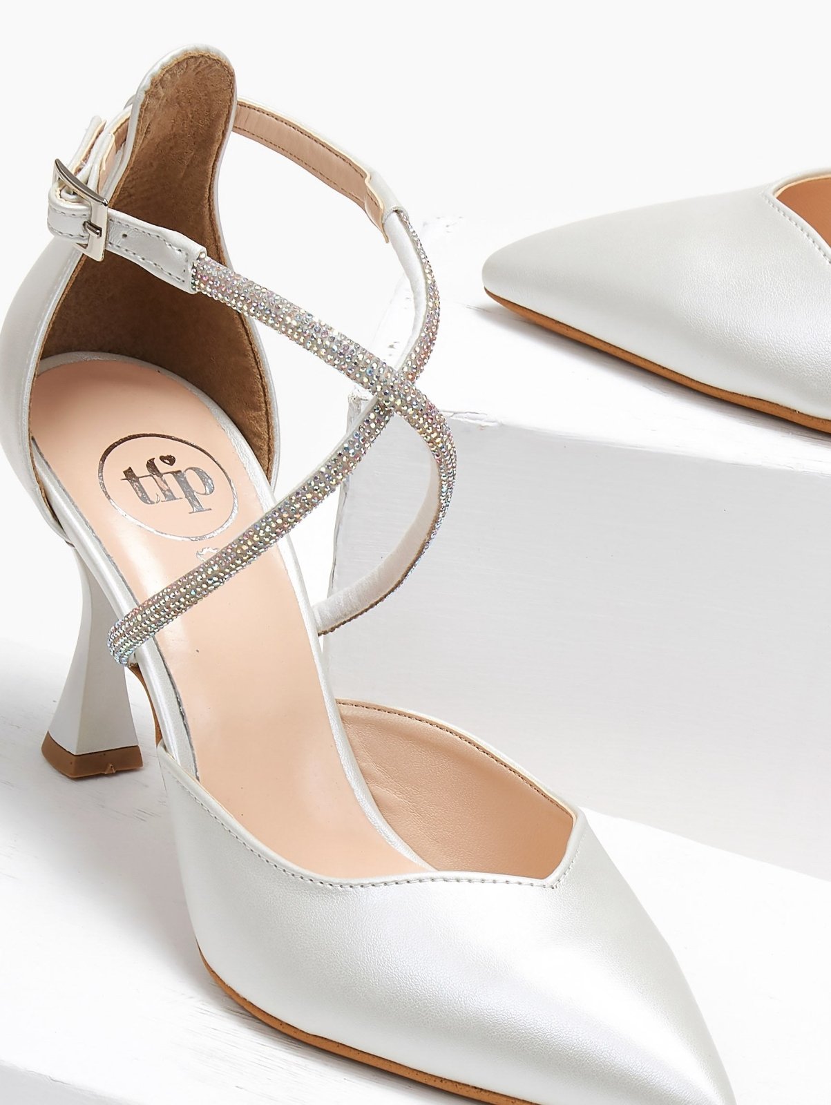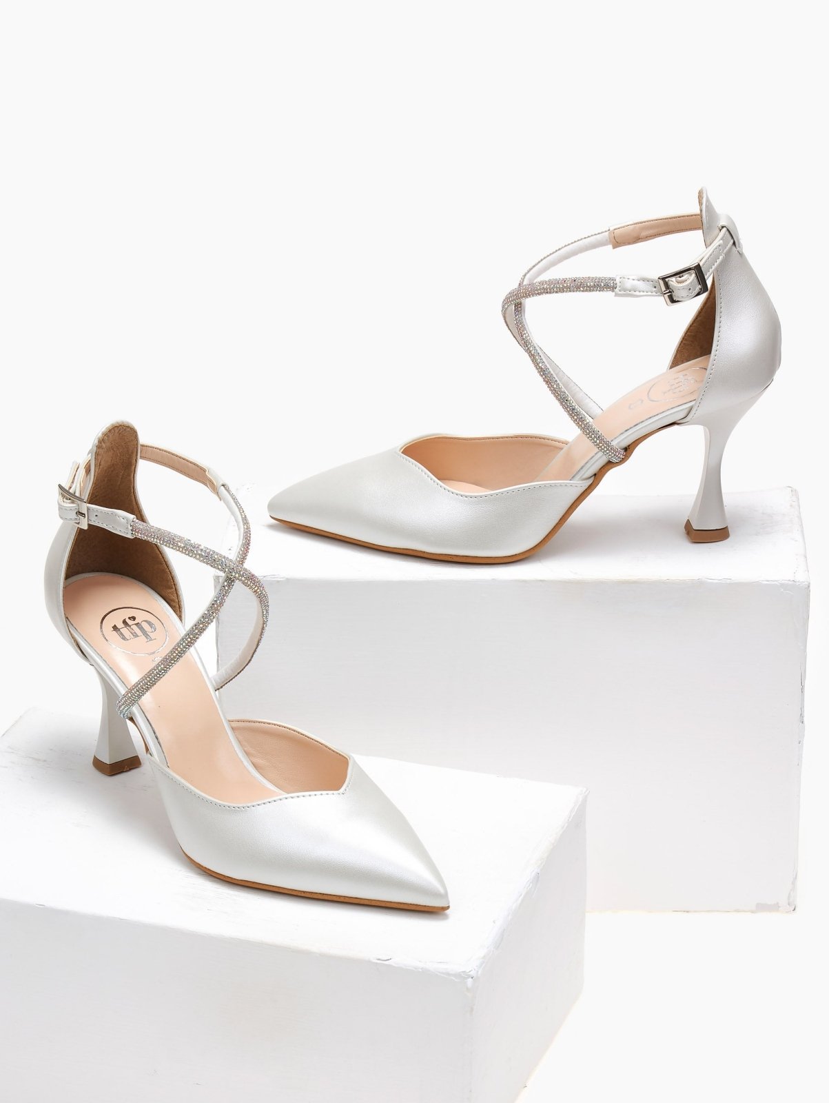 Γόβες μυτερές με ανοιχτά πλαϊνά TFP. Έχουν crossover λουράκια με στρας στο ύψος του κουτεπιέ. Δένουν στο πλάι. Δερμάτινος πάτος. Ελληνικής κατασκευής.