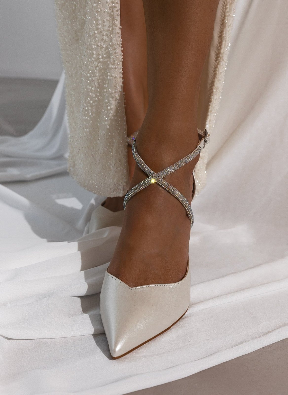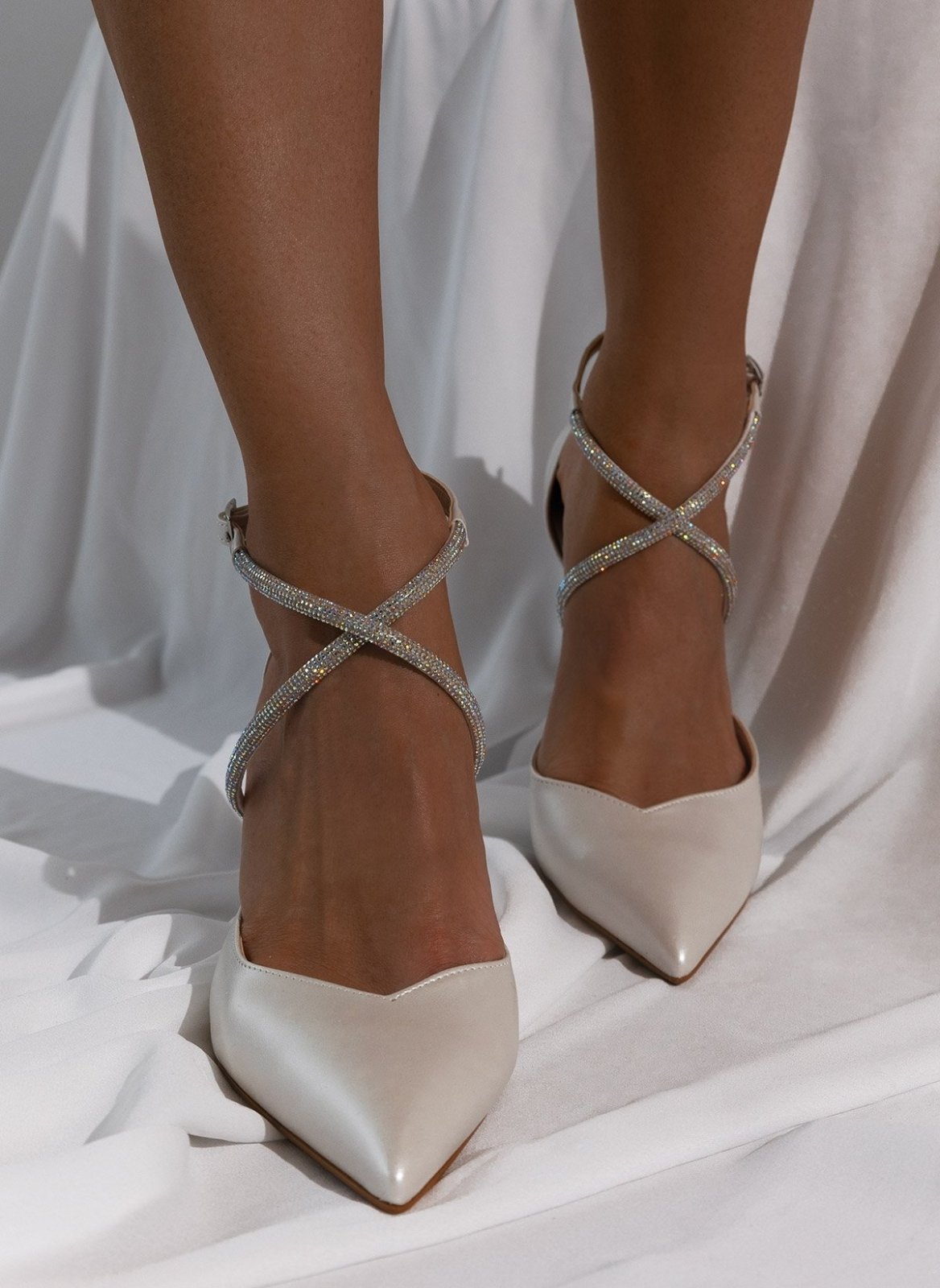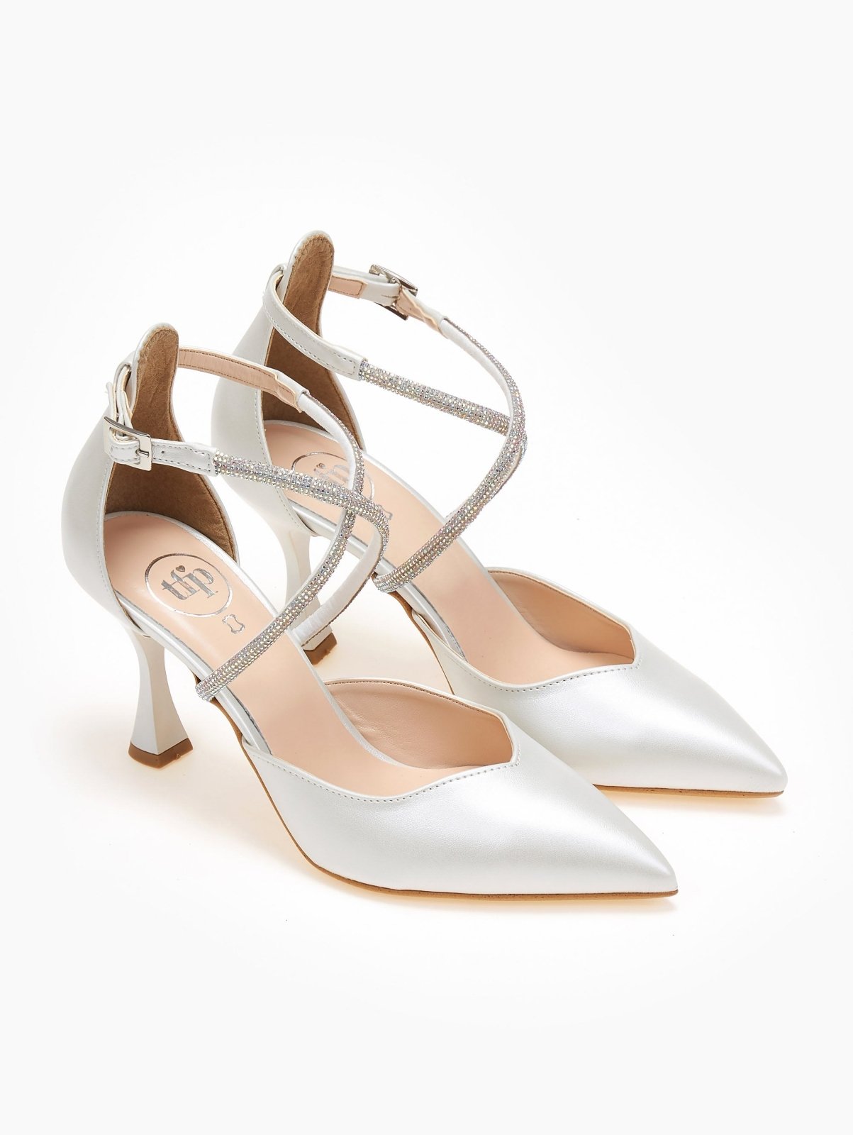 Γόβες μυτερές με ανοιχτά πλαϊνά TFP. Έχουν crossover λουράκια με στρας στο ύψος του κουτεπιέ. Δένουν στο πλάι. Δερμάτινος πάτος. Ελληνικής κατασκευής.