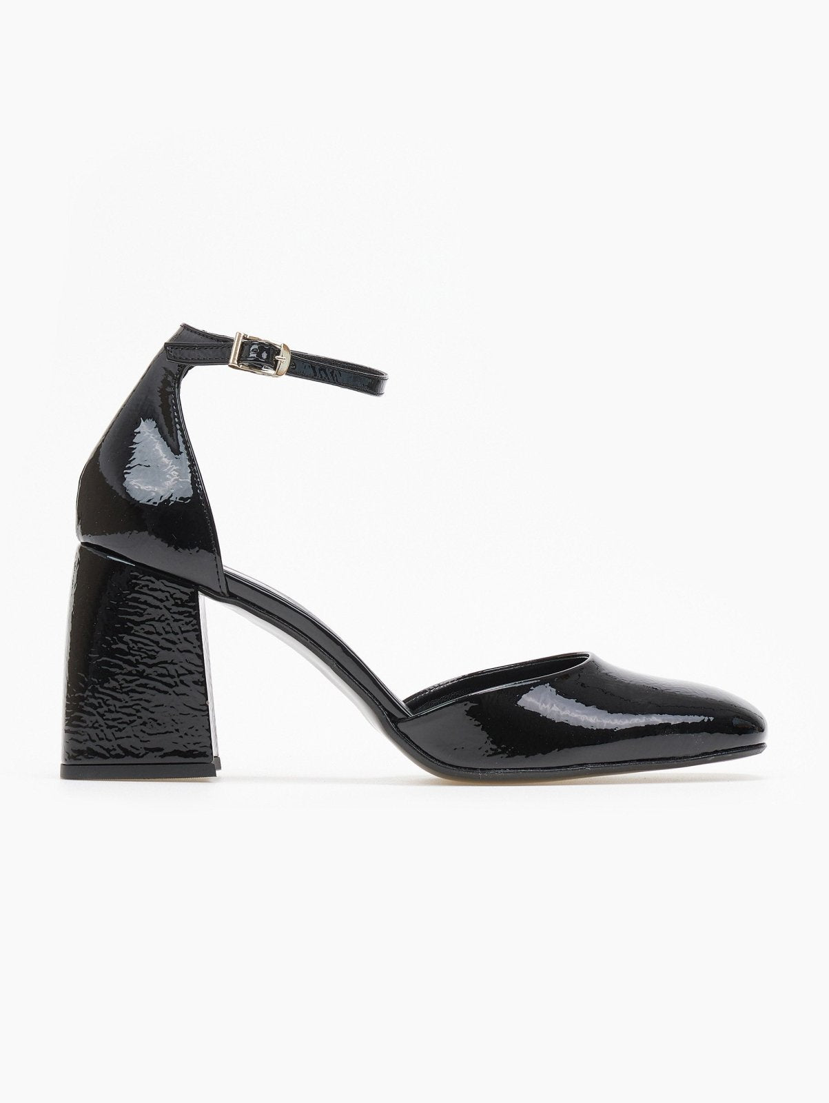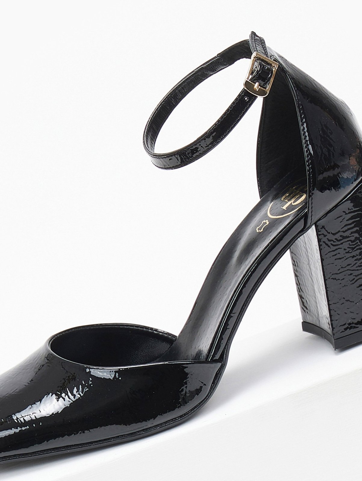Γόβες λουστρίνι tfp. Έχουν ανοιχτά πλαϊνά και κλειστή φτέρνα. Δένουν με μπαρέτα στο ύψος του αστραγάλου. Καρέ γραμμή. Δερμάτινος πάτος. Ελληνικής καατσκευής.