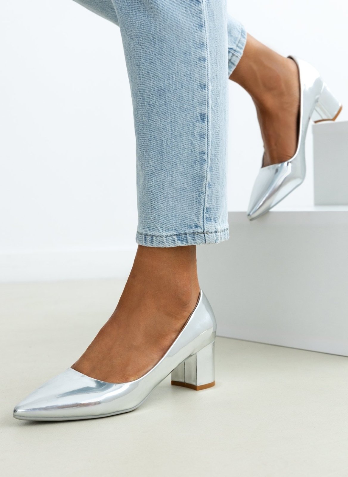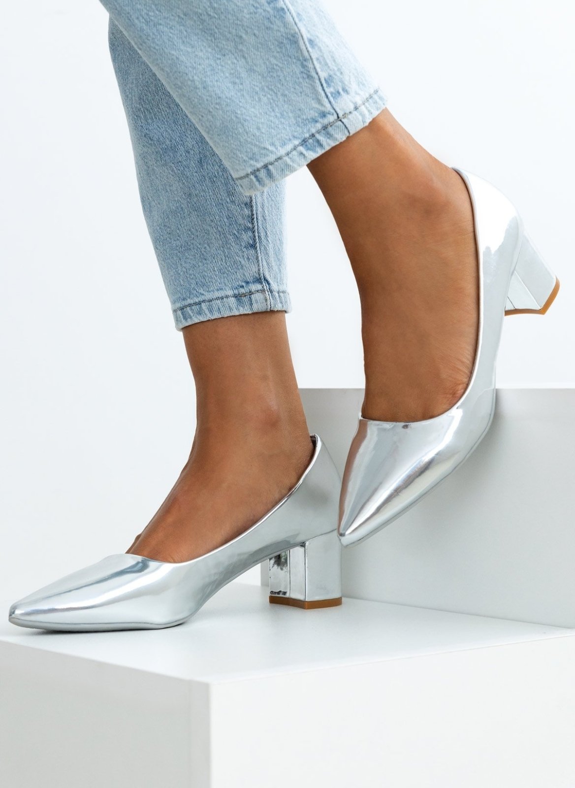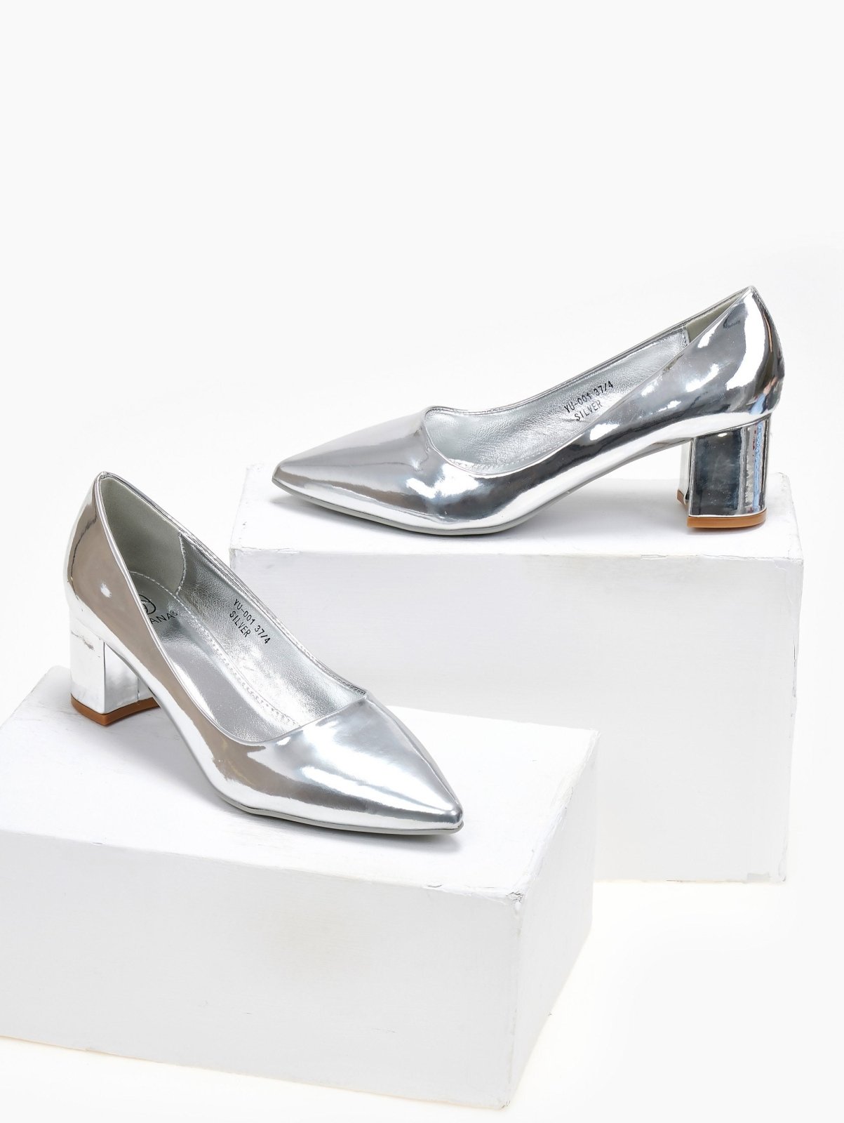 Γόβες μυτερές λουστρίνι. Έχουν χαμηλό τετράγωνο τακούνι. Μαλακή σόλα με λάστιχο.