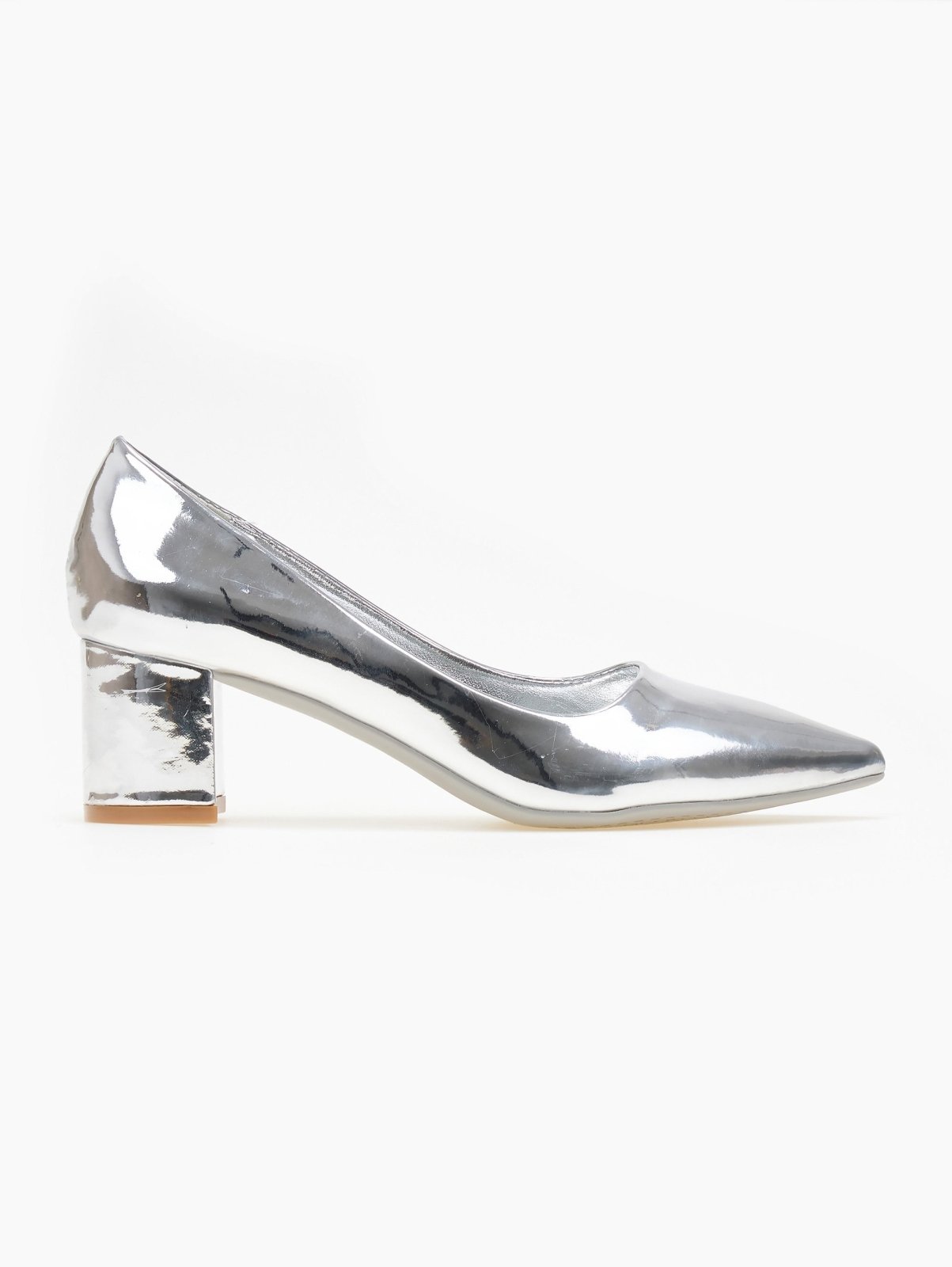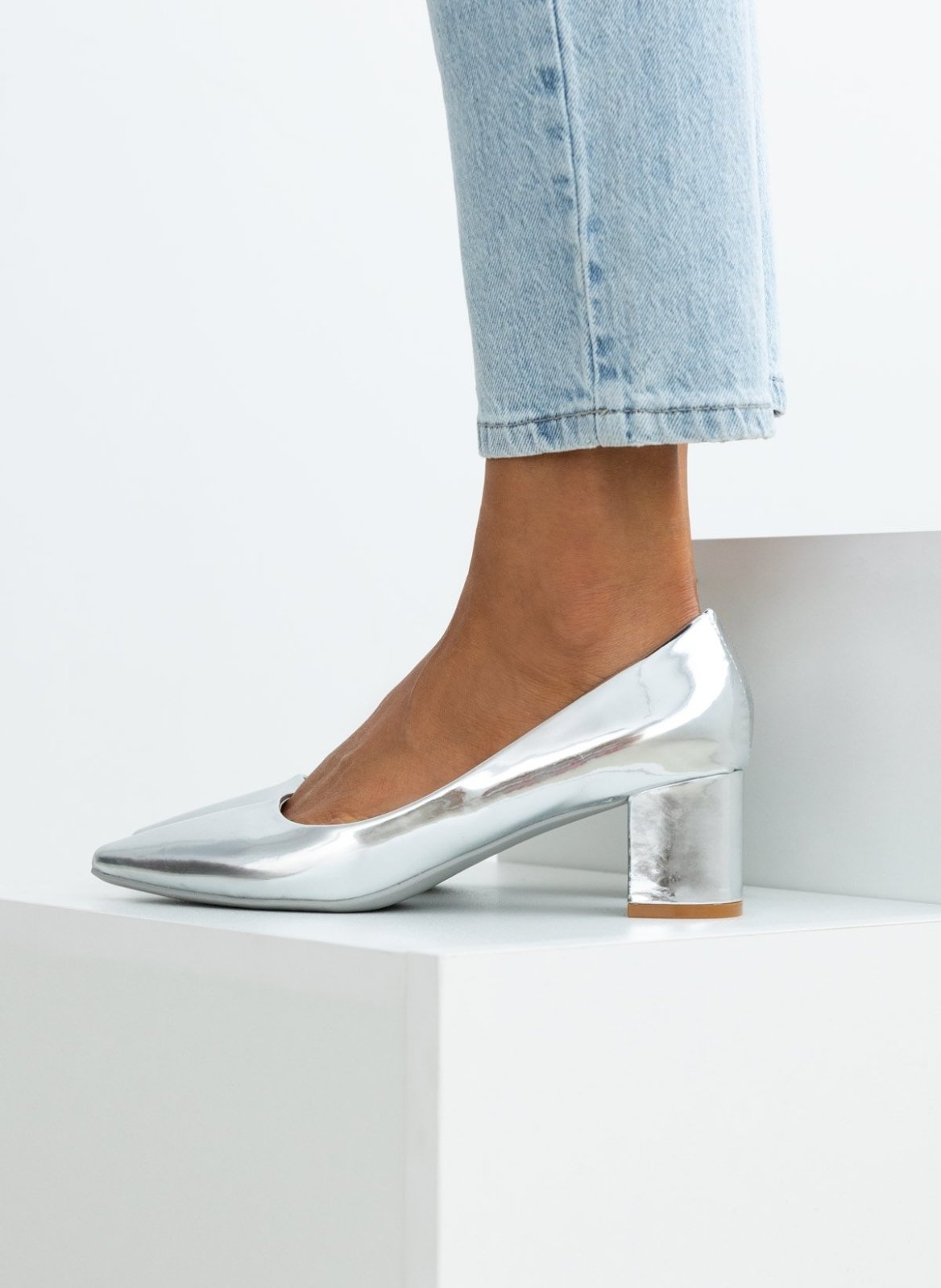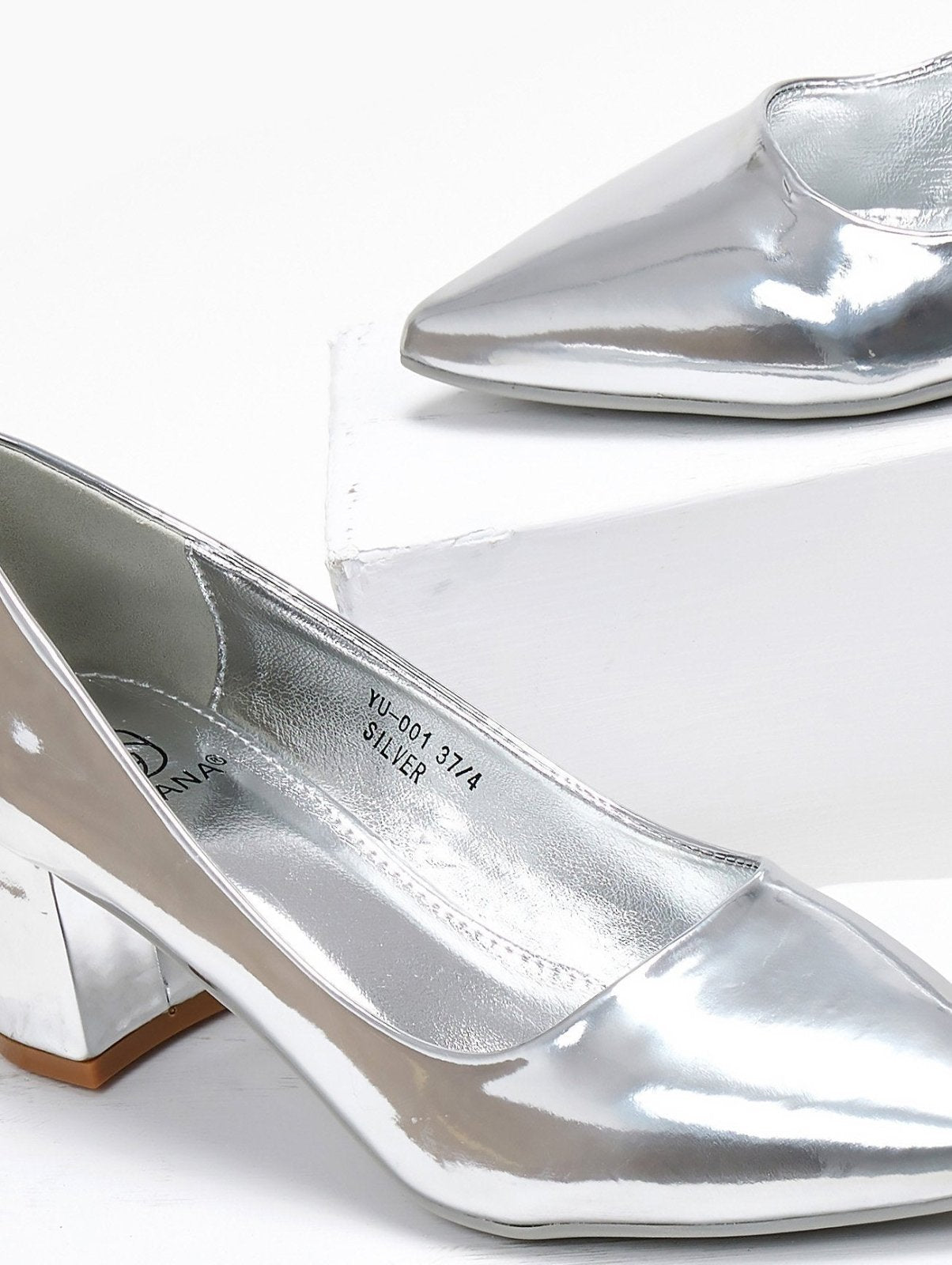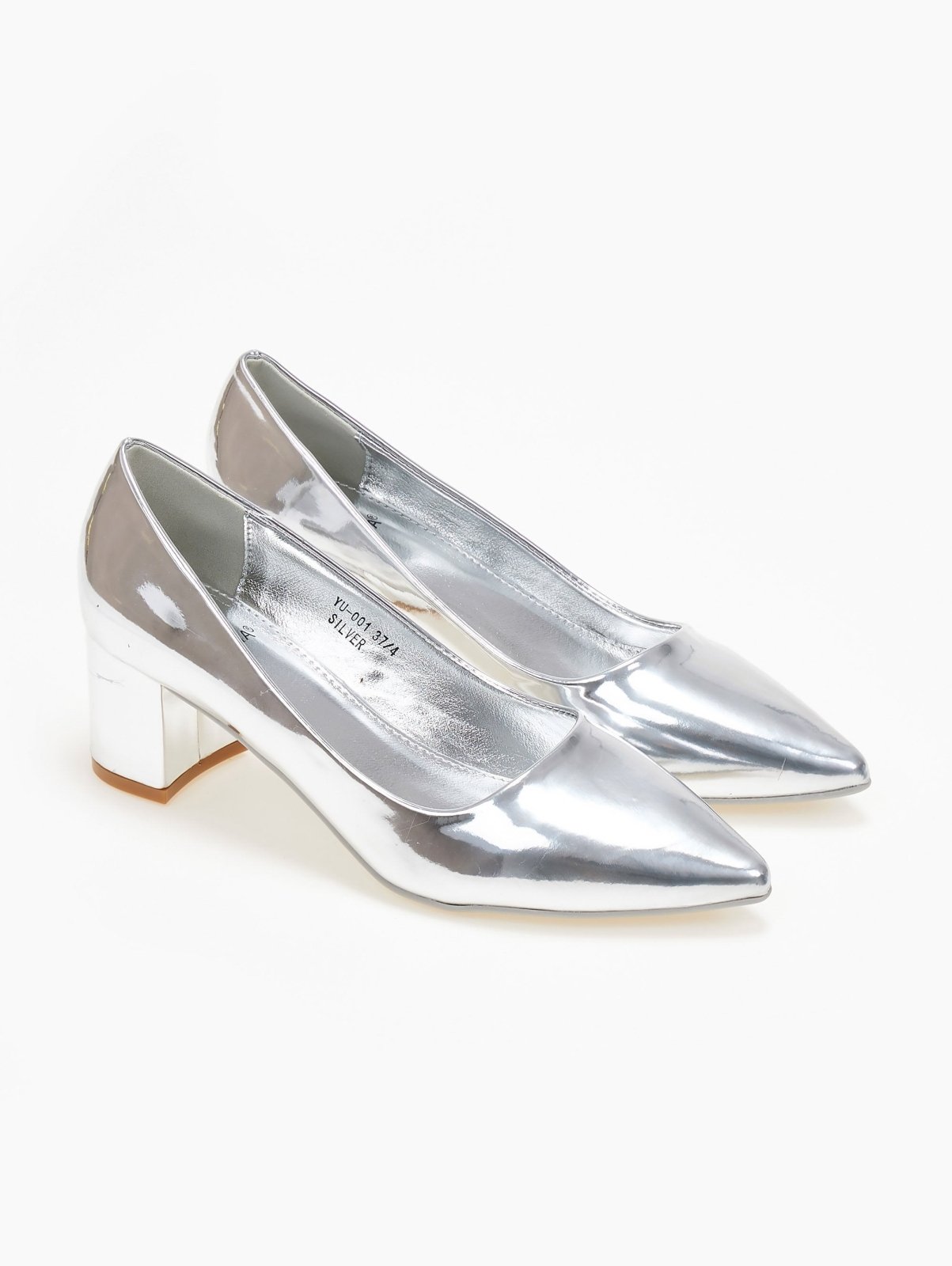 Γόβες μυτερές λουστρίνι. Έχουν χαμηλό τετράγωνο τακούνι. Μαλακή σόλα με λάστιχο.
