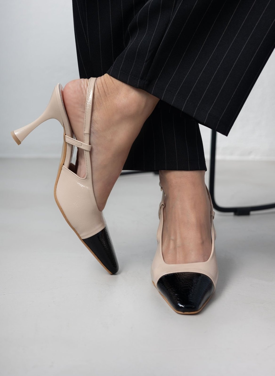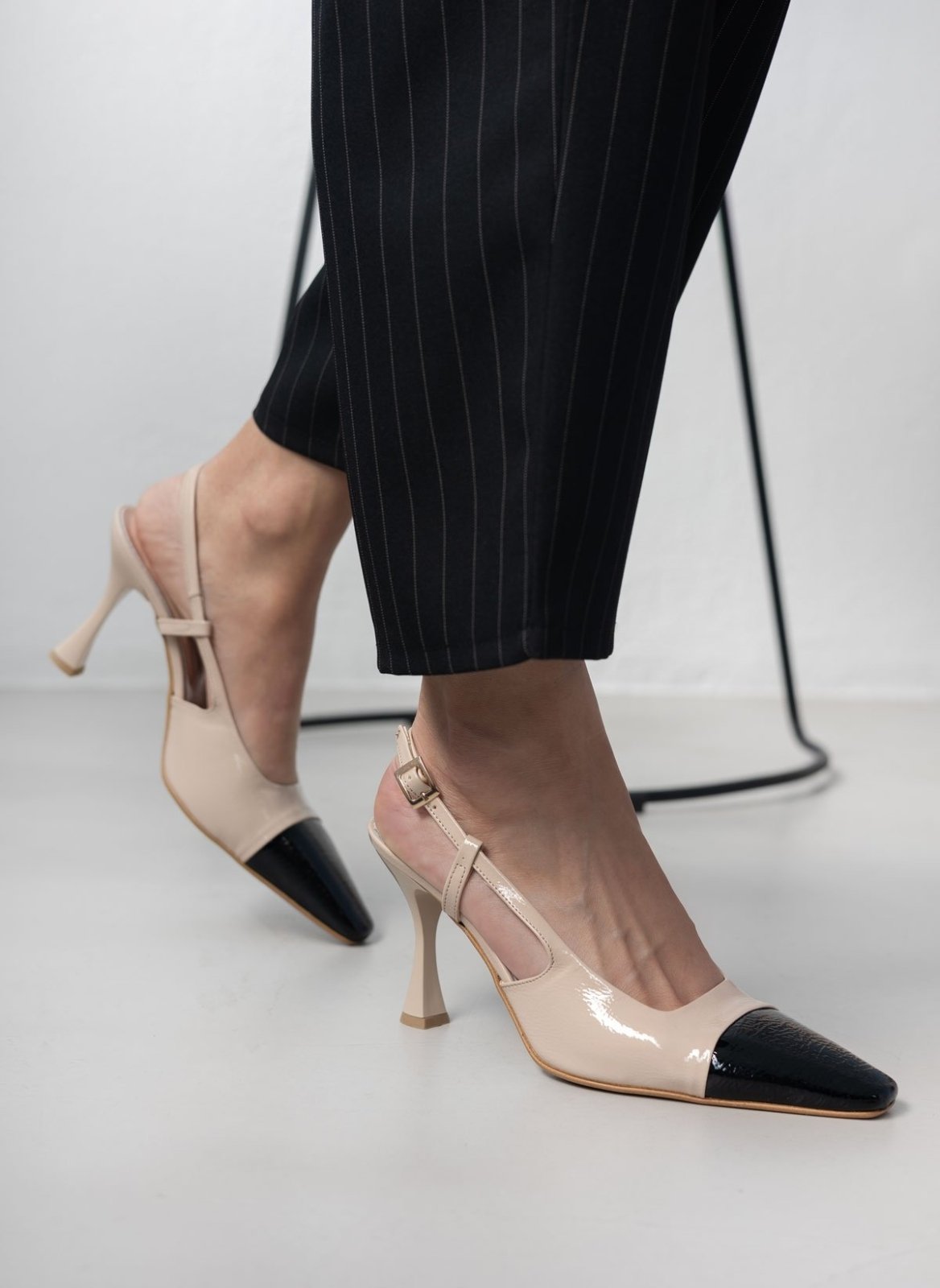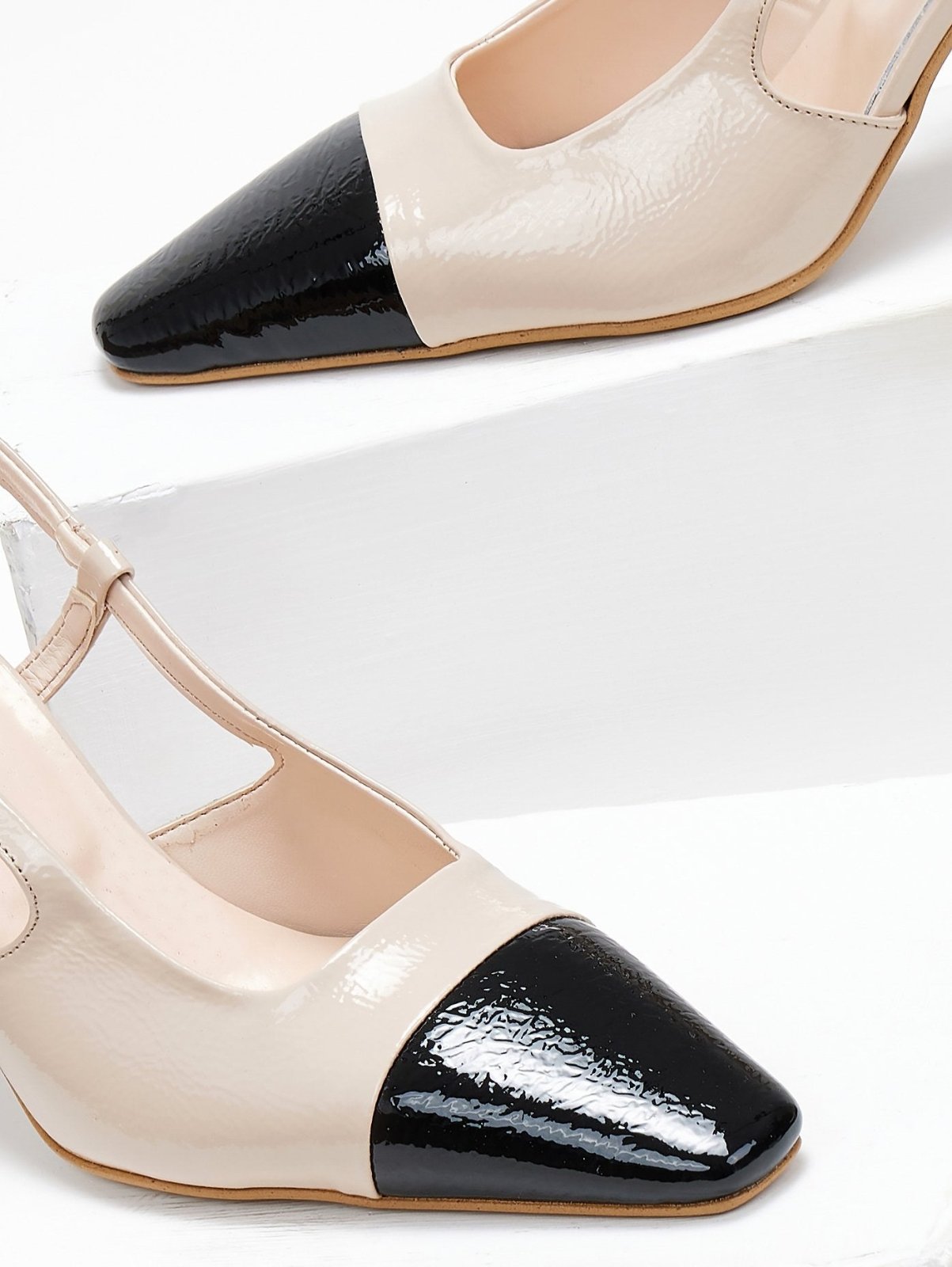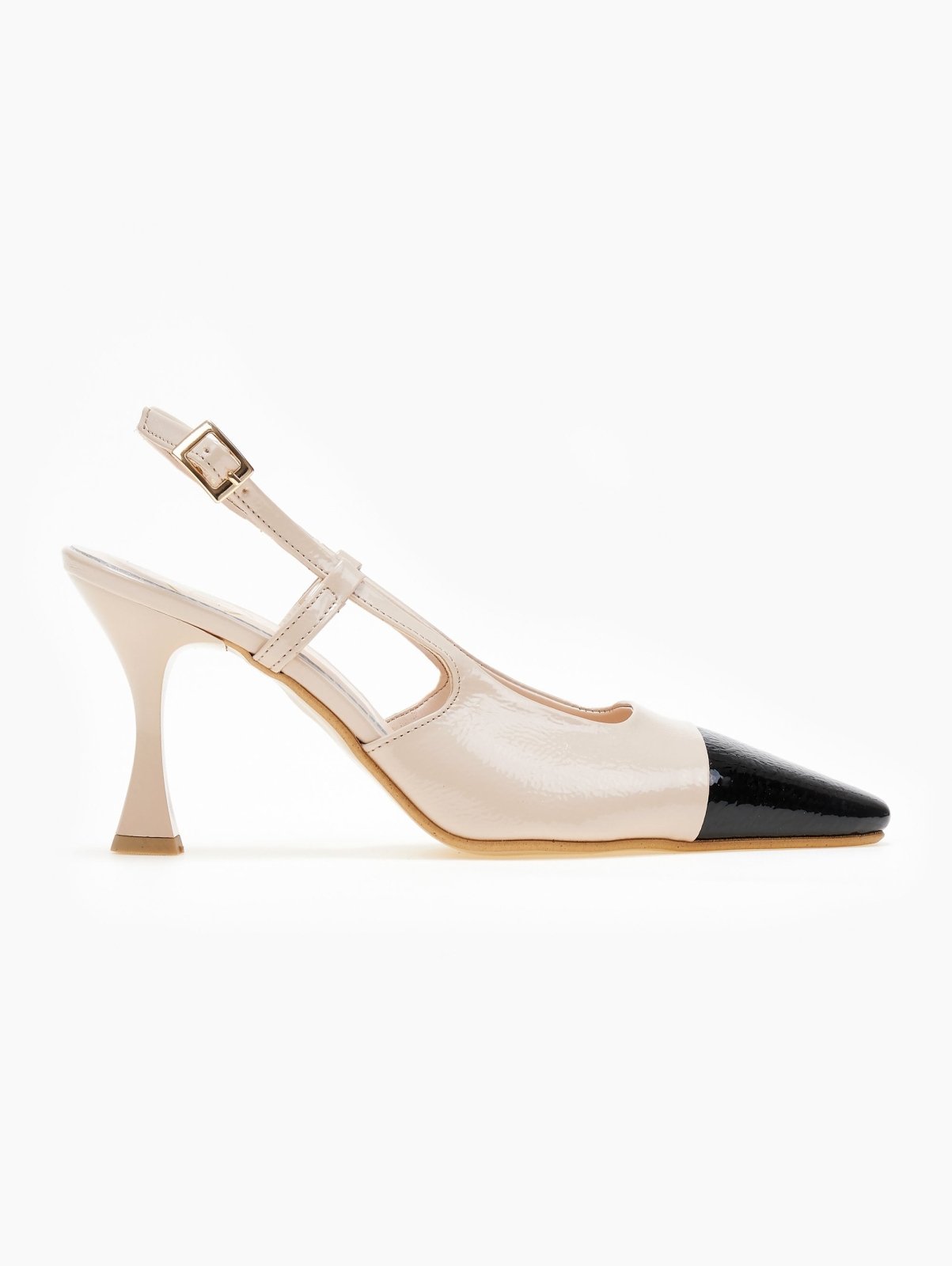 Γόβες λουστρίνι TFP. Έχουν ανοιχτή φτέρνα. Δένουν με λουράκι στο πλάι. Δερμάτινος πάτος. Ελληνικής κατασκευής.