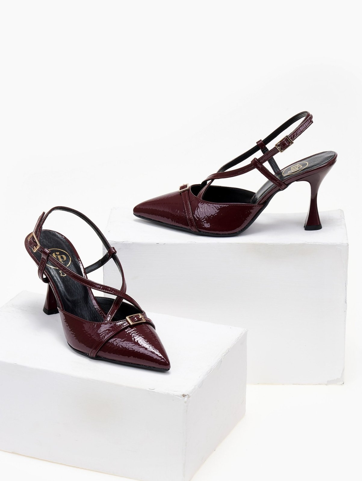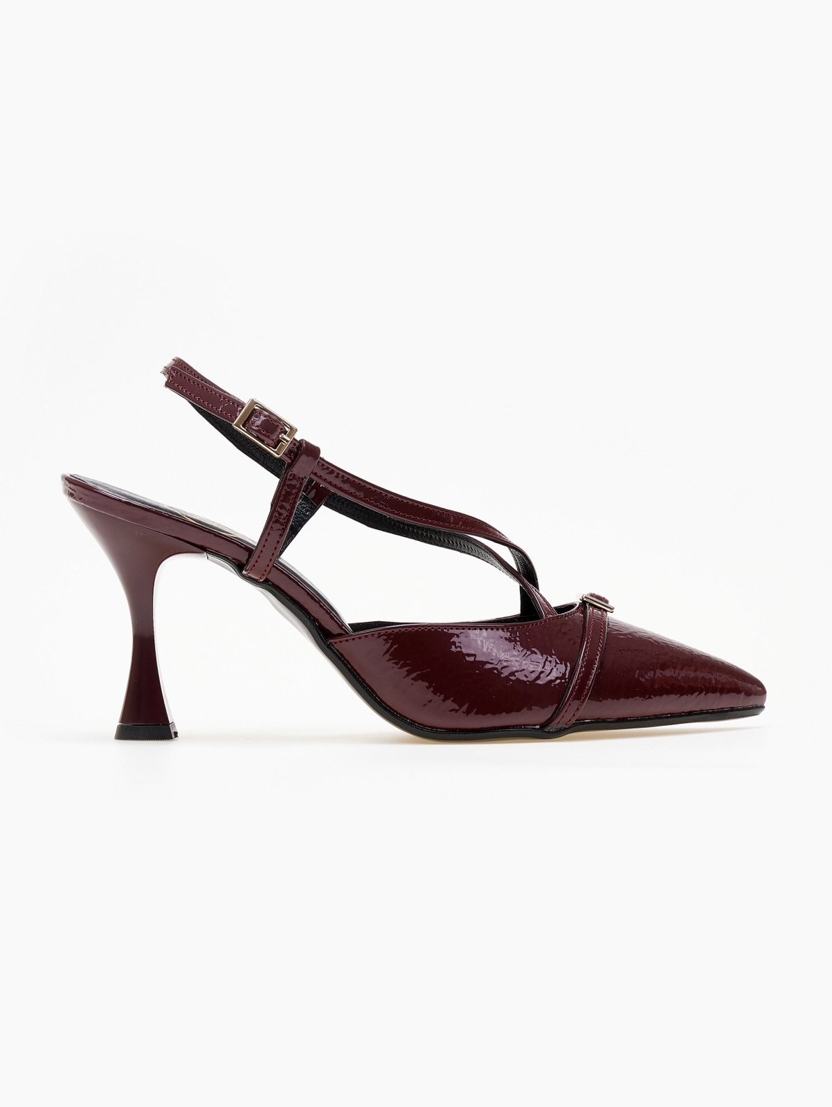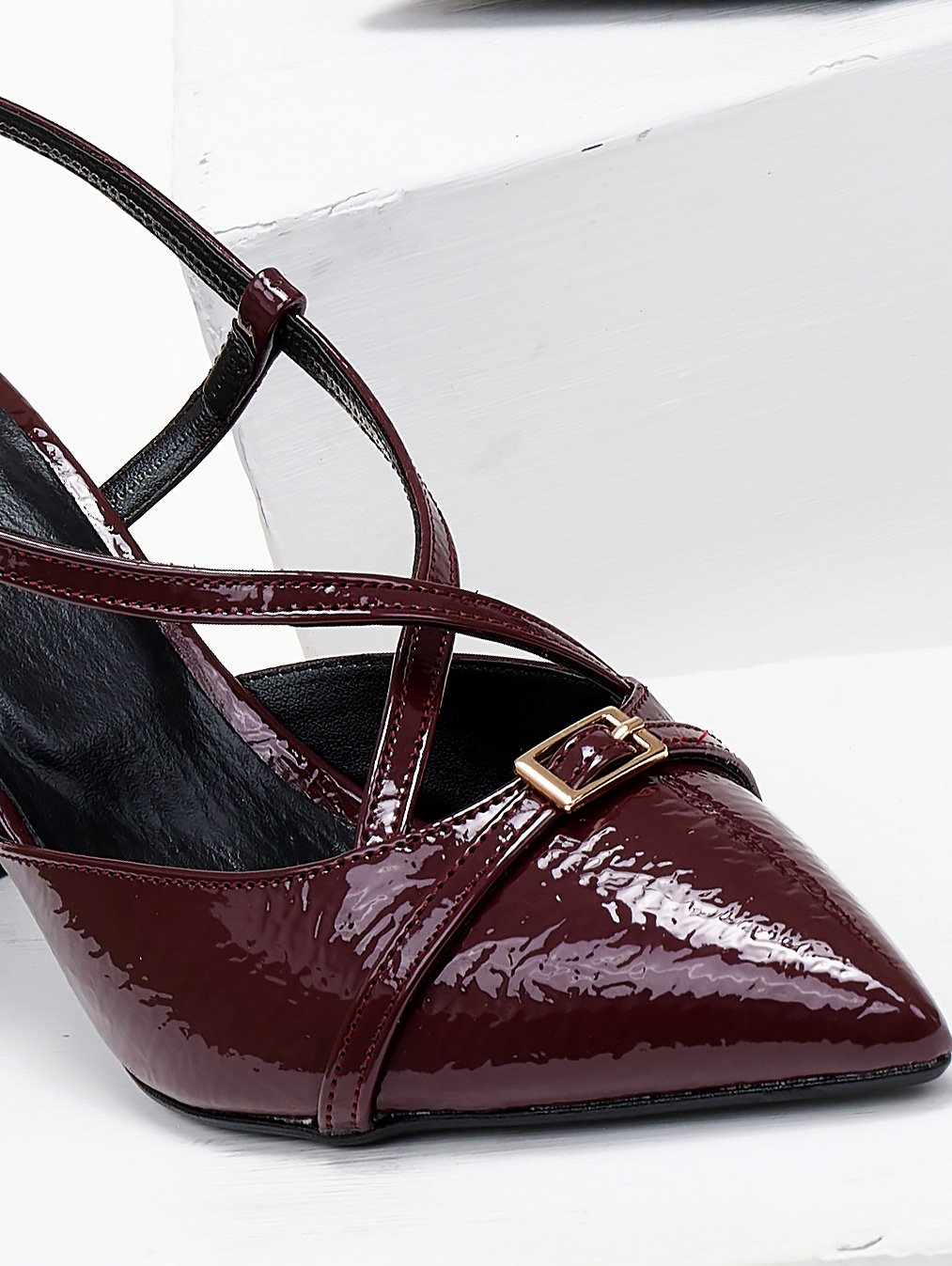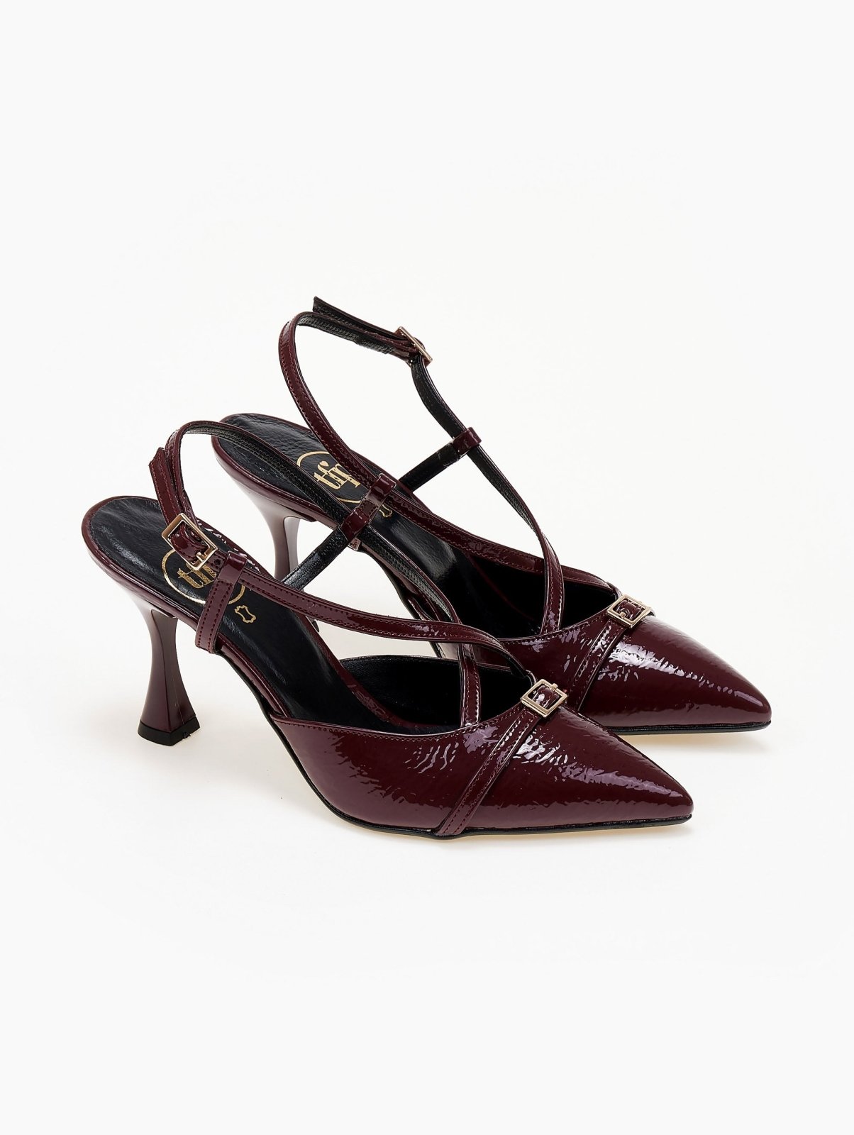 Γόβες slingback μυτερές λουστρίνι TFP. Μεταλλικό στοιχείο στο επάνω μέρος. Crossover λουράκια στο κουτεπιέ. Λεπτό τακούνι.
