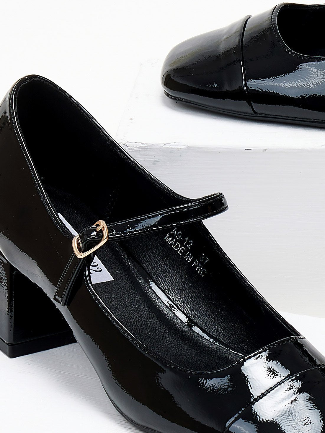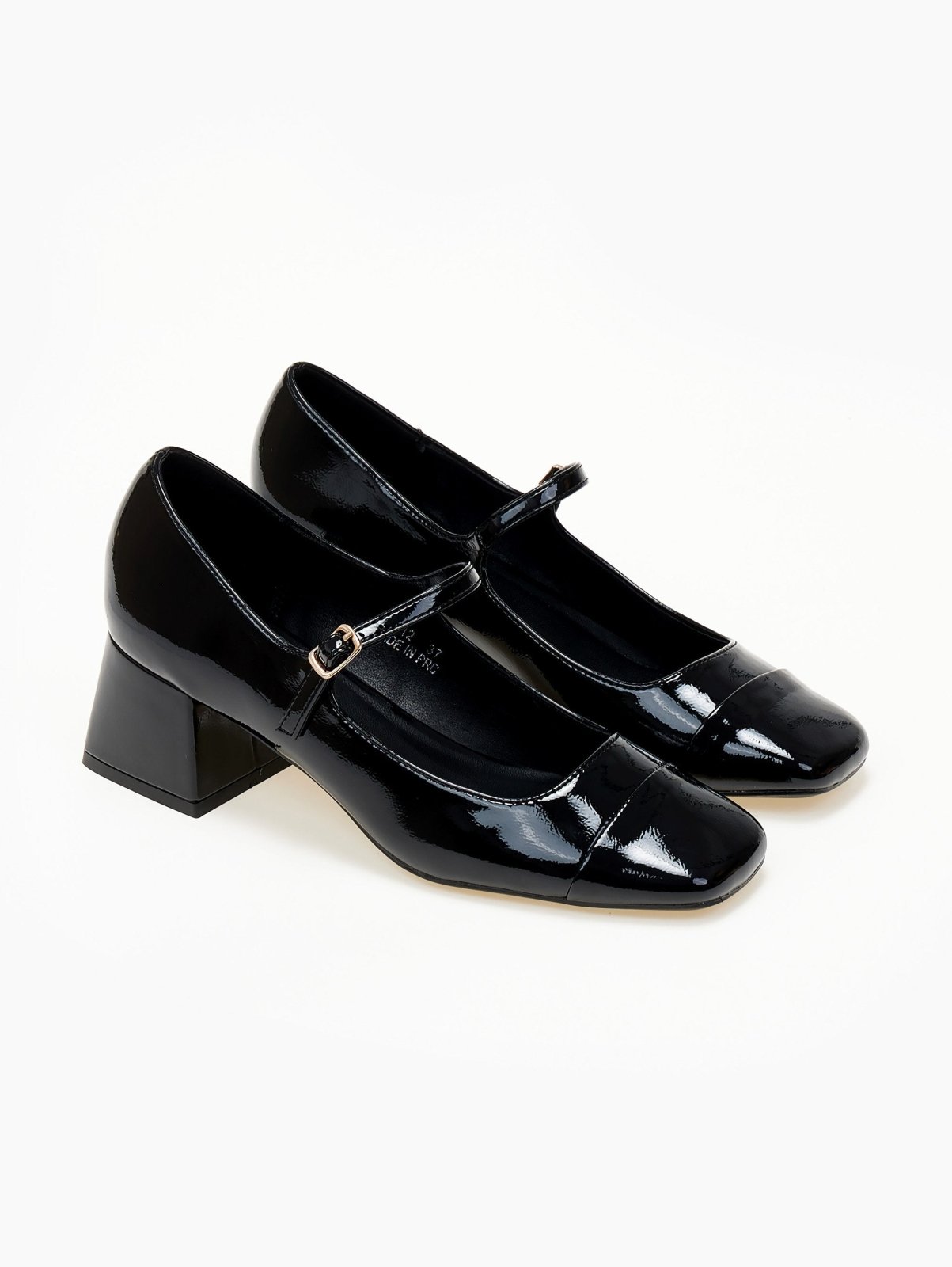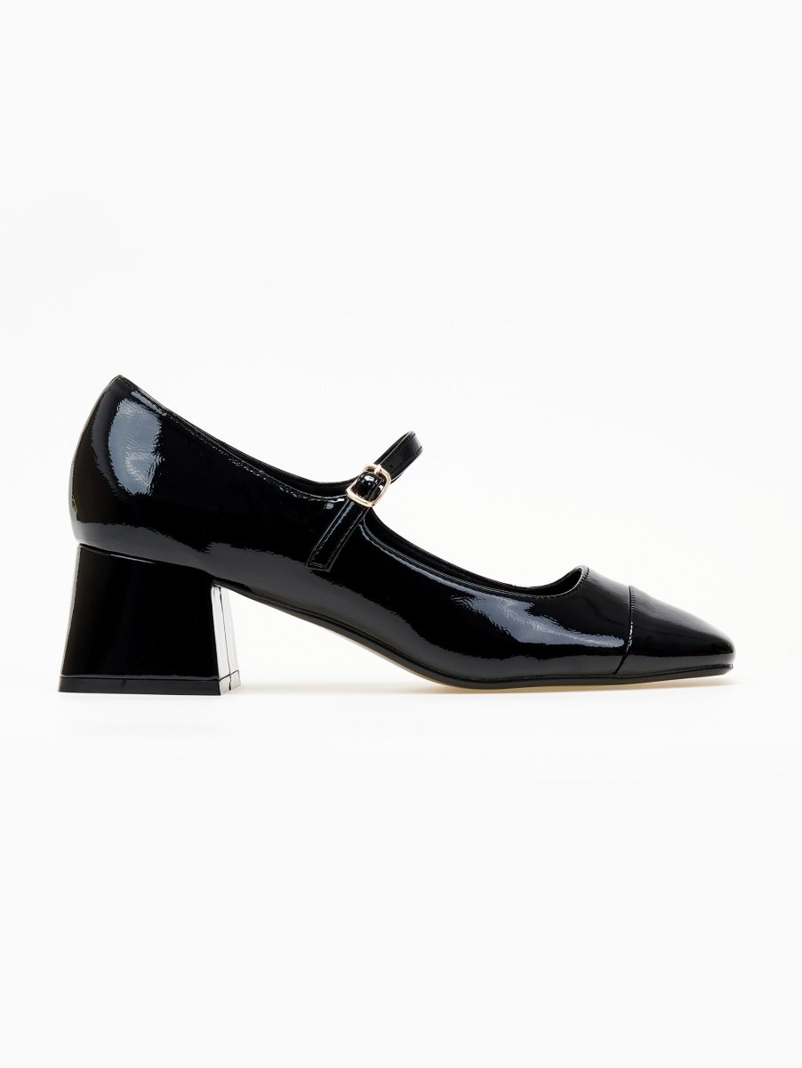 Γόβες Mary Janes λουστρίνι. Λεπτή μπαρέτα με λάστιχο για καλύτερη εφαρμογή. Χαμηλό τακούνι. Τετράγωνη γραμμή.