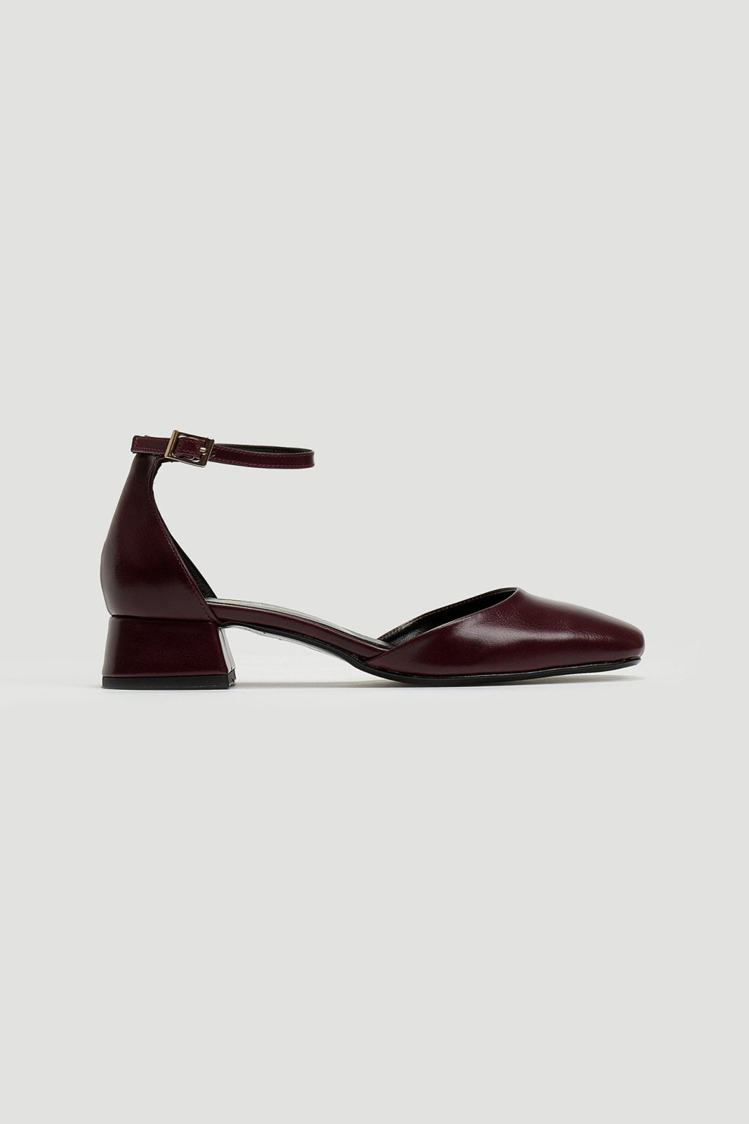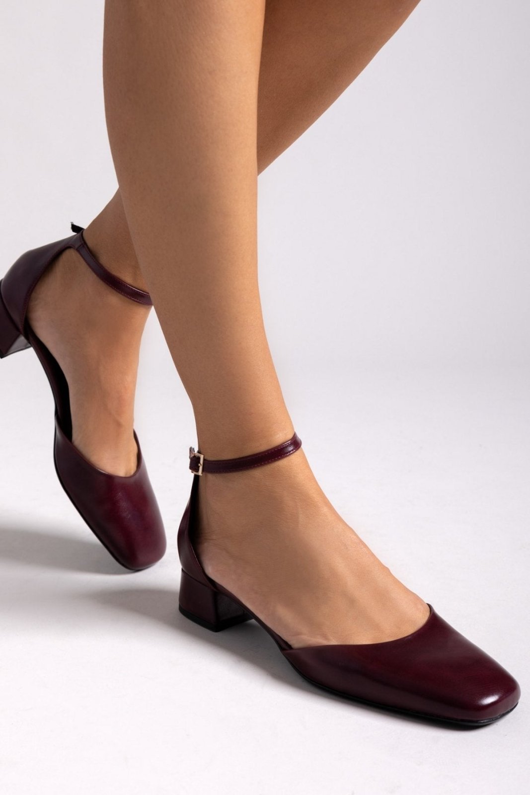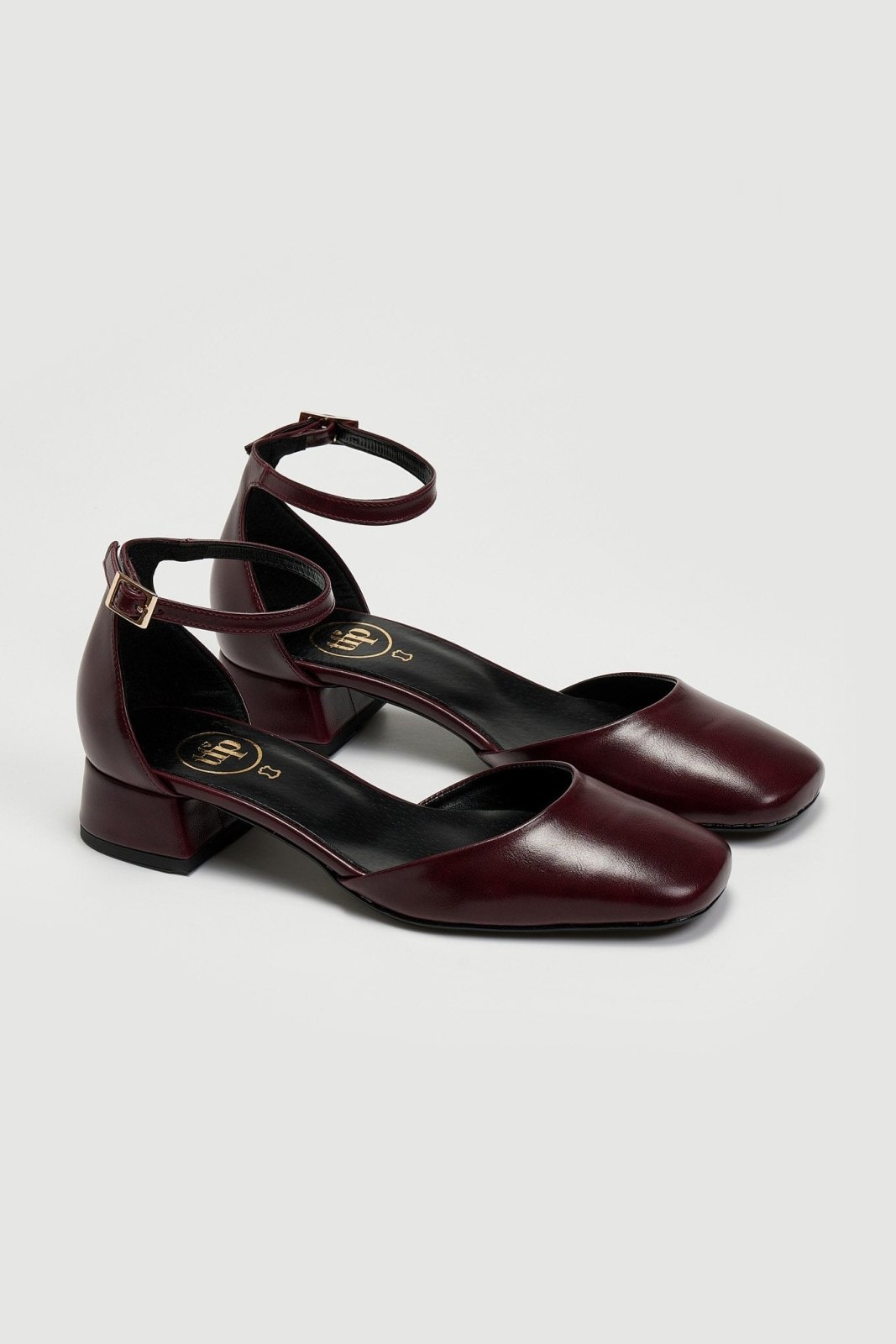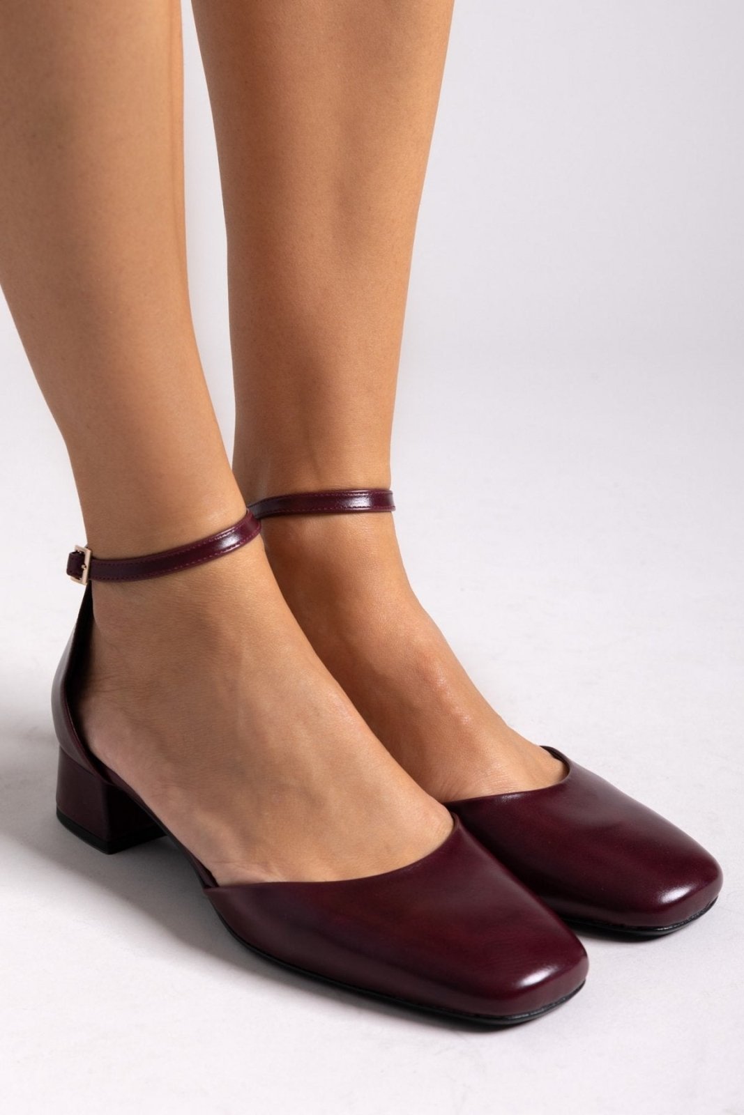 Γόβες με χαμηλό τετράγωνο τακούνι Tfp. Έχουν ανοιχτά πλαϊνά. Κλειστή φτέρνα. Δένουν με μπαρέτα στο ύψος του αστραγάλου. Δερμάτινος πάτος. Ελληνικής κατασκευής.