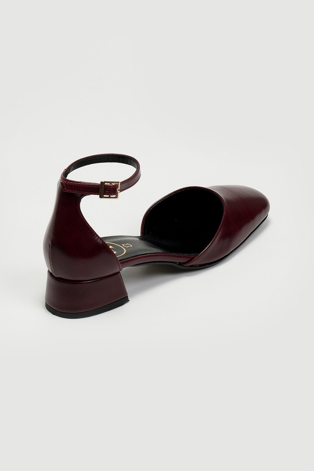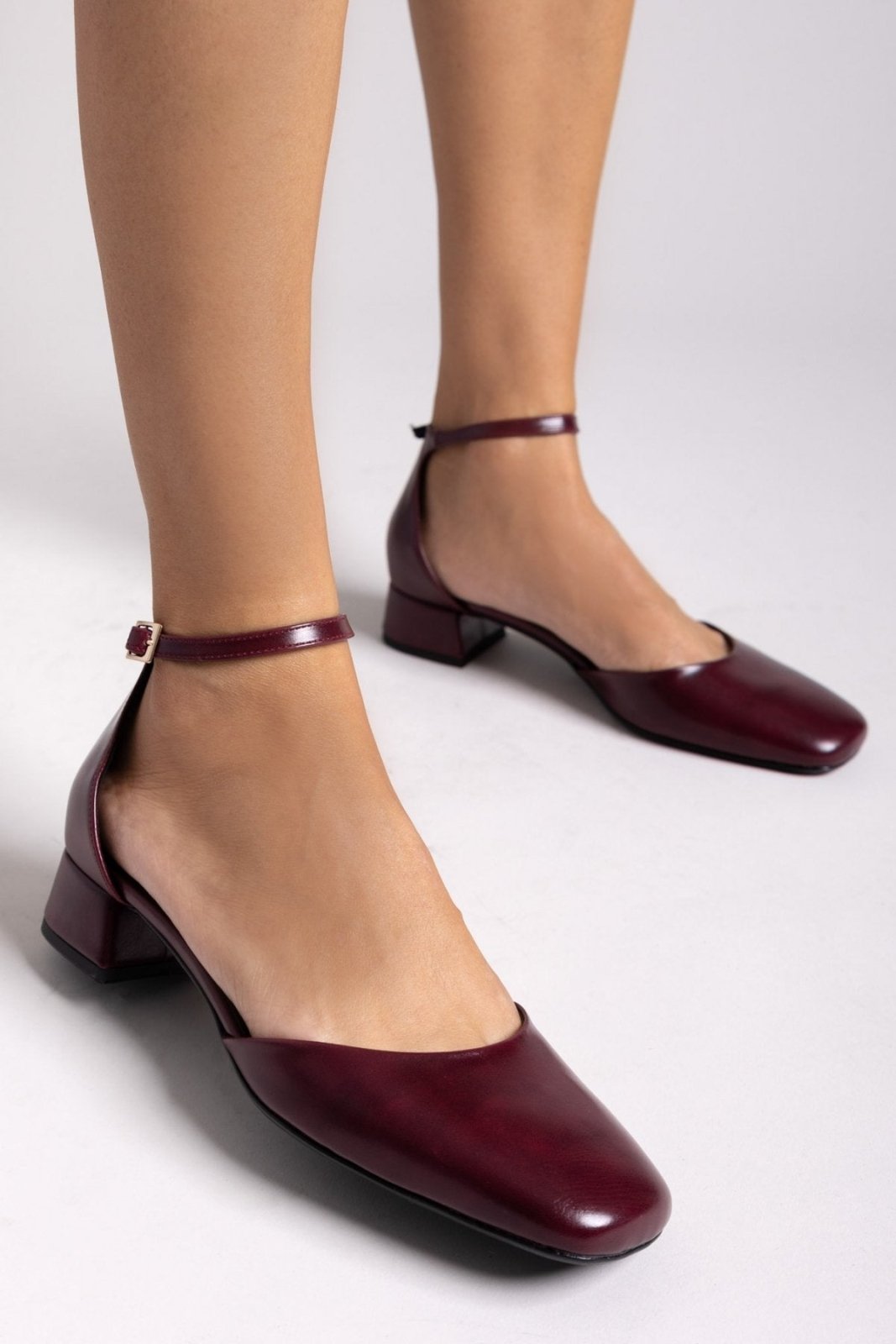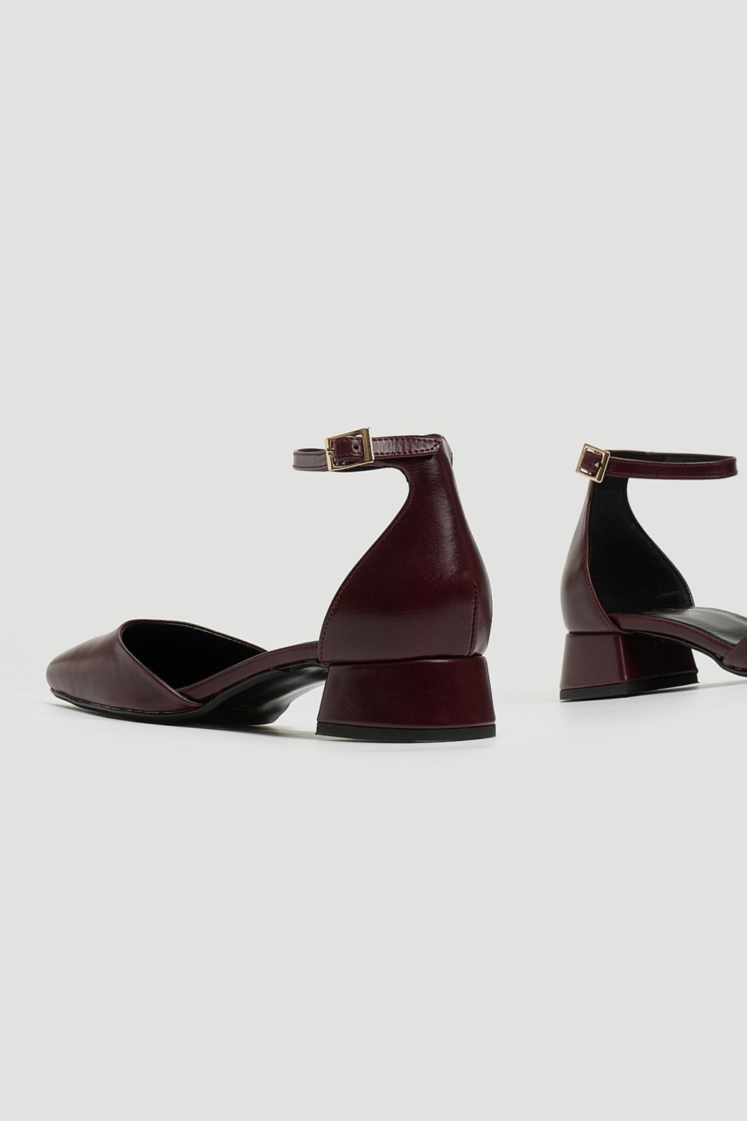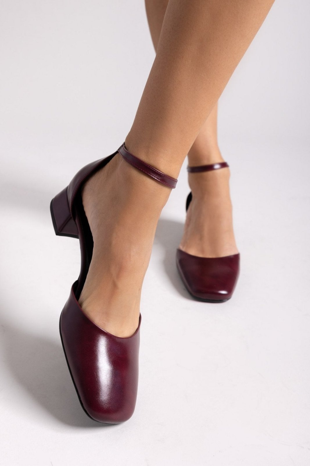 Γόβες με χαμηλό τετράγωνο τακούνι Tfp. Έχουν ανοιχτά πλαϊνά. Κλειστή φτέρνα. Δένουν με μπαρέτα στο ύψος του αστραγάλου. Δερμάτινος πάτος. Ελληνικής κατασκευής.