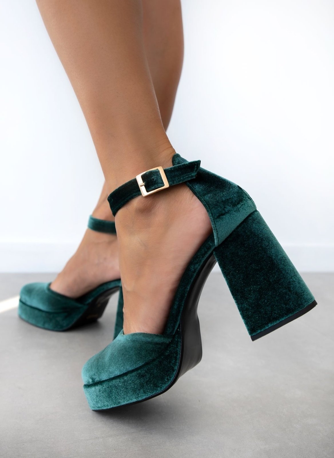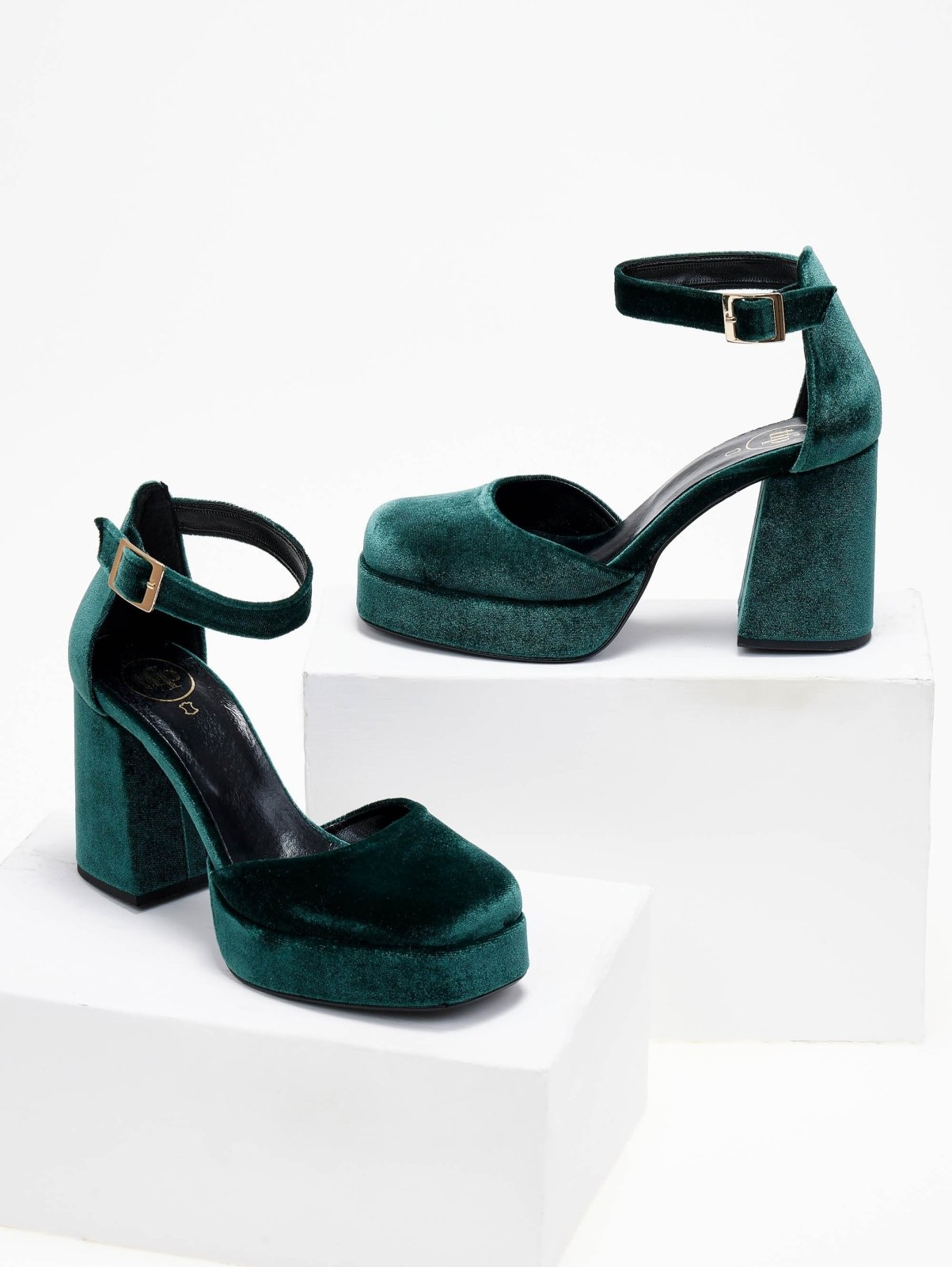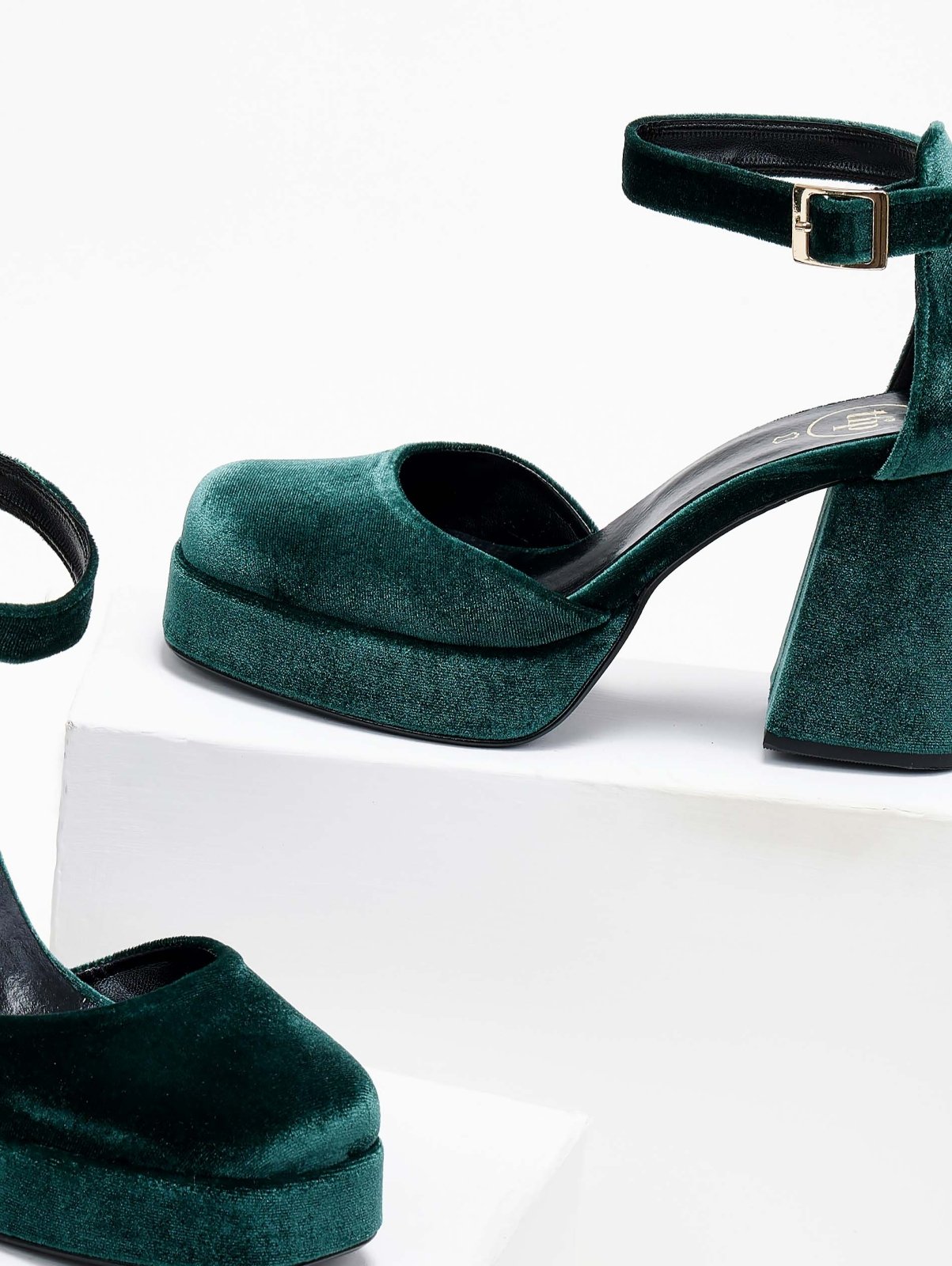 Γόβες velvet TFP. Έχουν φιάπα και ψηλό χοντρό τακούνι. Ανοιχτά πλαίνά. Κλειστή φτέρνα. Δένουν με μπαρέτα στο ύψος του αστραγάλου. Δερμάτνος πάτος. Ελληνικής κατασκευής.