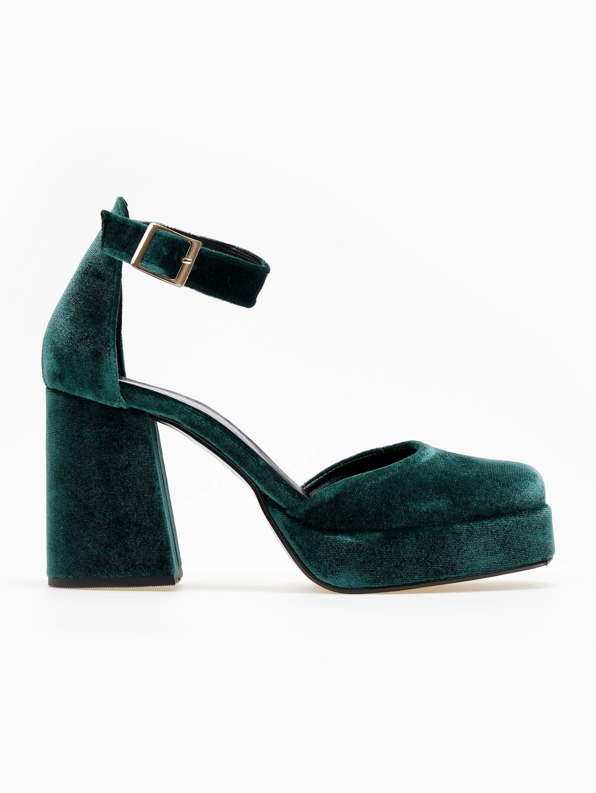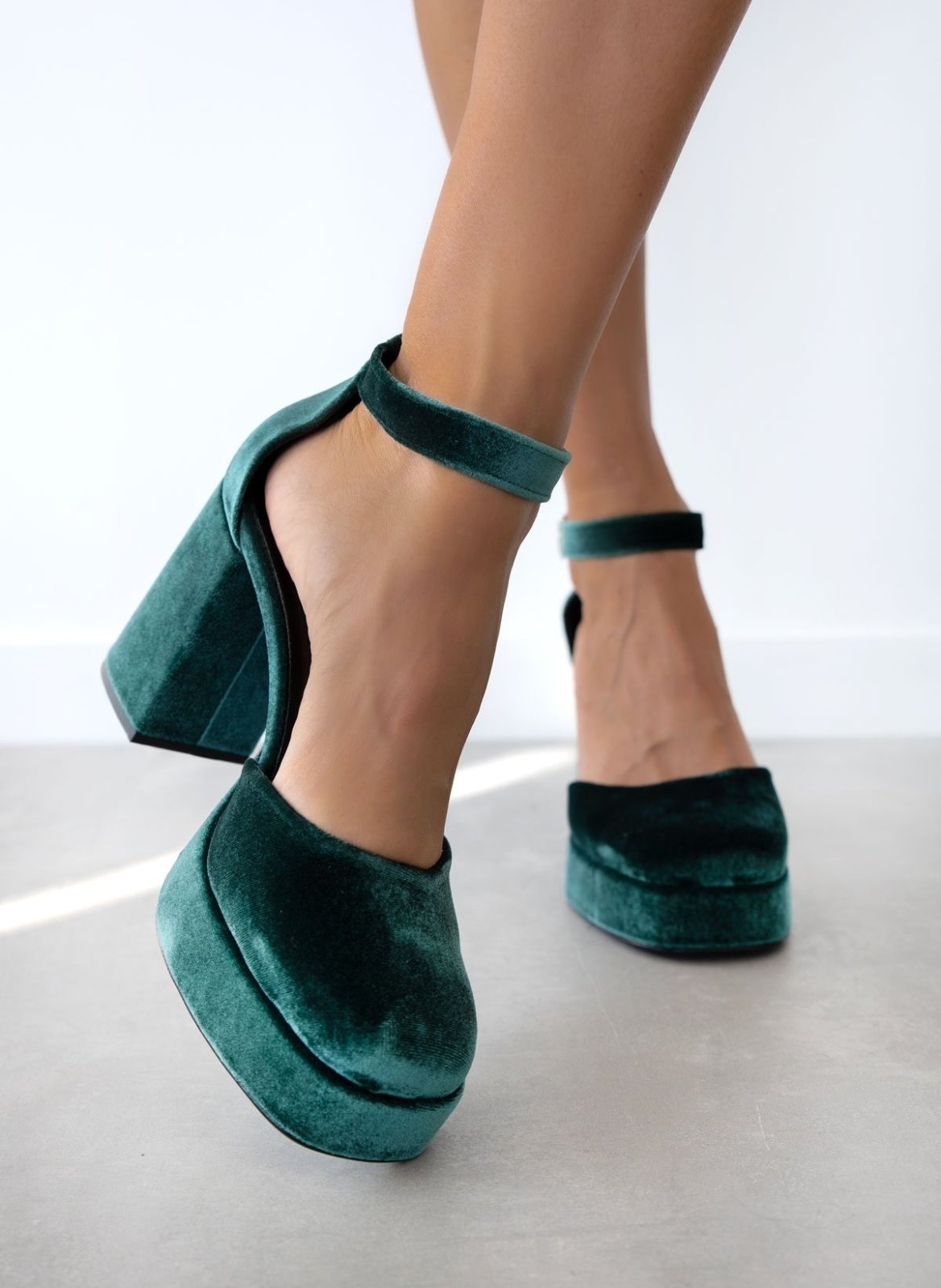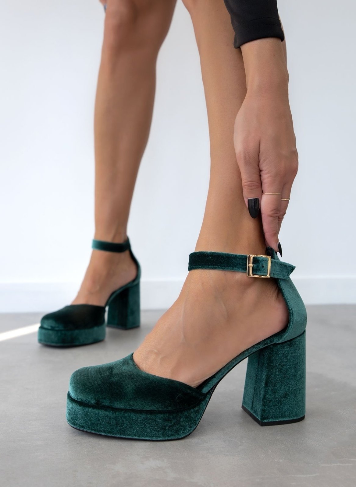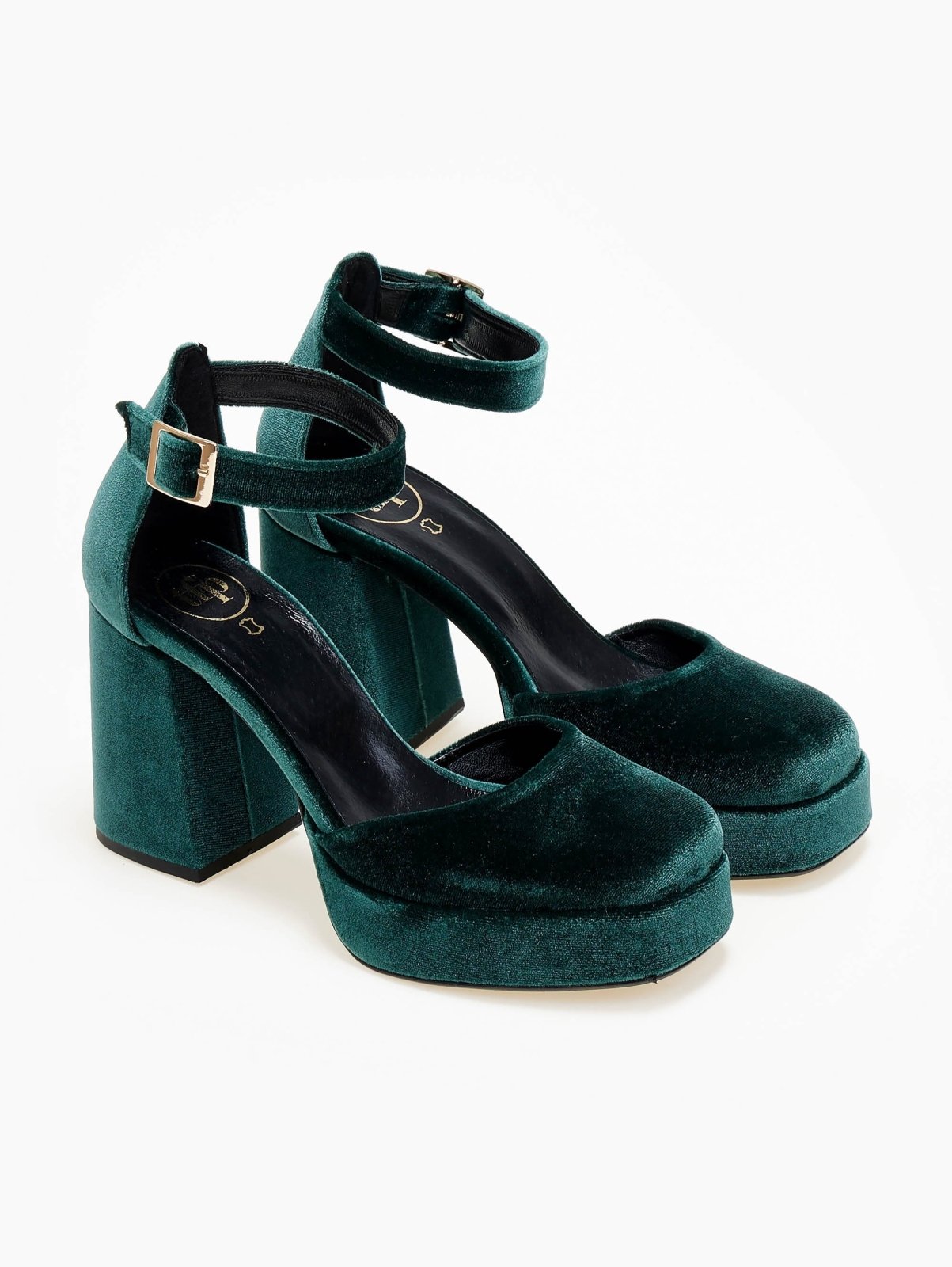 Γόβες velvet TFP. Έχουν φιάπα και ψηλό χοντρό τακούνι. Ανοιχτά πλαίνά. Κλειστή φτέρνα. Δένουν με μπαρέτα στο ύψος του αστραγάλου. Δερμάτνος πάτος. Ελληνικής κατασκευής.
