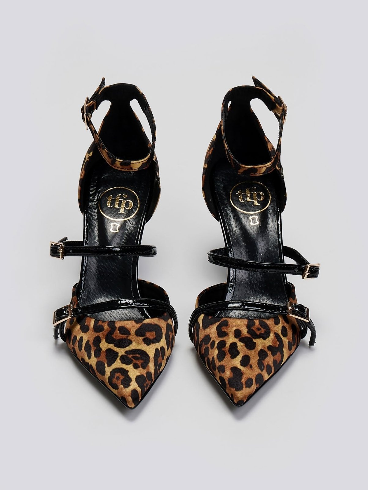 Γόβες μυτερές σατέν με animal print TFP. Έχουν ανοιχτά πλαϊνά. Λουστρίνι λουράκια στο ύψος του κουτεπιέ. Κλειστή φτέρνα. Δένουν με μπαρέτα στο ύψος του αστραγάλου. Δερμάτινος πάτος. Ελληνικής κατασκευής.