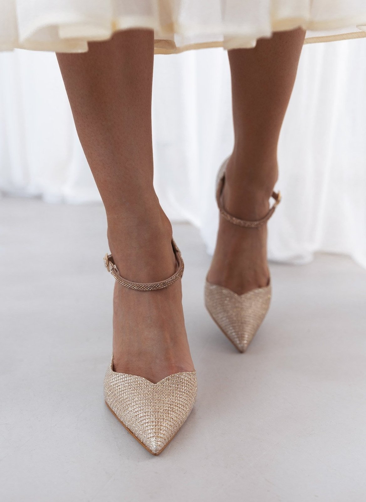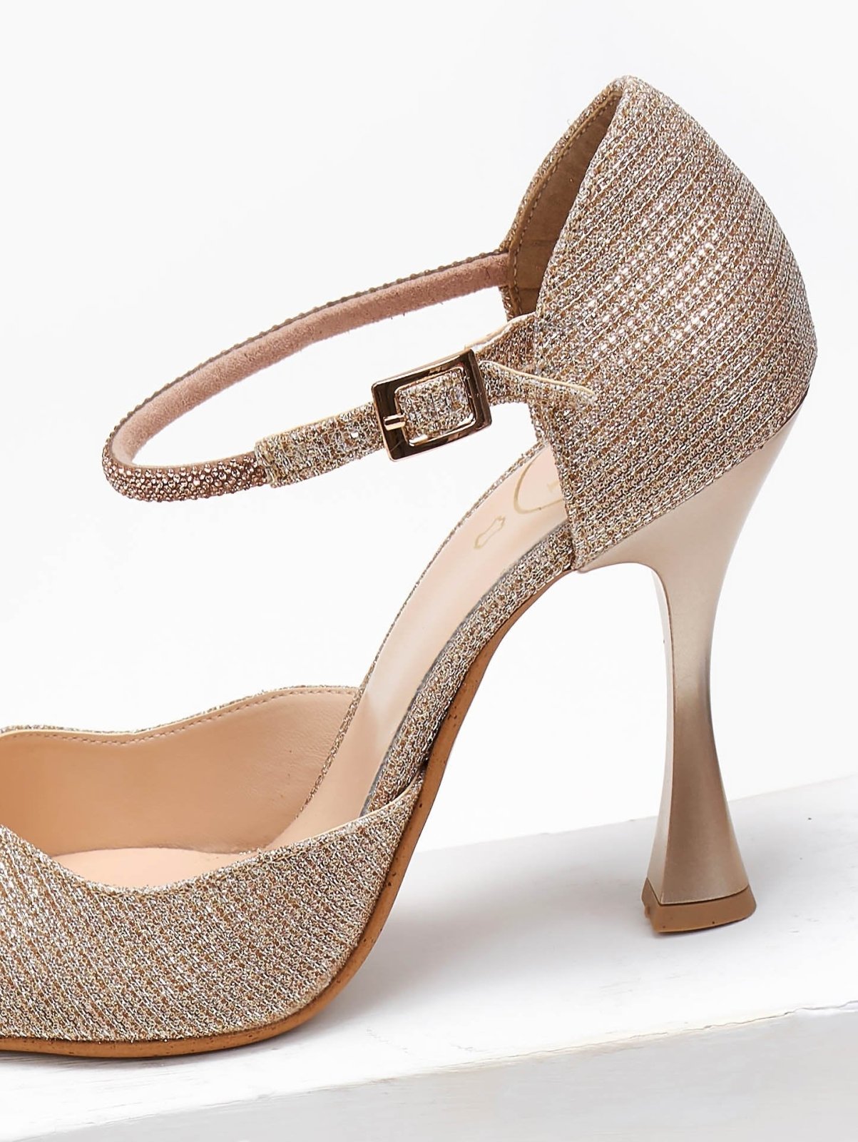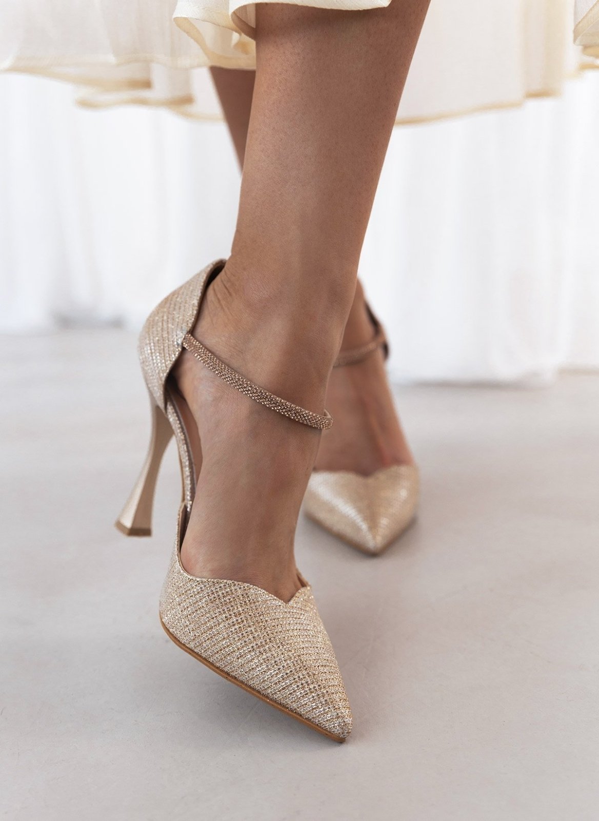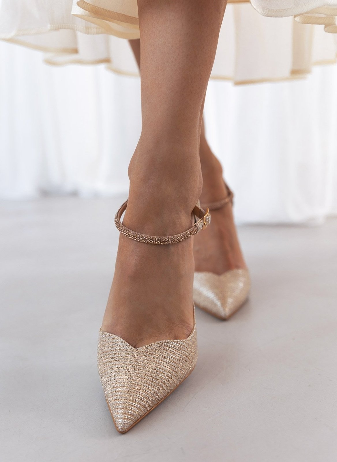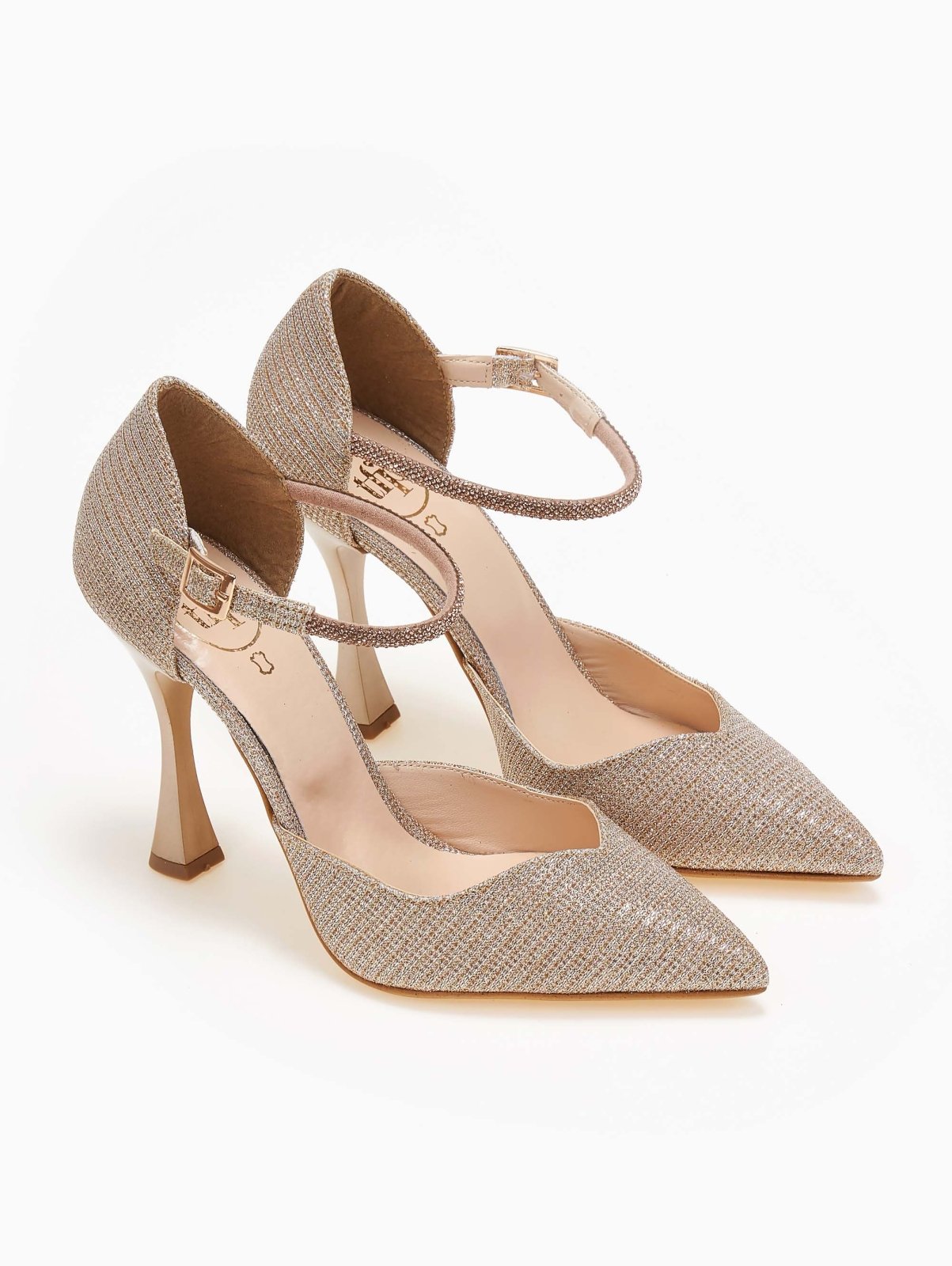 Γόβες μυτερές από γυαλιστερό ύφασμα TFP. Έχουν ανοιχτά πλαϊνά. Κλειστή φτέρνα. Δένουν με στρας μπαρέτα στο ύψος του αστραγάλου. Δερμάτινος πάτος . Ελληνικής κατασκευής.