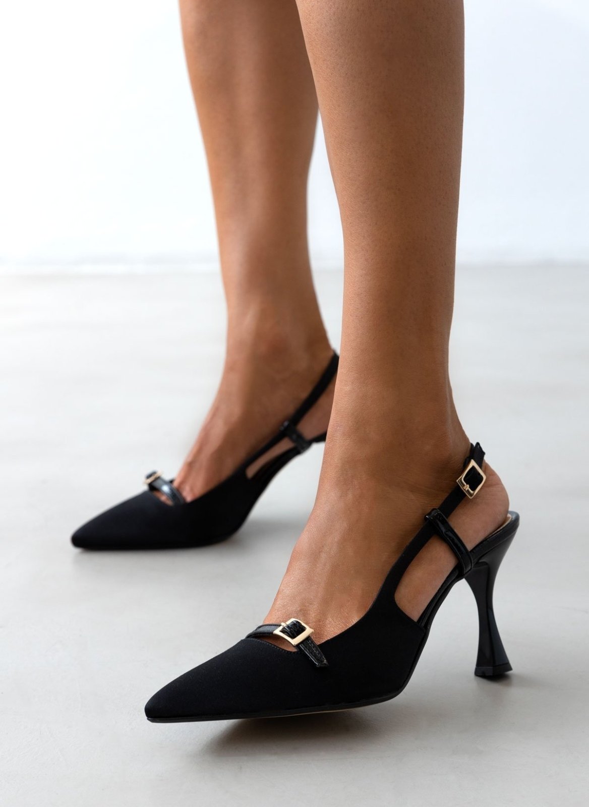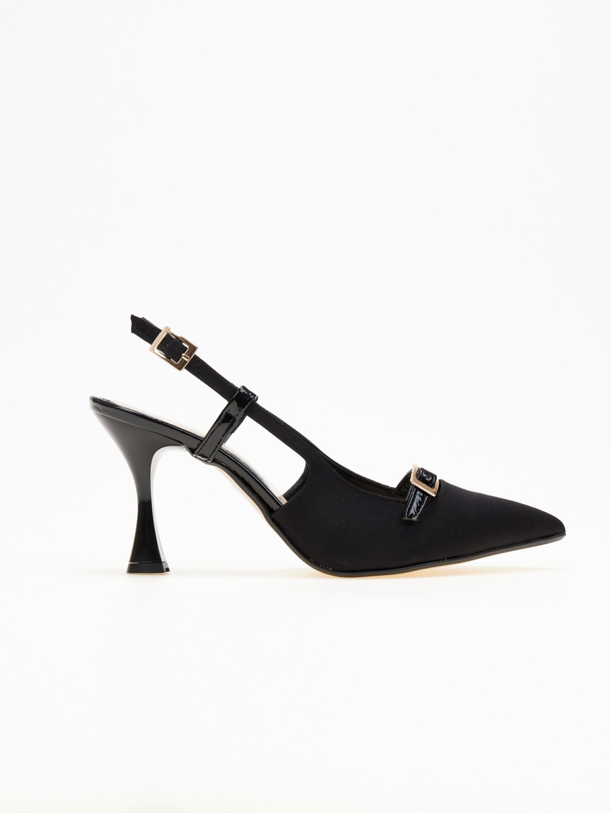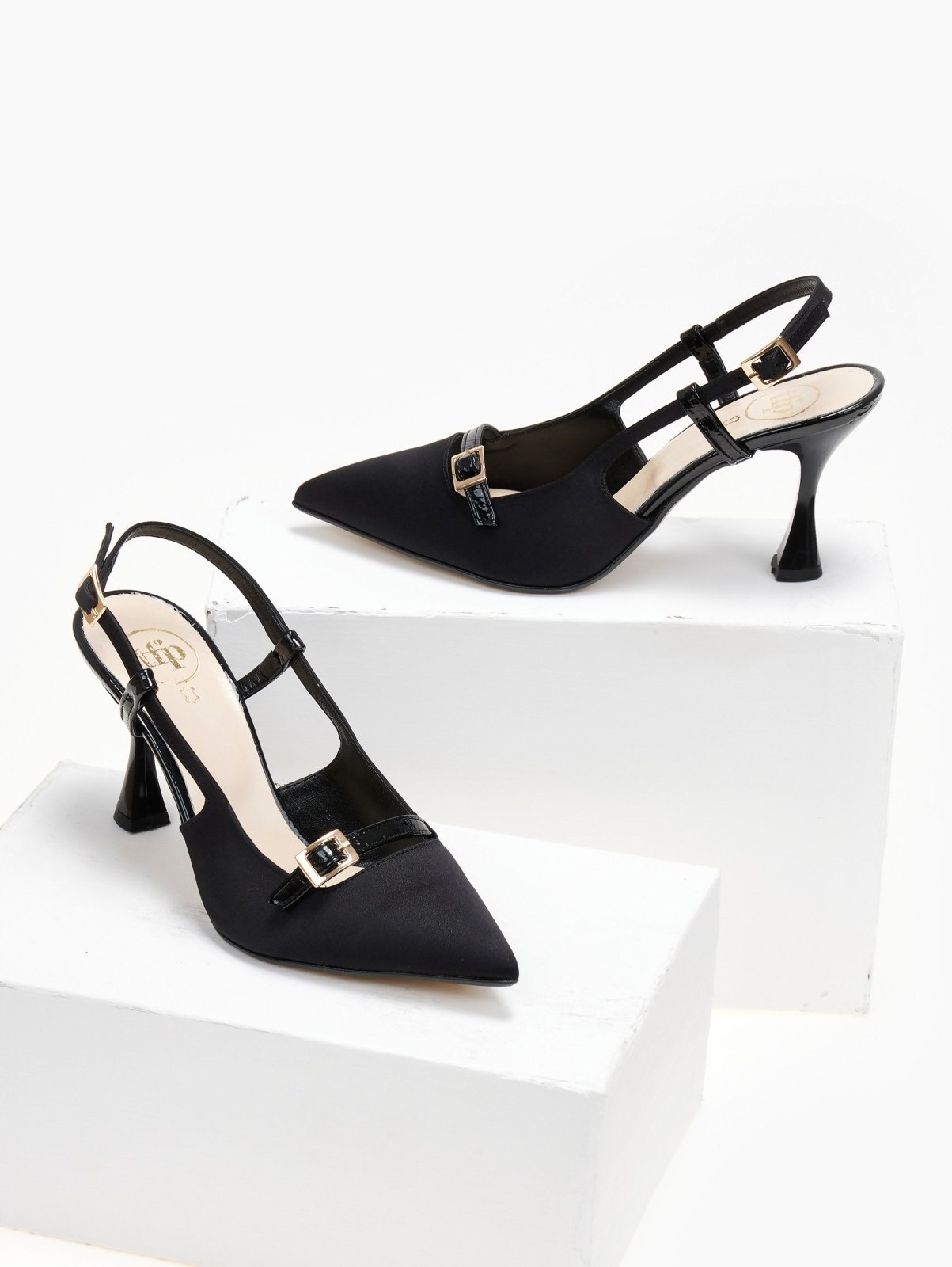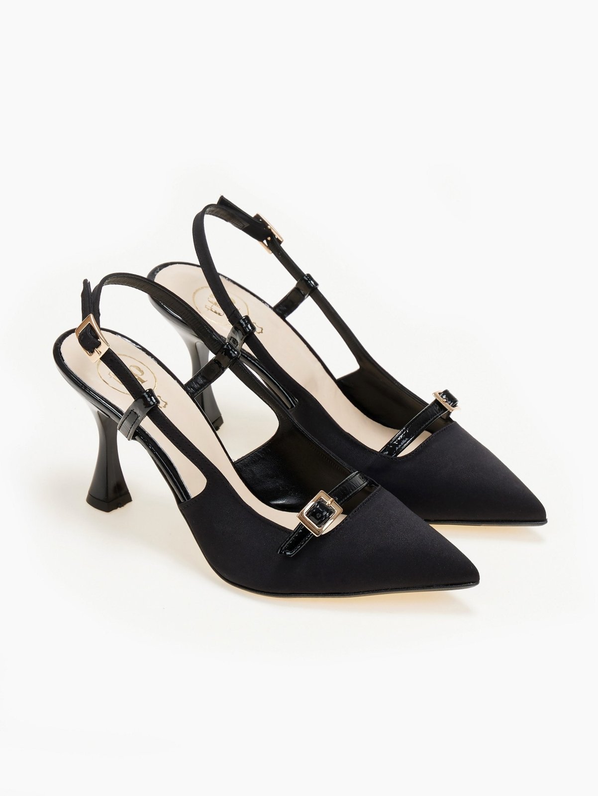 Γόβες σατέν μυτερές TFP. Ανοιχτή φτέρνα με δέσιμο στο πλάι. Διακριτικό άνοιγμα με λουράκι λουστρίνι στα δάκτυλα. Δερμάτινος πάτος. Ελληνικής κατασκευής.