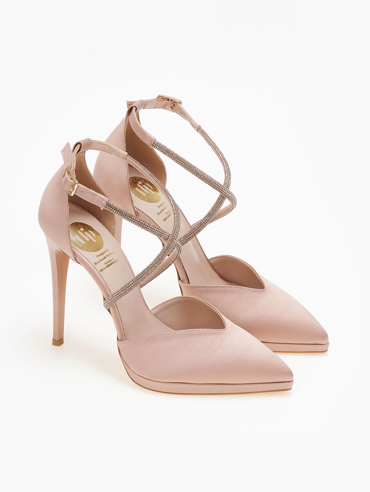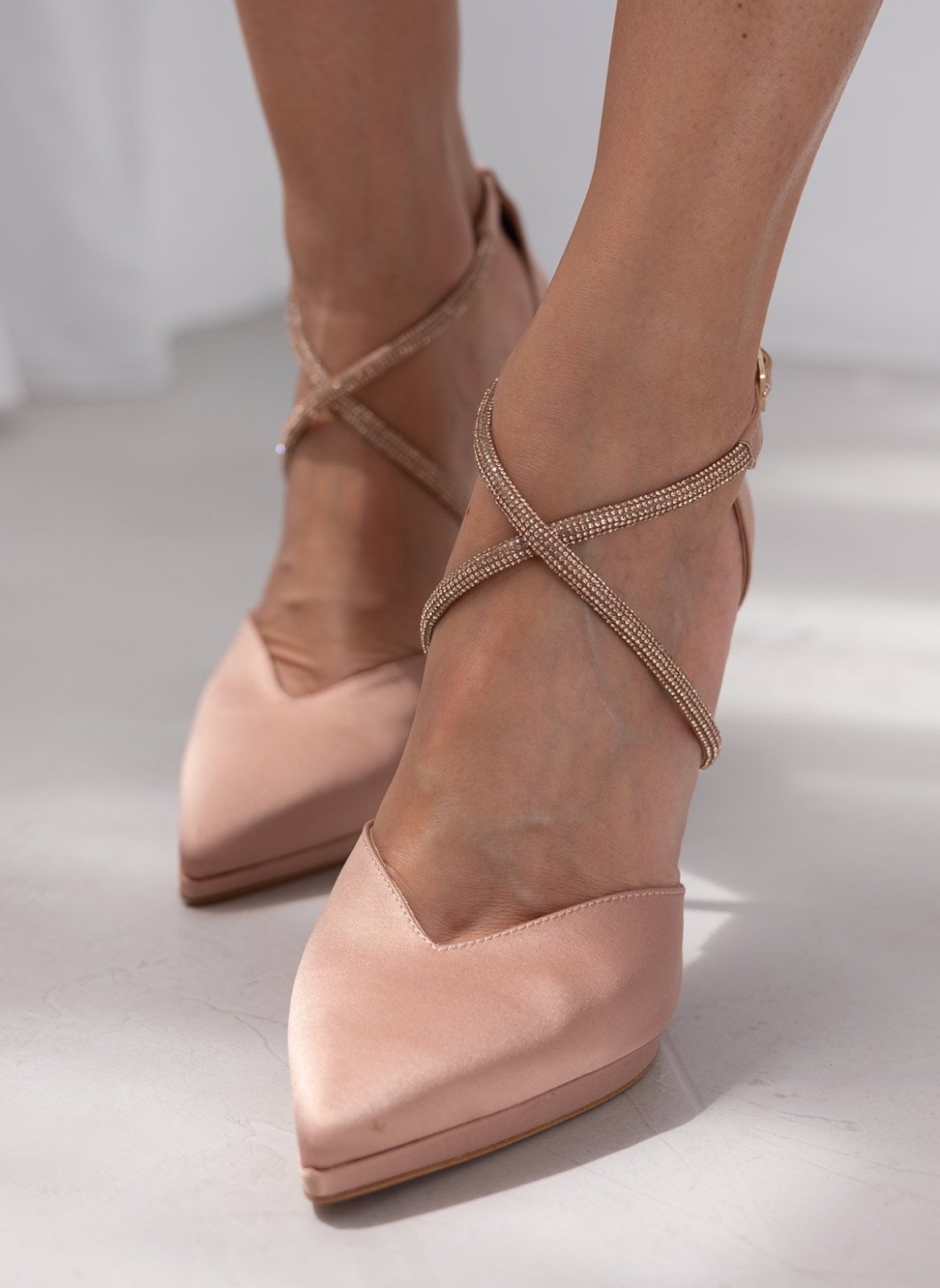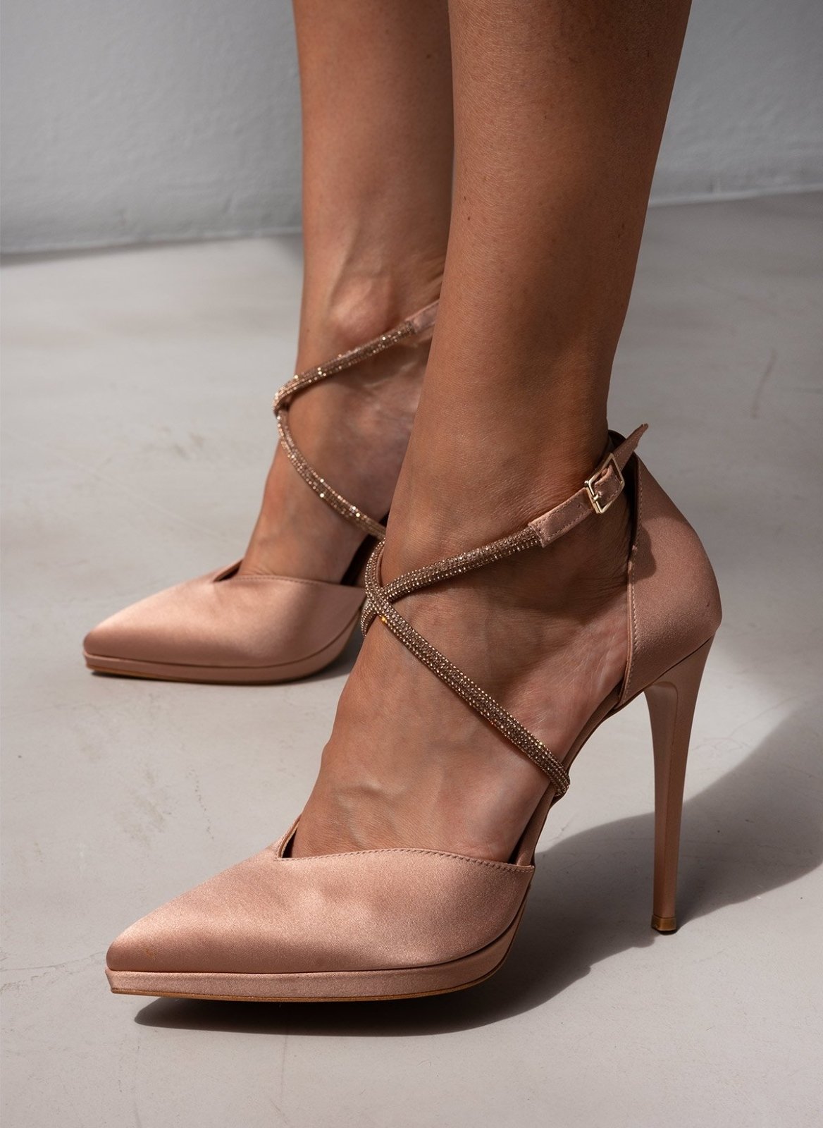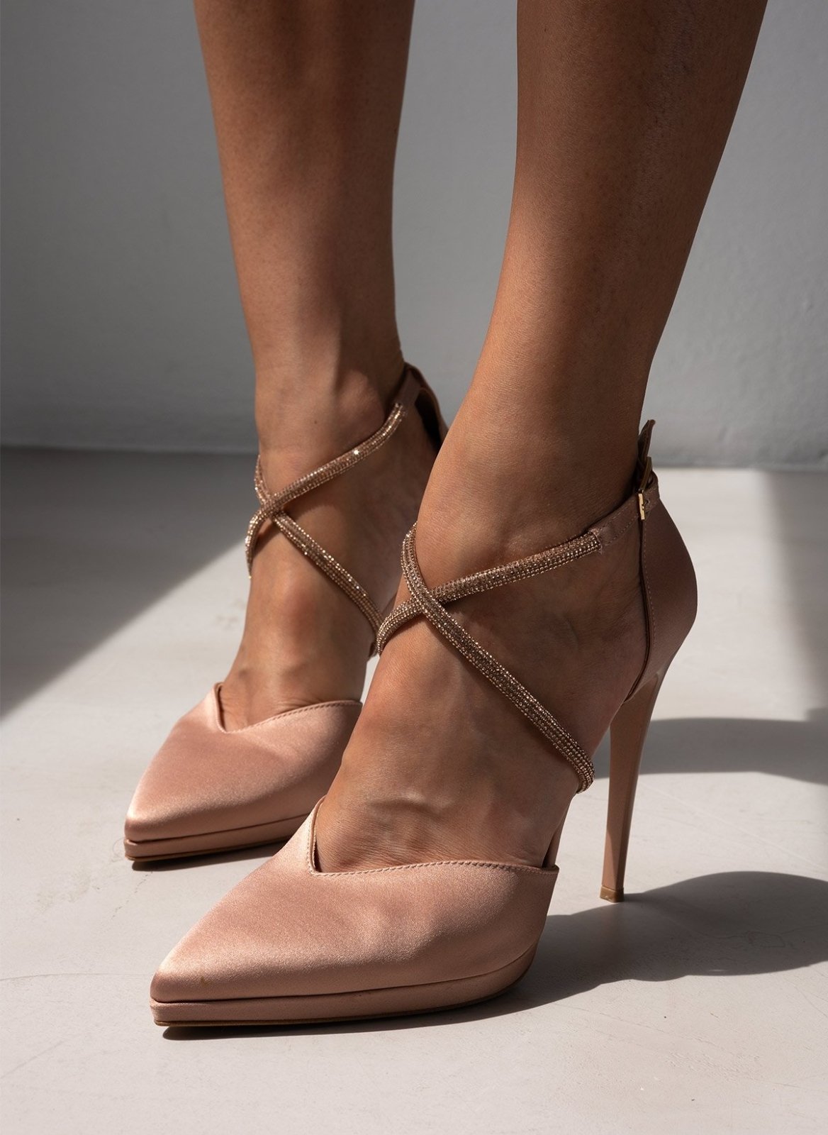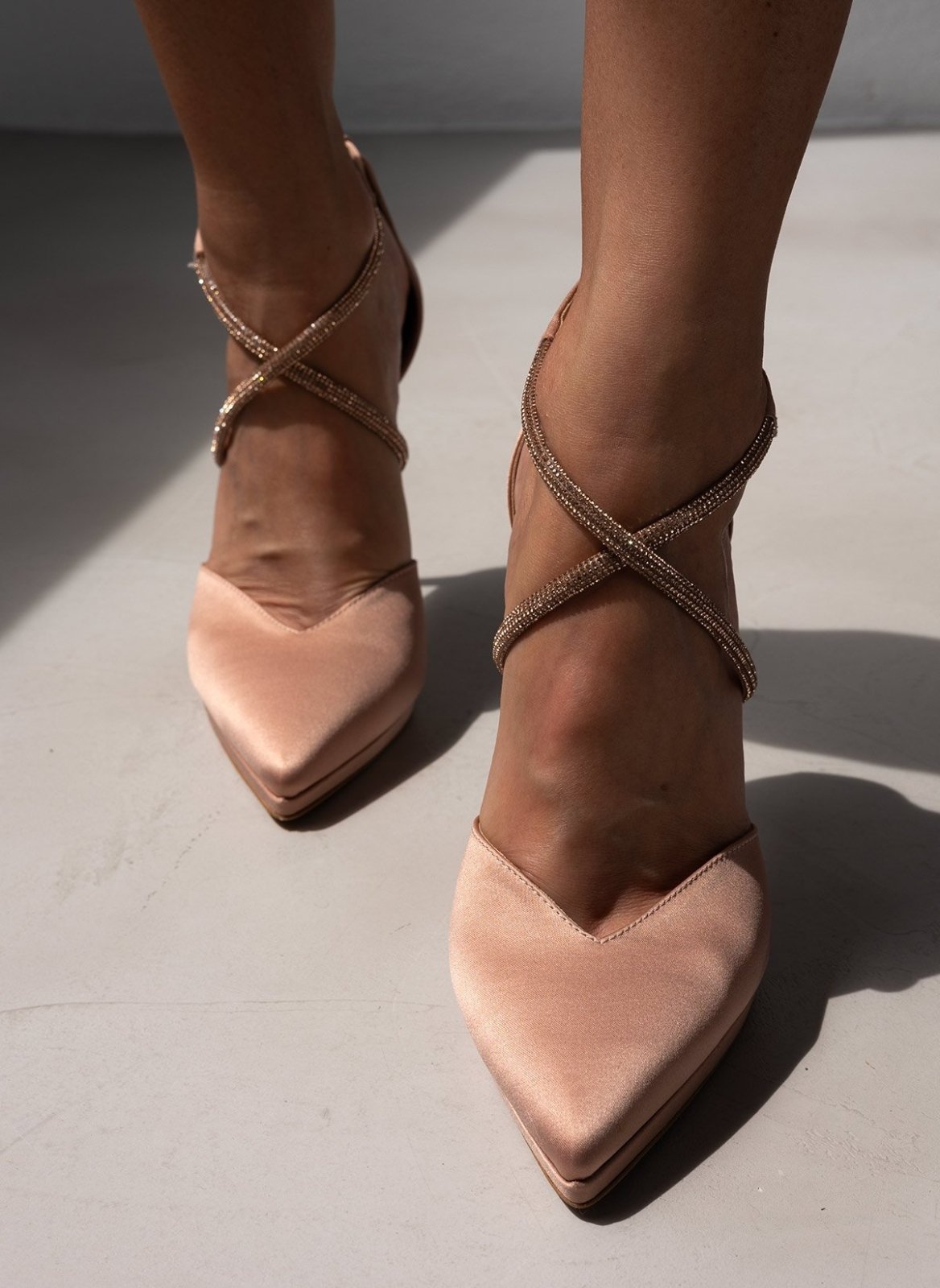 Γόβες μυτερές σατέν TFP. Έχουν v cut άνοιγμα στα δάκτυλα. Crossover στρας λουράκια στο κουτεπιέ. Κλειστή φτέρνα. Λεπτή φιάπα με ψηλό τακούνι. Ελληνικής κατασκευής.