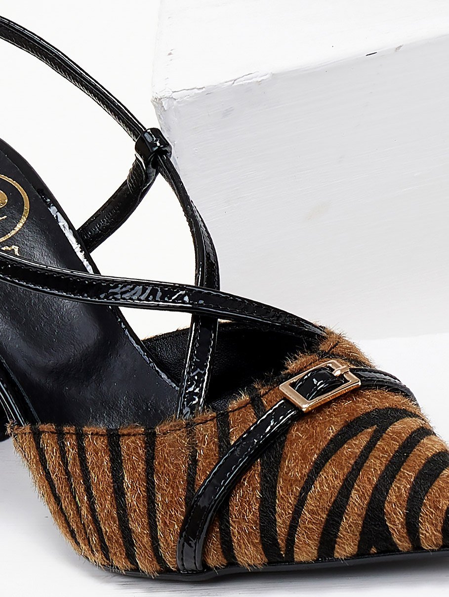 Γόβες slingback με συνθετικό ponyskin TFP. Μυτερή φόρμα με crossover λουστρίνι λουράκια στο κουτεπιέ. Δερμάτινος πάτος. Ελληνικής κατασκευής.