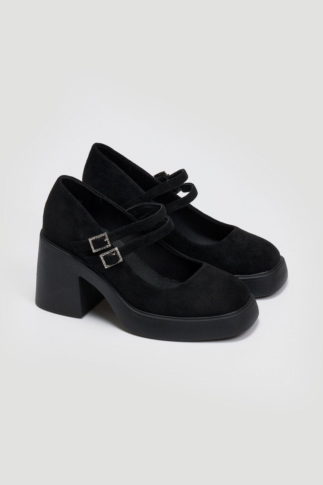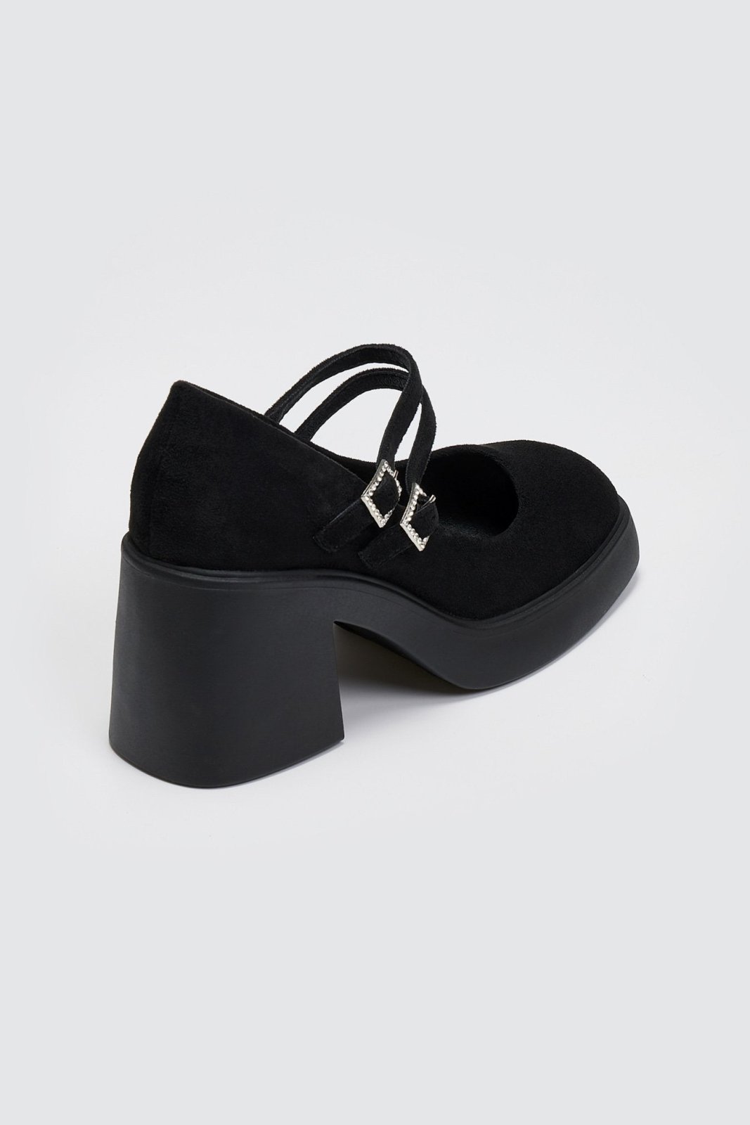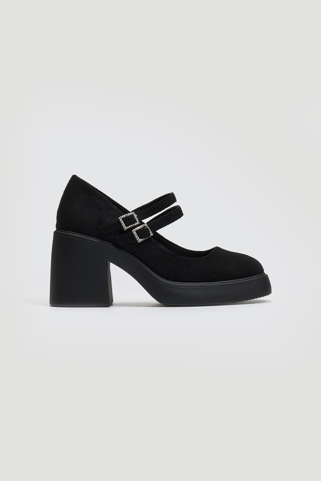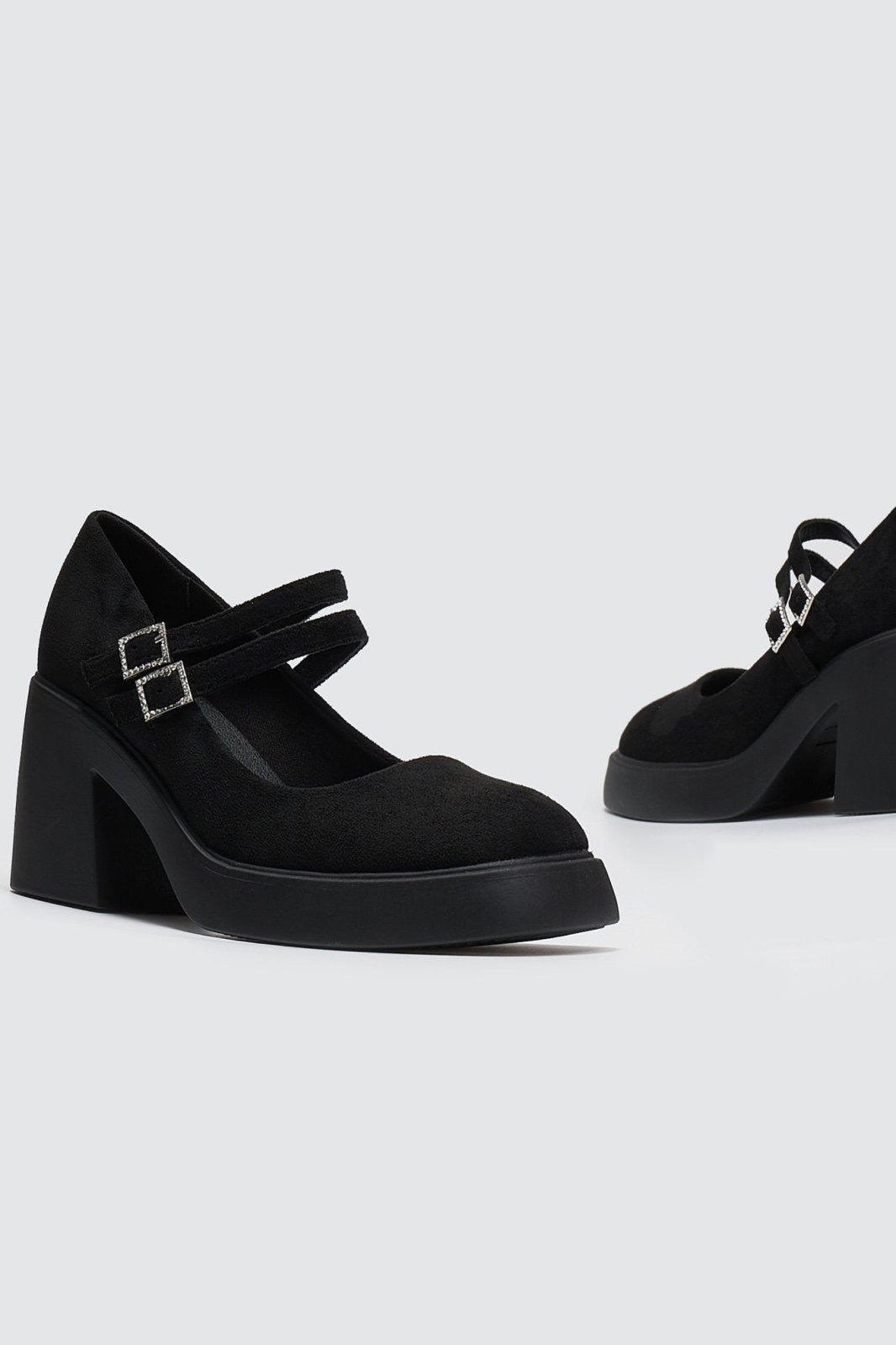 Γόβες suede Mary Janes. Διπλή μπαρέτα με στρας στους τοκάδες. Ψηλό χοντρό τακούνι.