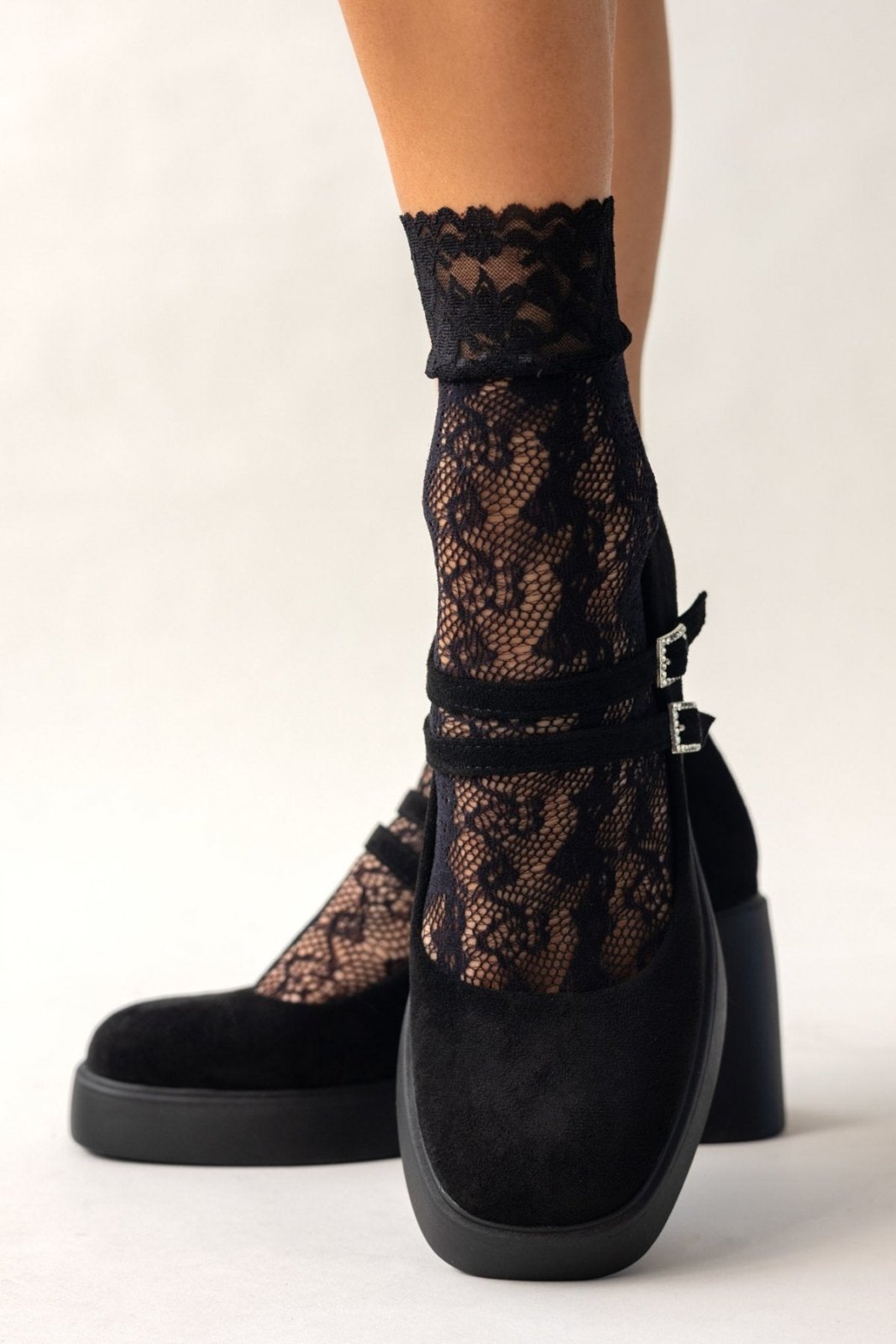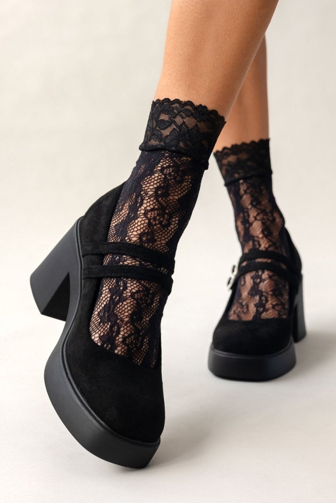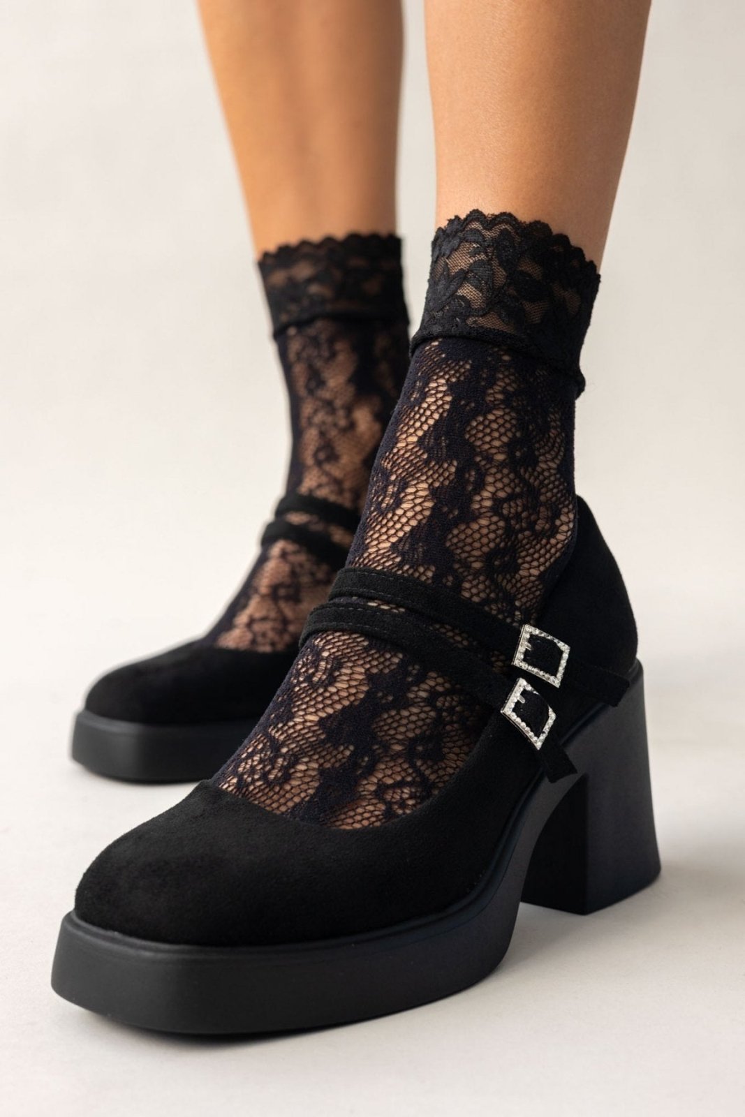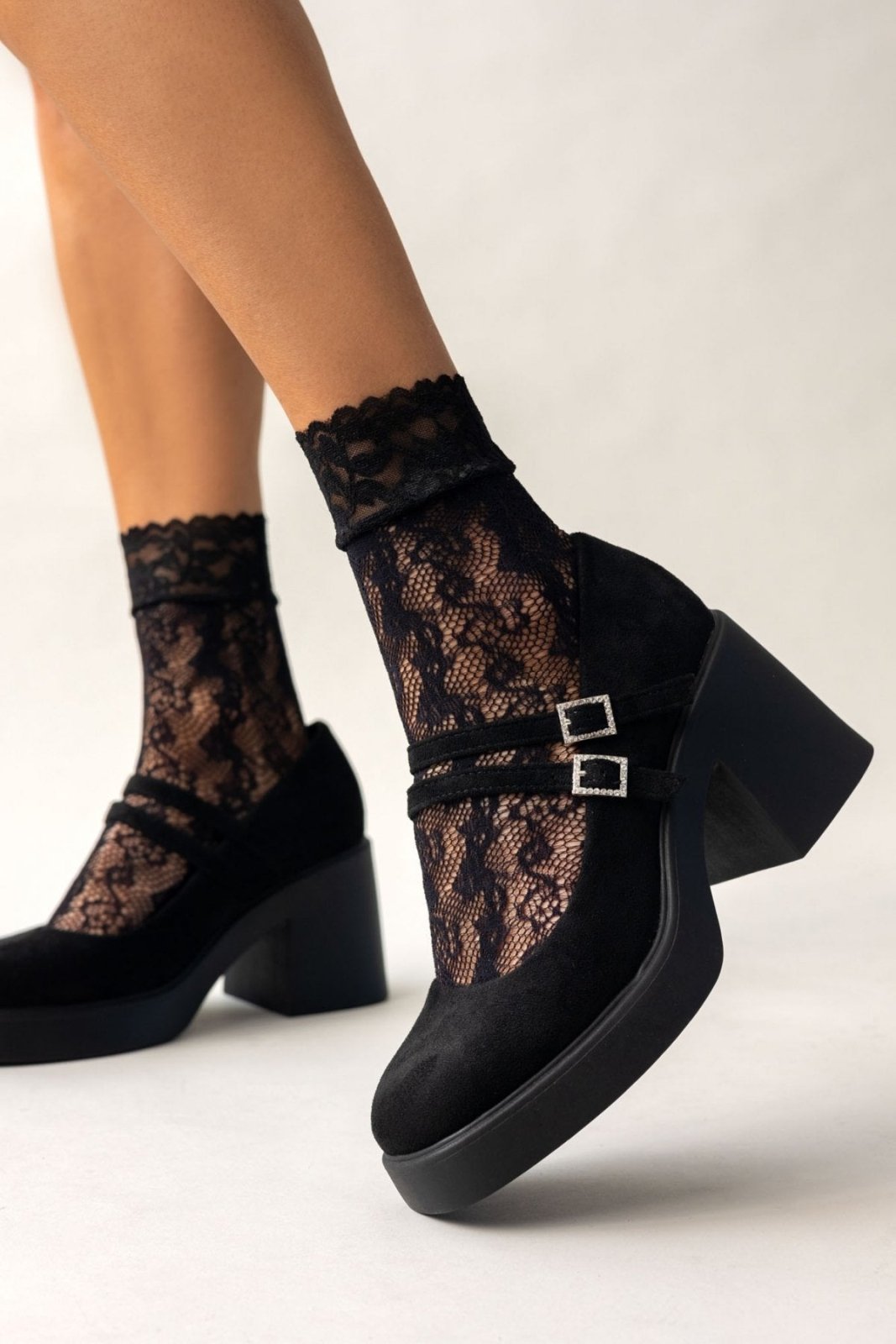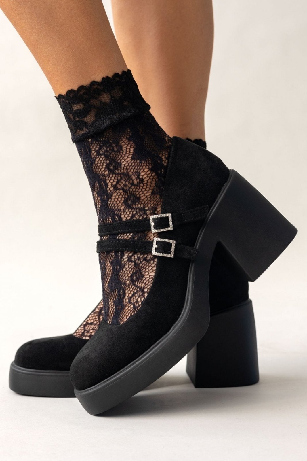 Γόβες suede Mary Janes. Διπλή μπαρέτα με στρας στους τοκάδες. Ψηλό χοντρό τακούνι.