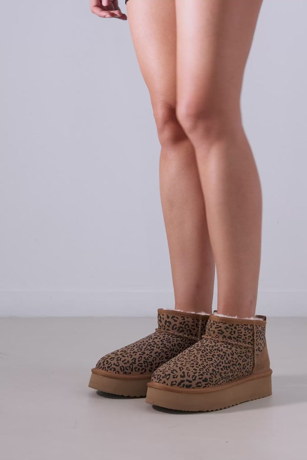 Leopard print ankle boots by KELARA in genuine suede with plush faux fur lining. Chic women’s boots offering warm comfort and standout style for winter.