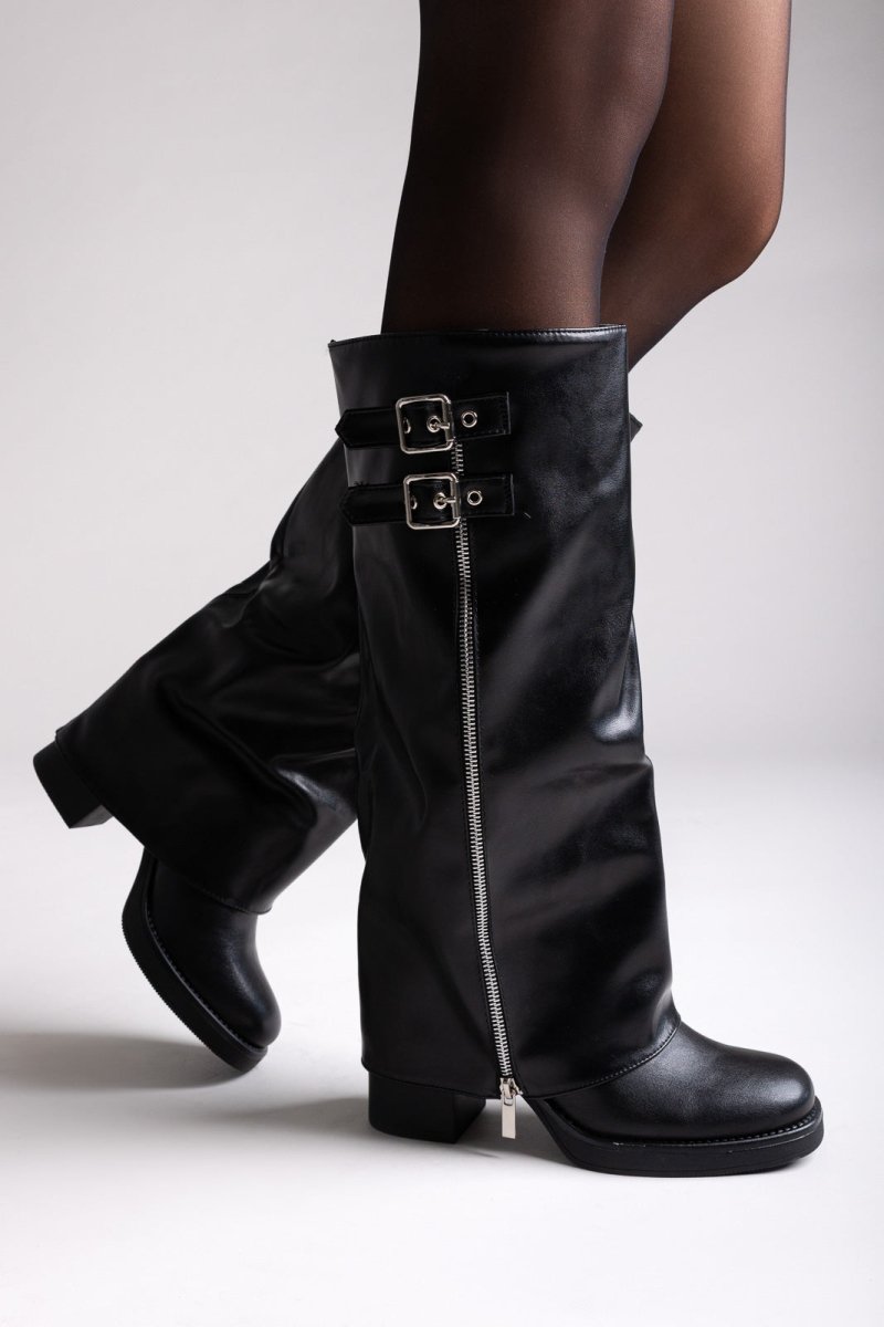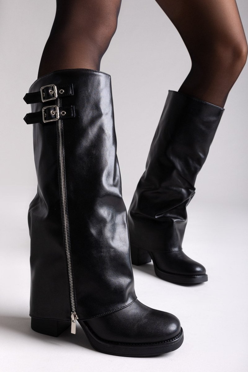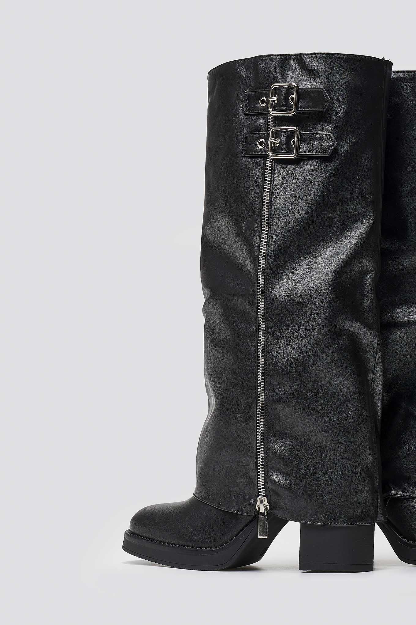 Knee-high boots with double buckle straps, block heel and side zipper. Stylish design with a distinctive gaiter effect.