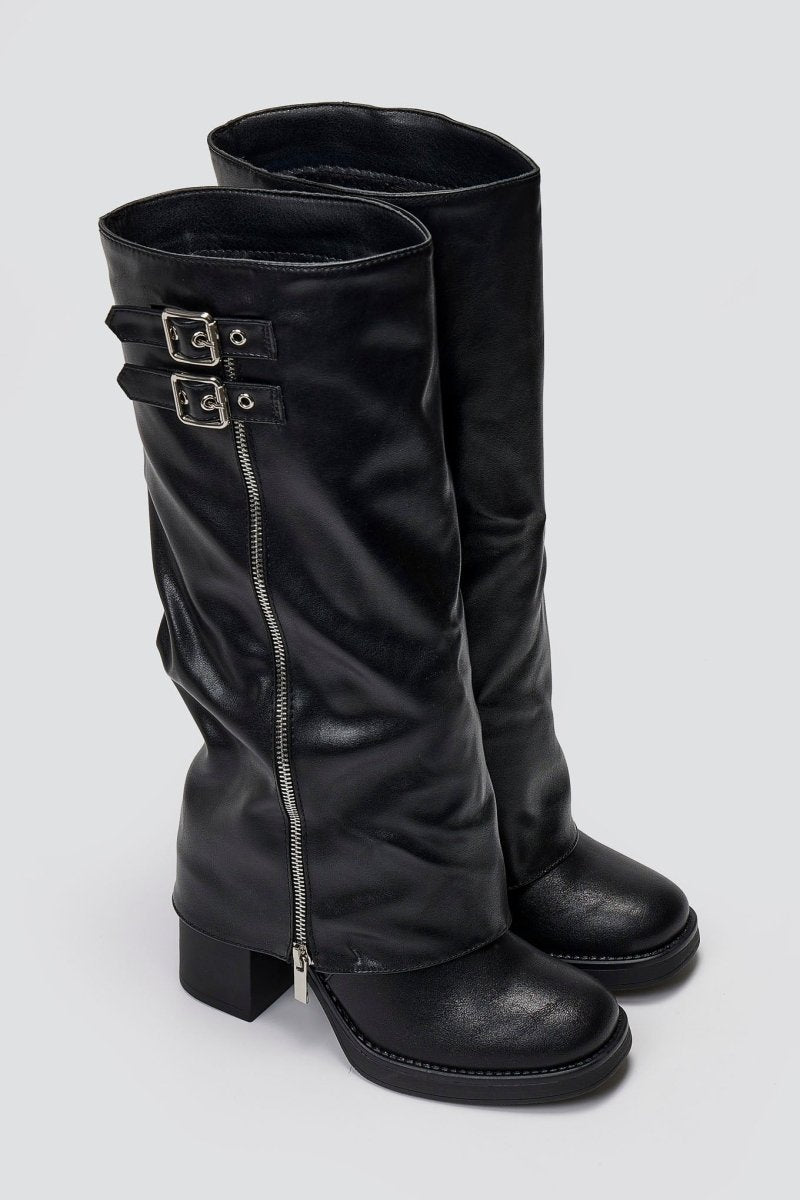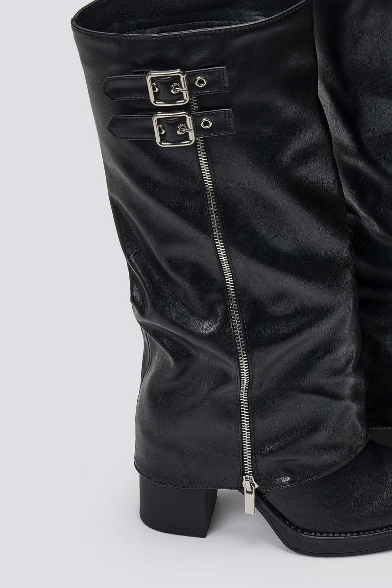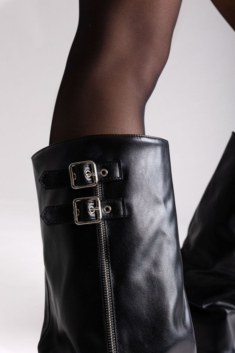 Knee-High Buckle Boots with Block Heel - Black Matte