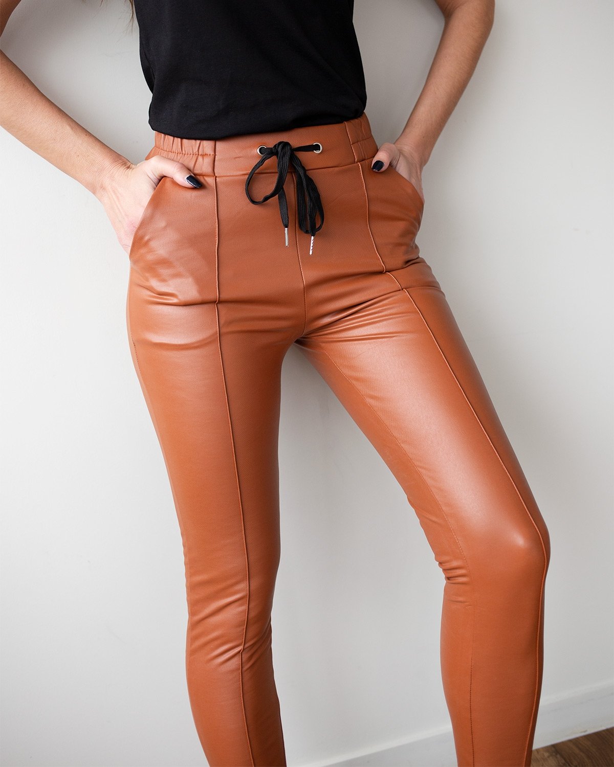 Κολάν δερματίνη με κάθετη ραφή στη μπροστινή πλευρά. Έχει κορδονάκι στη μέση.