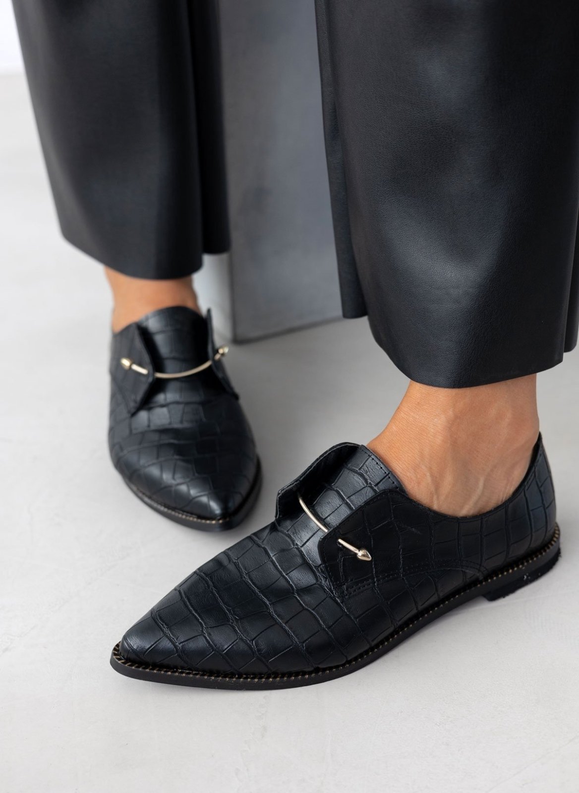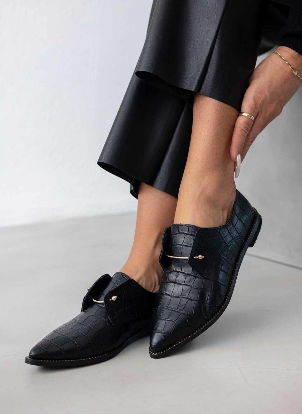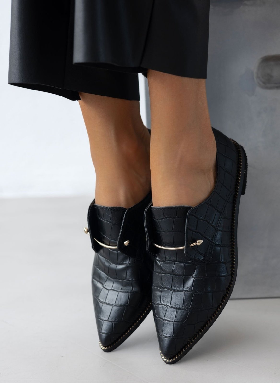 Estil μυτερά κροκό μοκασίνια με διακριτικά στοιχεία σε χρυσό χρώμα περιμετρικά της σόλας. Έχουν μεταλλικό διακοσμητικό στο κουτεπιέ. Ο πάτος είναι δερμάτινος. Ελληνικής κατασκευής.
