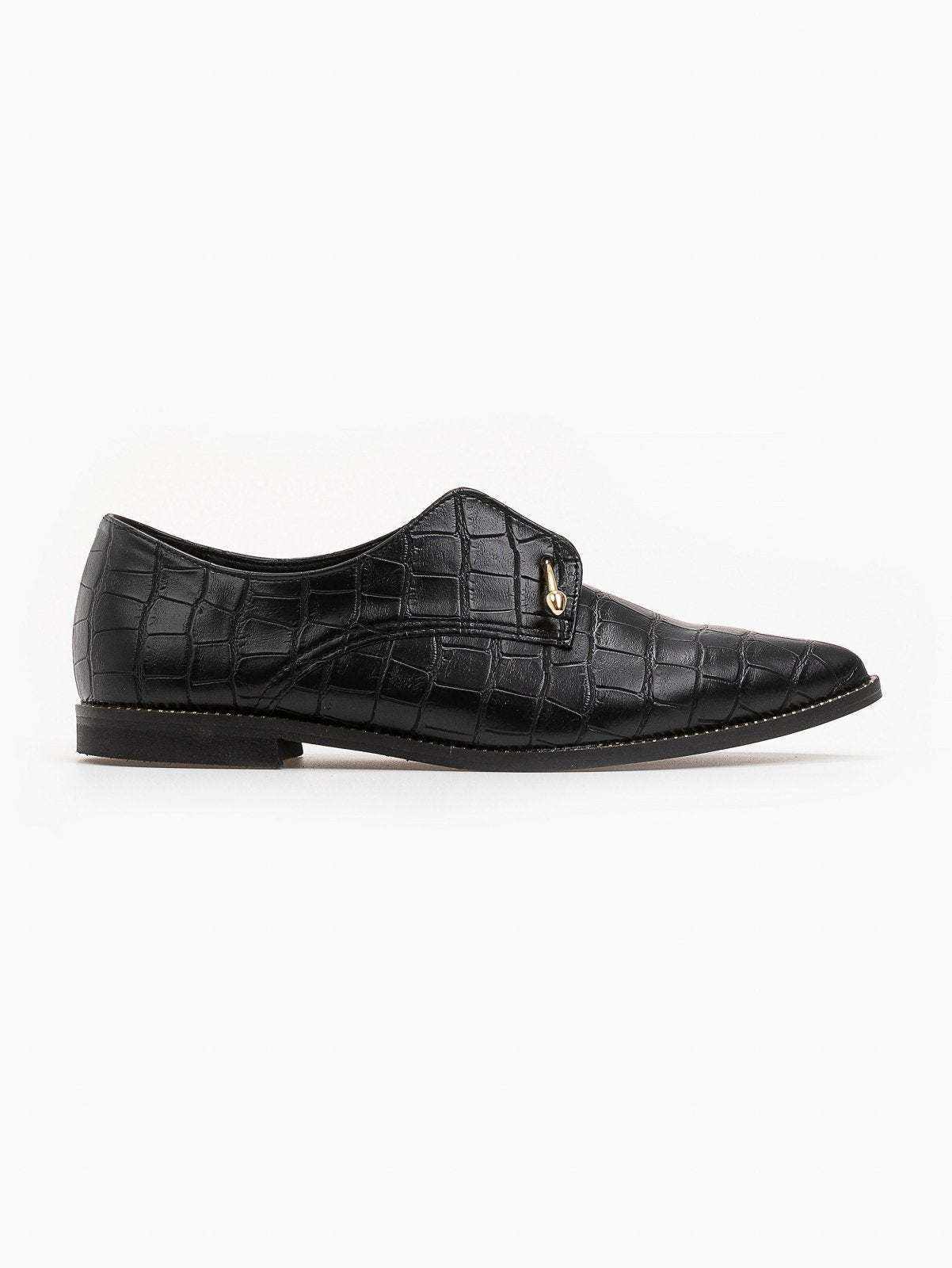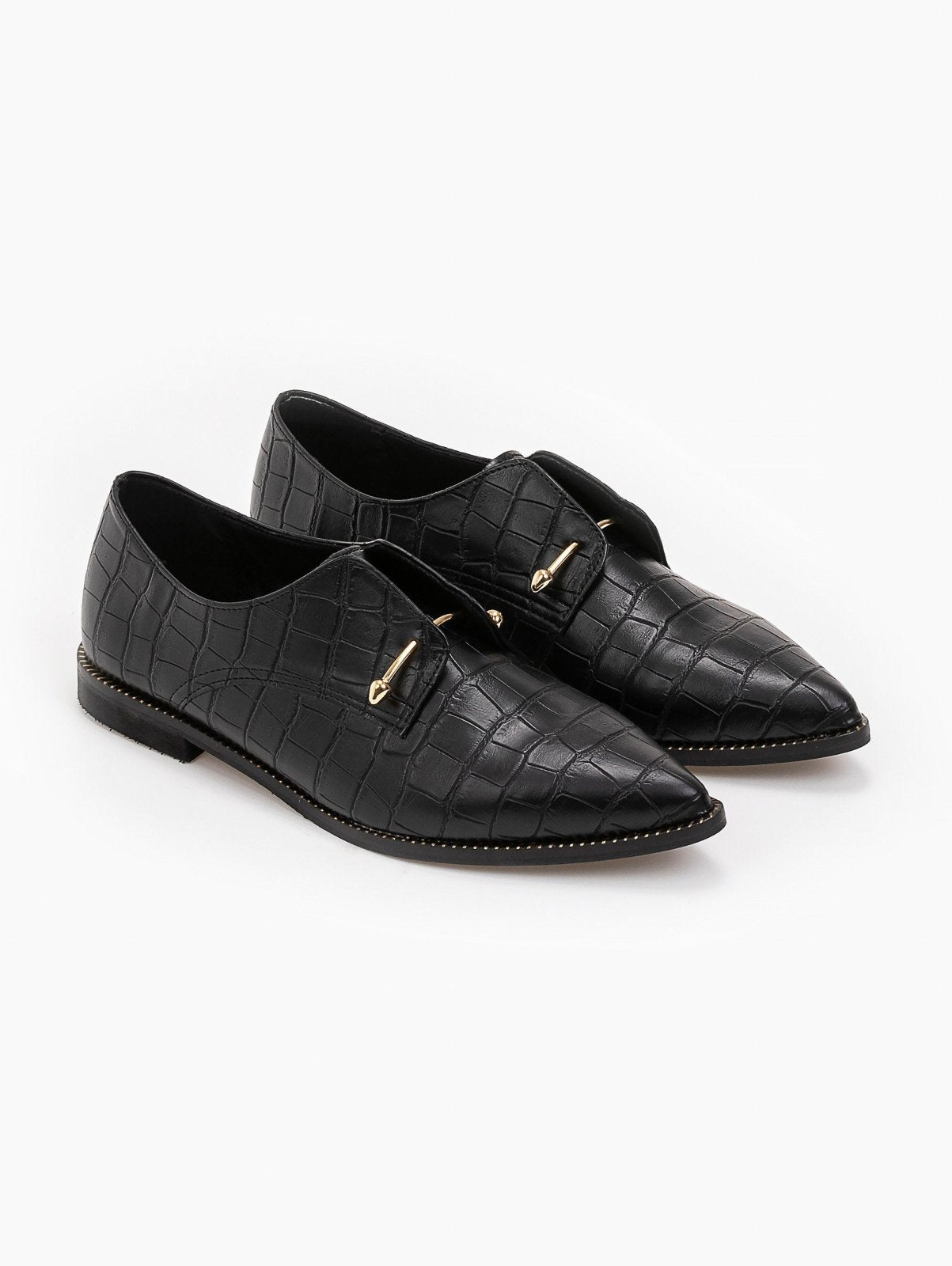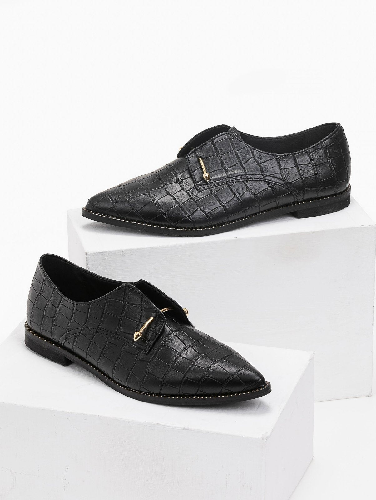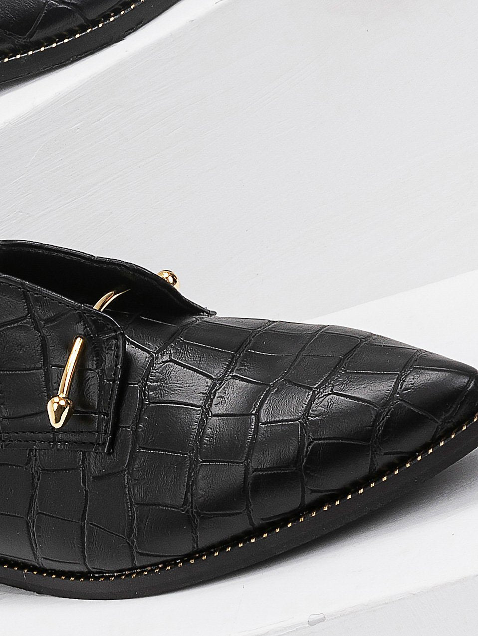 Estil μυτερά κροκό μοκασίνια με διακριτικά στοιχεία σε χρυσό χρώμα περιμετρικά της σόλας. Έχουν μεταλλικό διακοσμητικό στο κουτεπιέ. Ο πάτος είναι δερμάτινος. Ελληνικής κατασκευής.