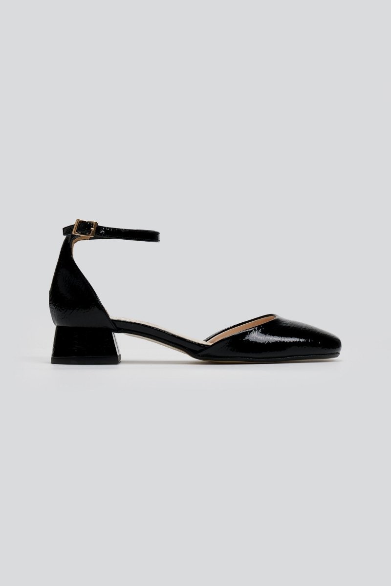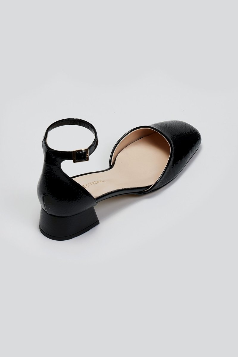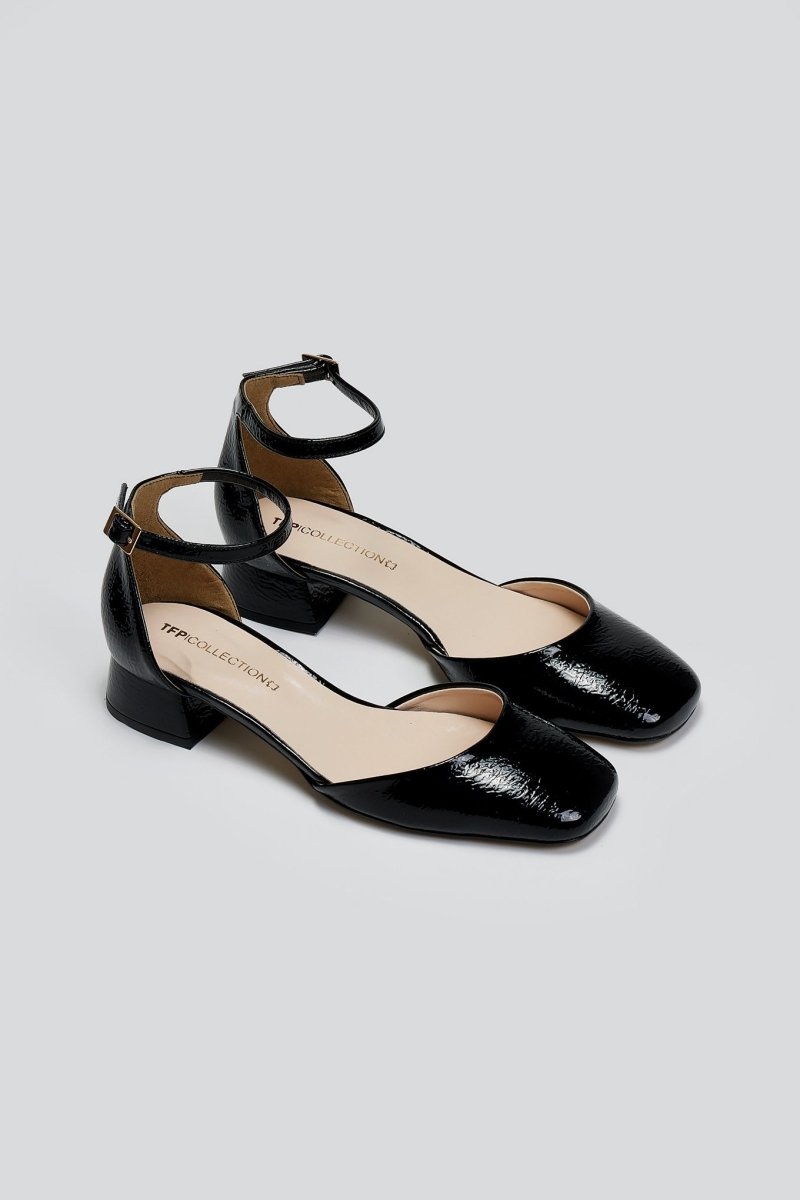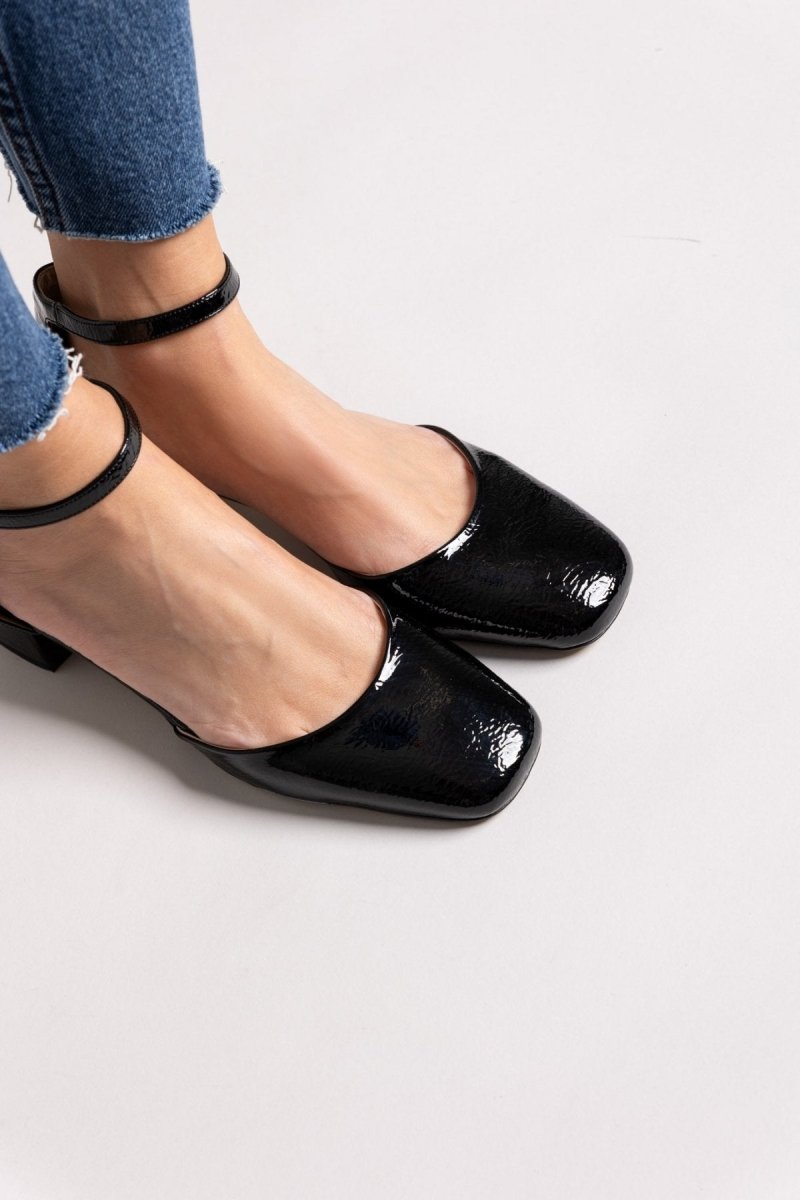 Μπαλαρίνες λουστρίνι με ανοιχτά πλαϊνά TFP. Κλειστή φτέρνα. Δένουν με μπαρέτα στο ύψος του αστραγάλου. Δερμάτινος πάτος. Ελληνικής κατασκευής.