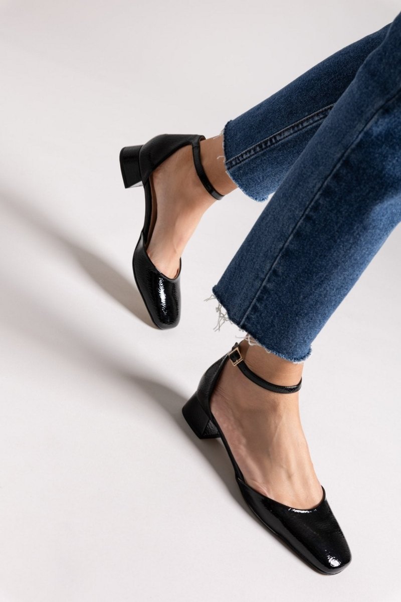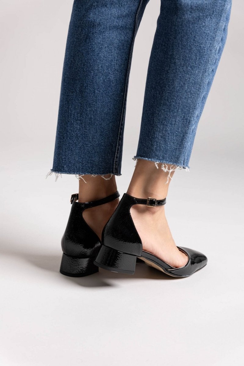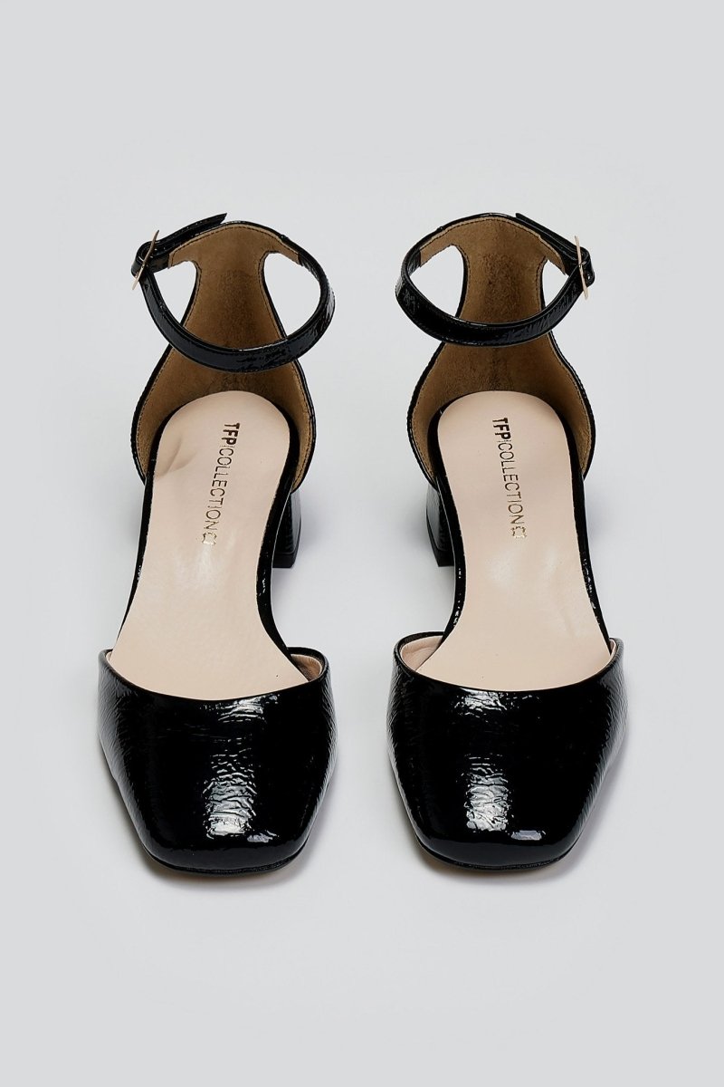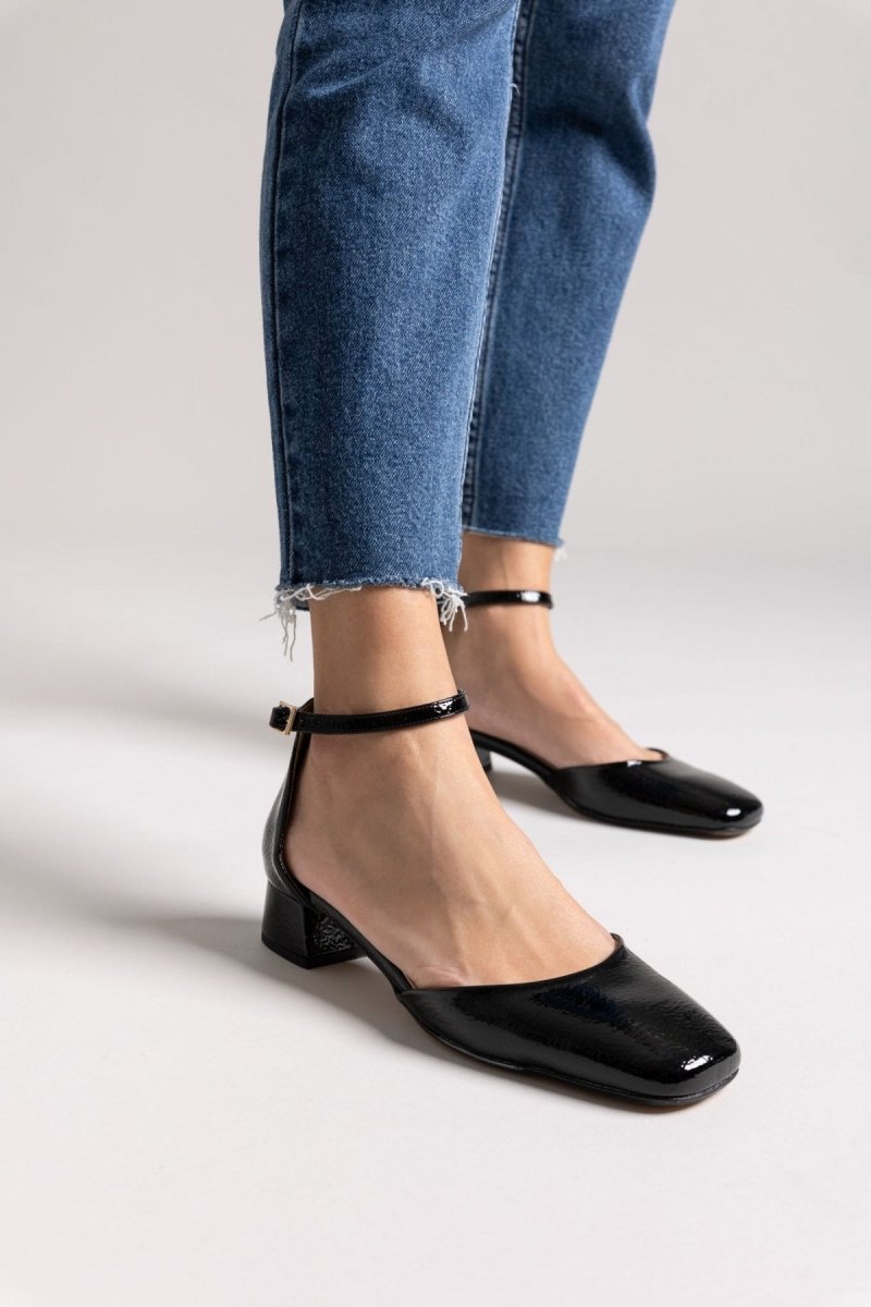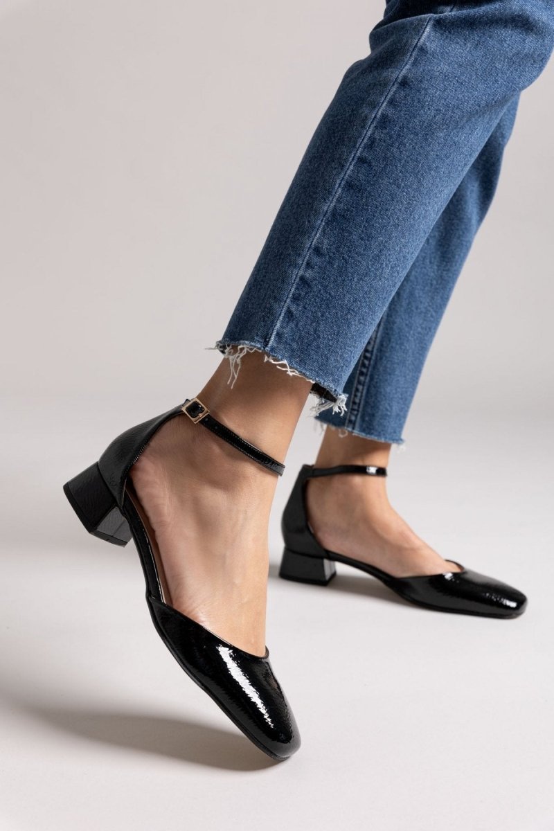 Μπαλαρίνες λουστρίνι με ανοιχτά πλαϊνά TFP. Κλειστή φτέρνα. Δένουν με μπαρέτα στο ύψος του αστραγάλου. Δερμάτινος πάτος. Ελληνικής κατασκευής.
