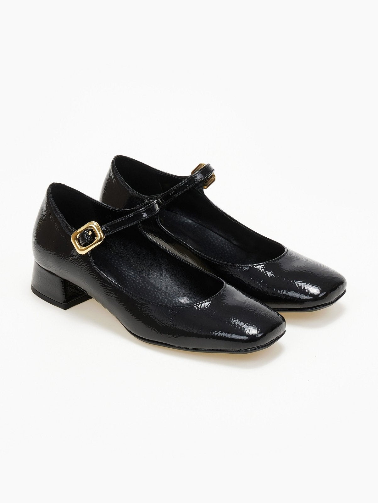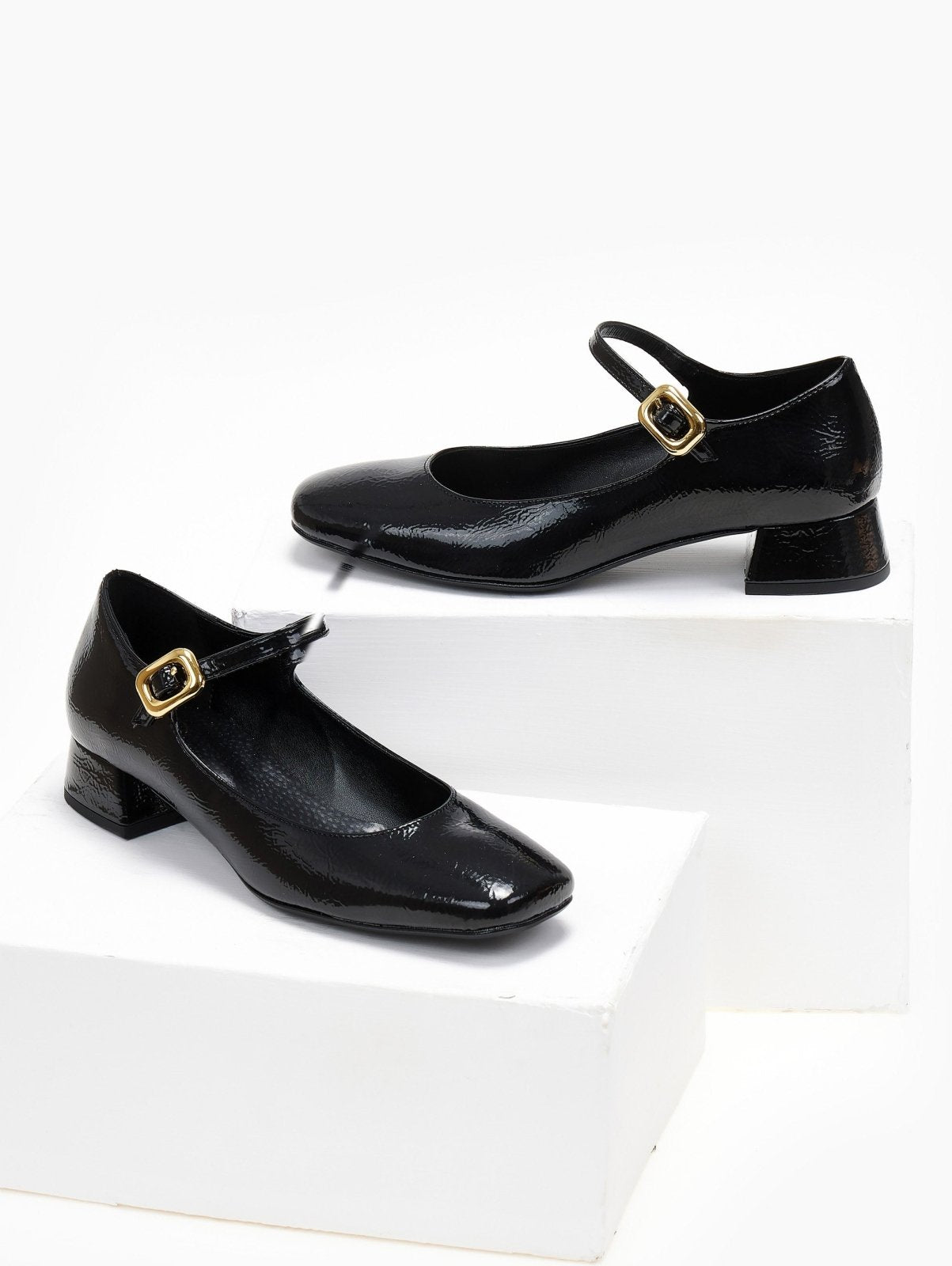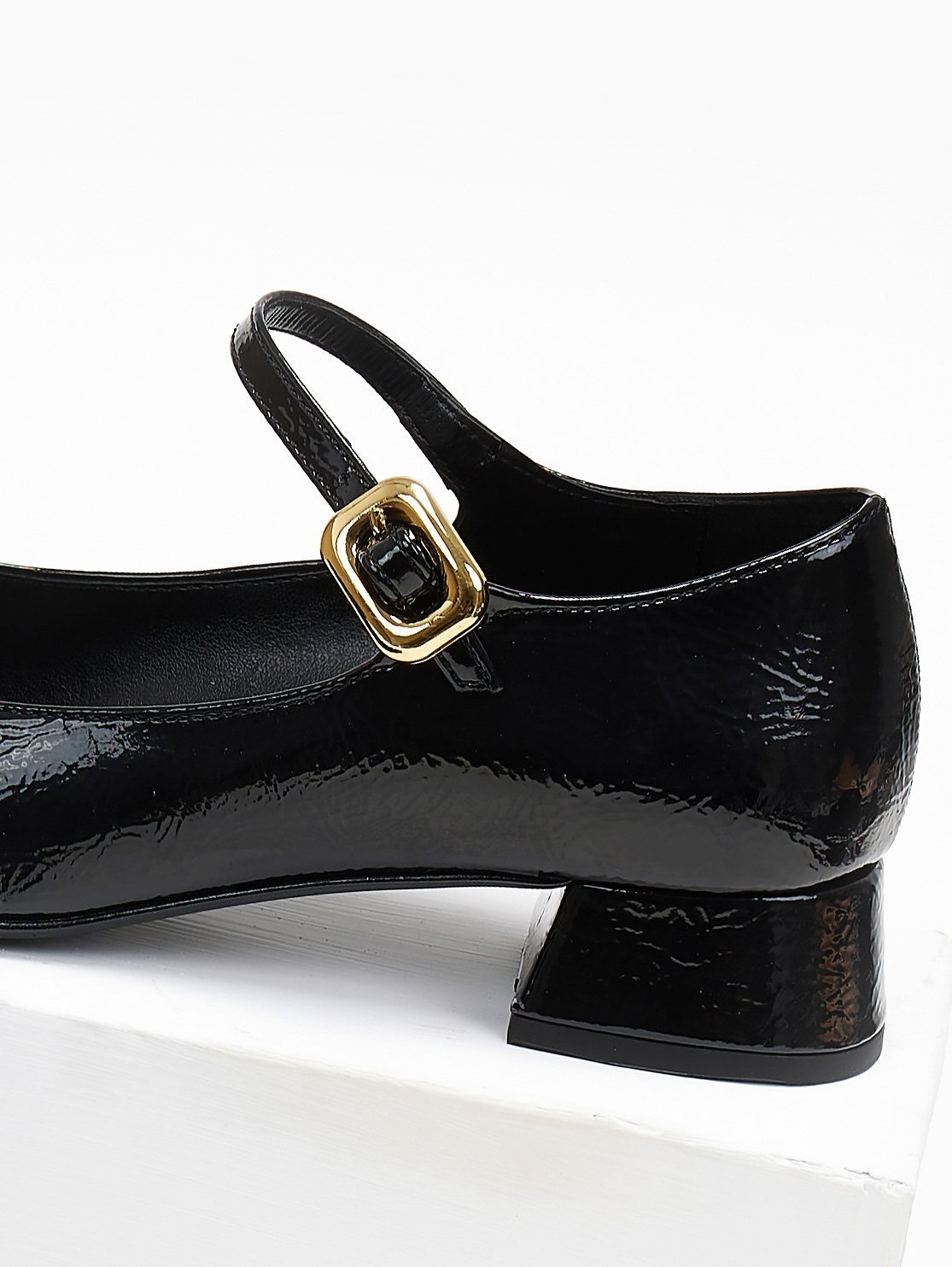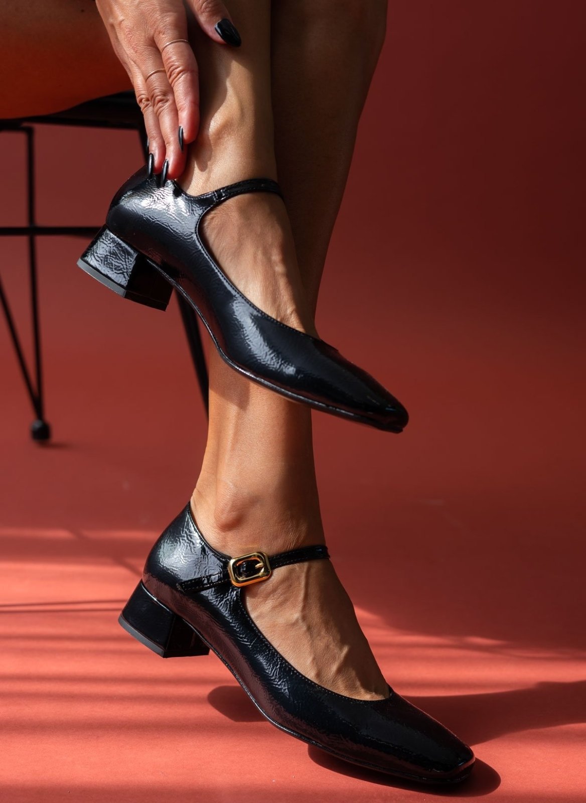 Μπαλαρίνες λουστρίνι Mary Jane με χαμηλό τετράγωνο τακούνι Tfp. Δένουν με μπαρέτα στο ύψος του κουτεπιέ. Δερμάτινος πάτος. Ελληνικής κατασκευής.