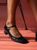 Μπαλαρίνες λουστρίνι Mary Jane με χαμηλό τετράγωνο τακούνι Tfp. Δένουν με μπαρέτα στο ύψος του κουτεπιέ. Δερμάτινος πάτος. Ελληνικής κατασκευής.