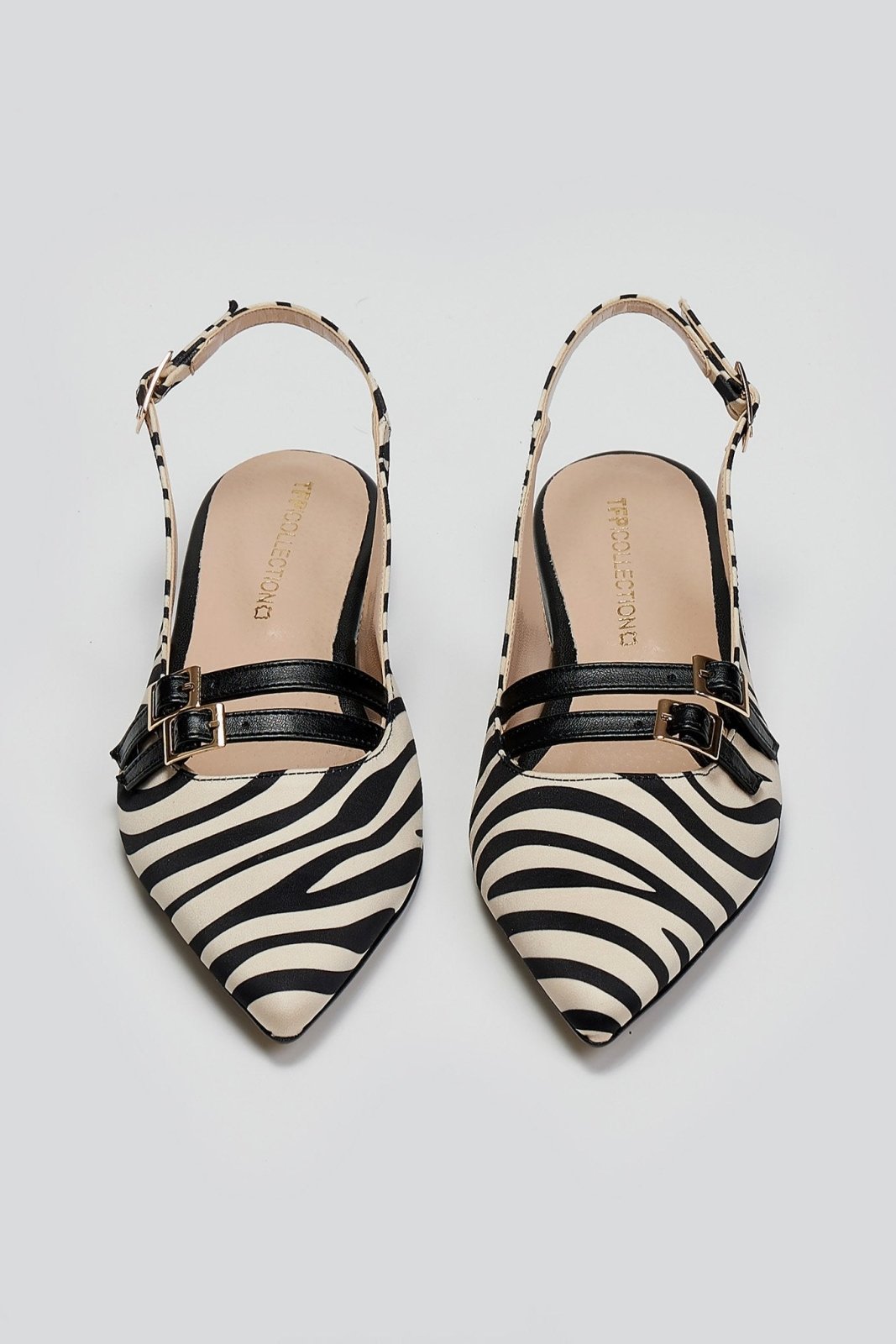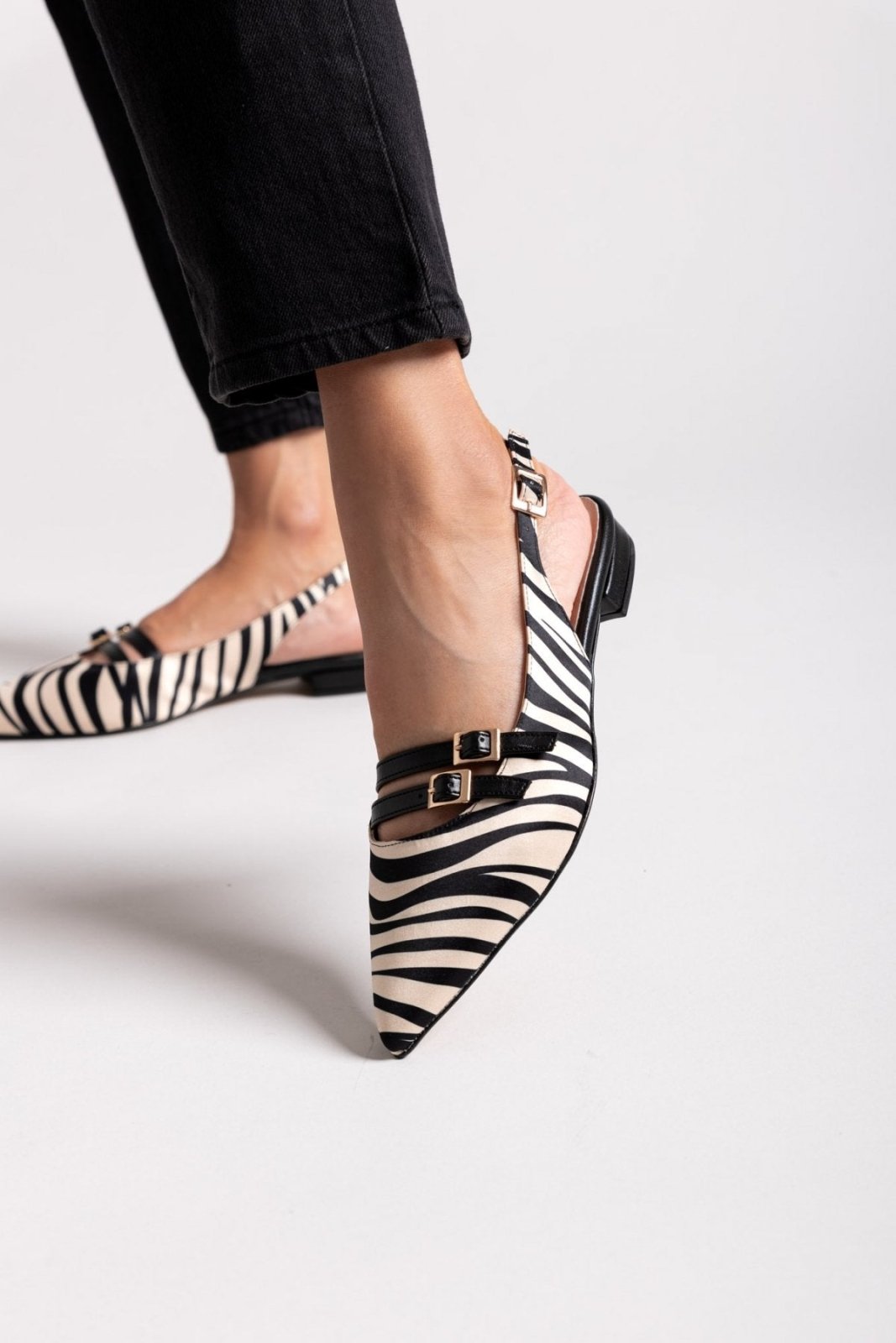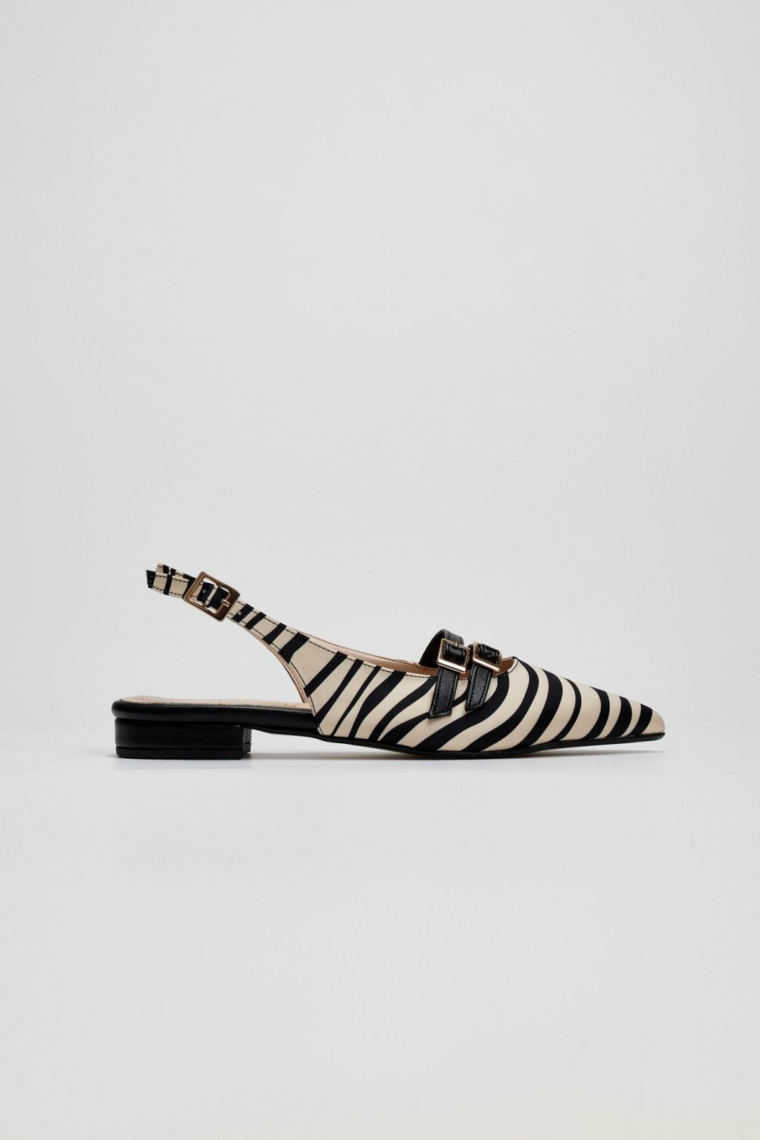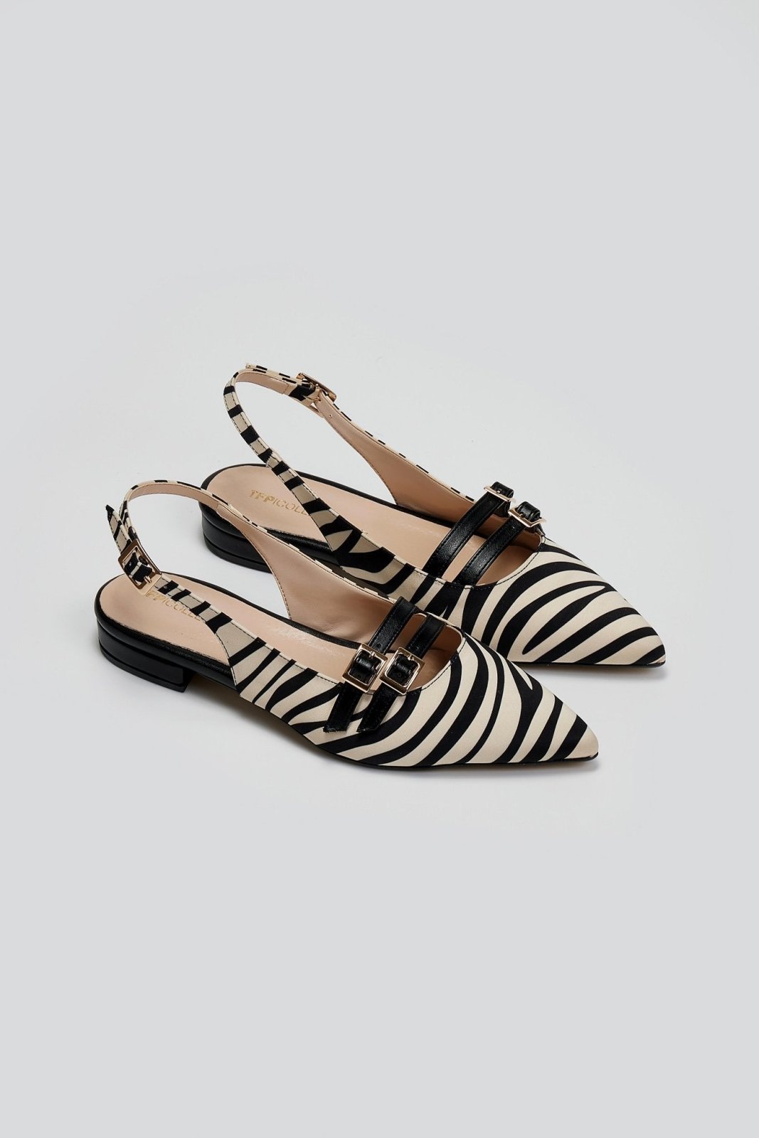 Μπαλαρίνες μυτερές slingback TFP. Ύφασμα σατέν με animal print σχέδιο. Σχέδιο λουράκια με διακρικούς τοκάδες στο ύψος του κουτεπιέ. Δερμάτινος πάτος. Ελληνικής κατασκευής.