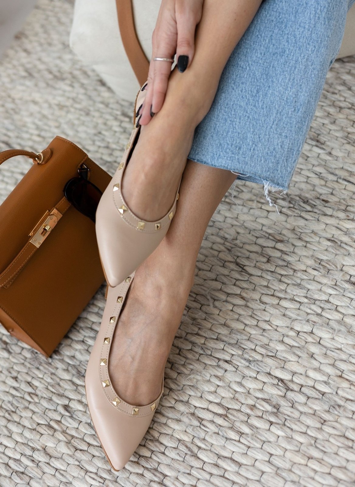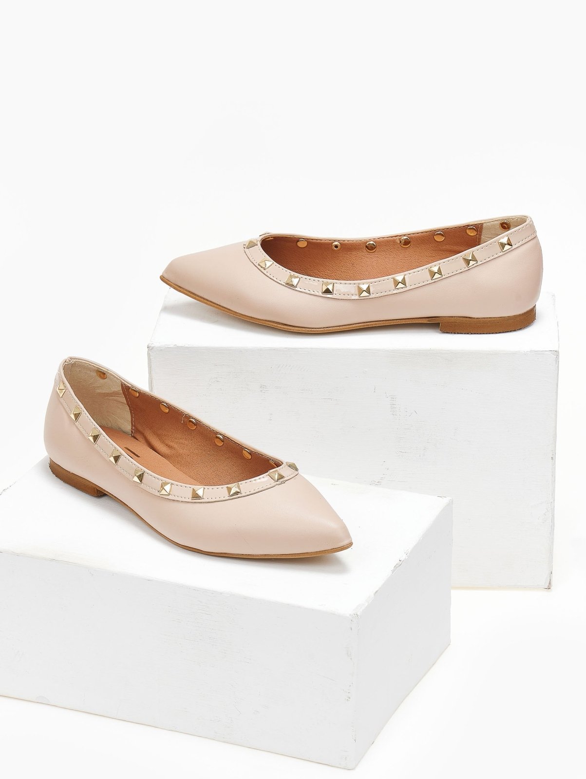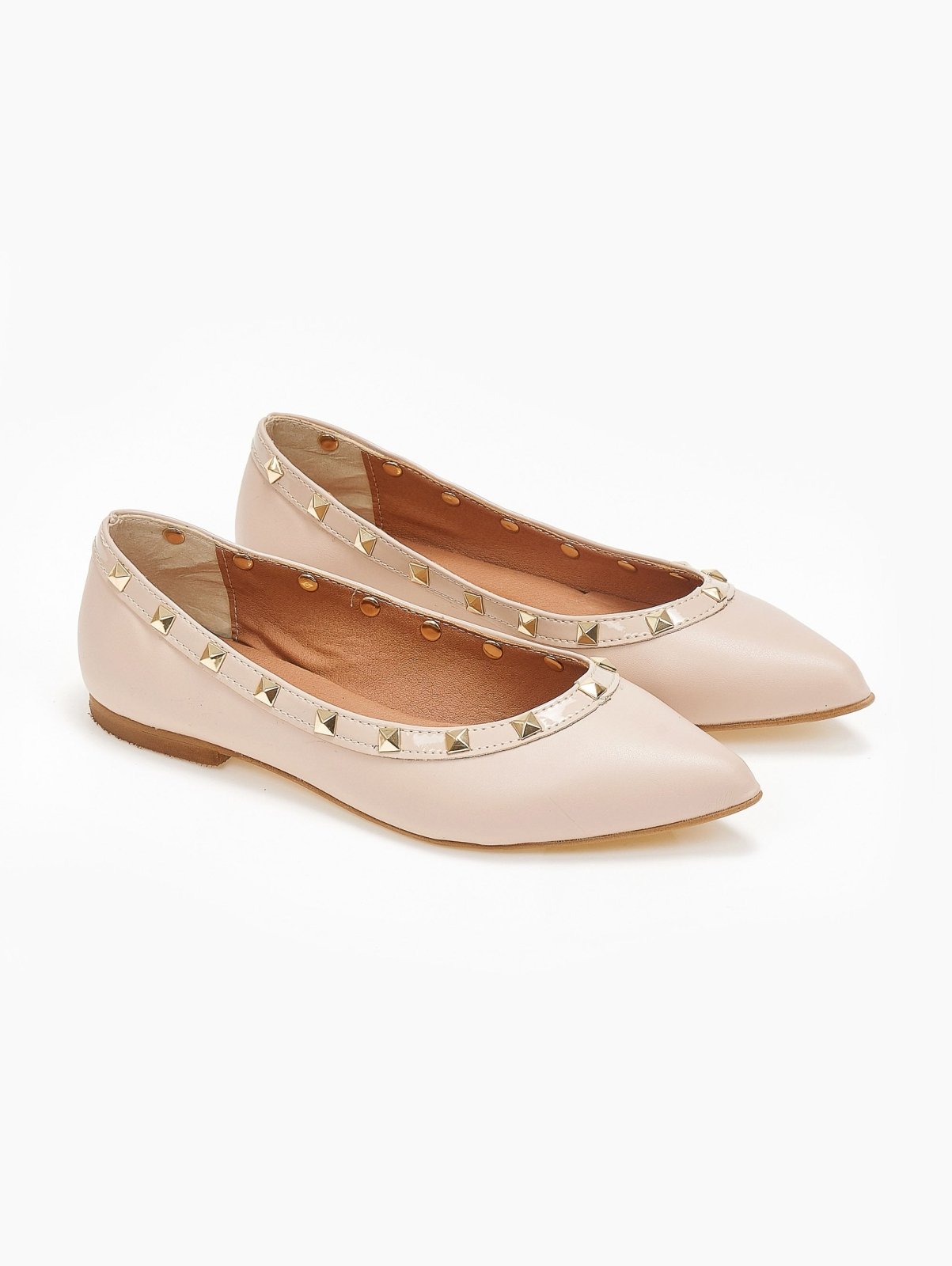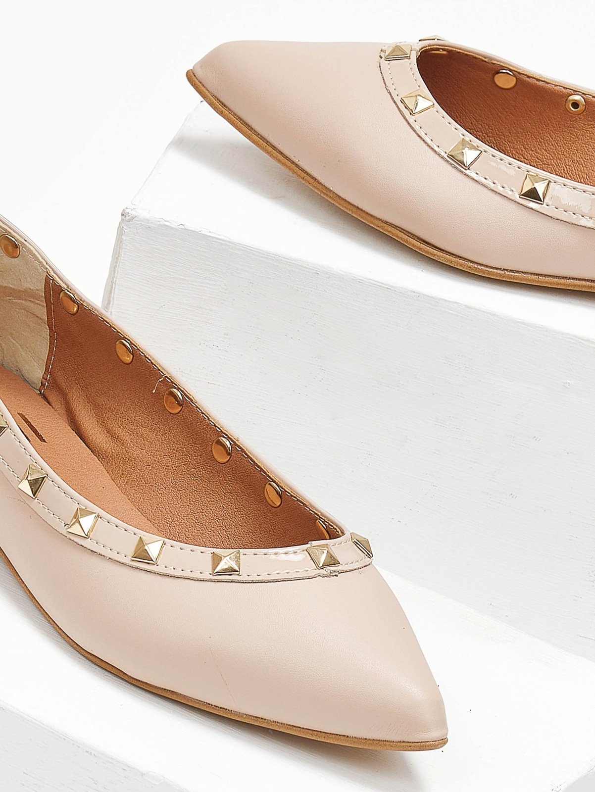 Μπαλαρίνες μυτερές μάτ estil. Έχουν σχέδιο με μεταλλικά τρουκς περιμετρικά στο επάνω μέρος. Λεπτομέρεια απο λουστρίνι. Δερμάτινος πάτος. Ελληνικής κατασκευής.