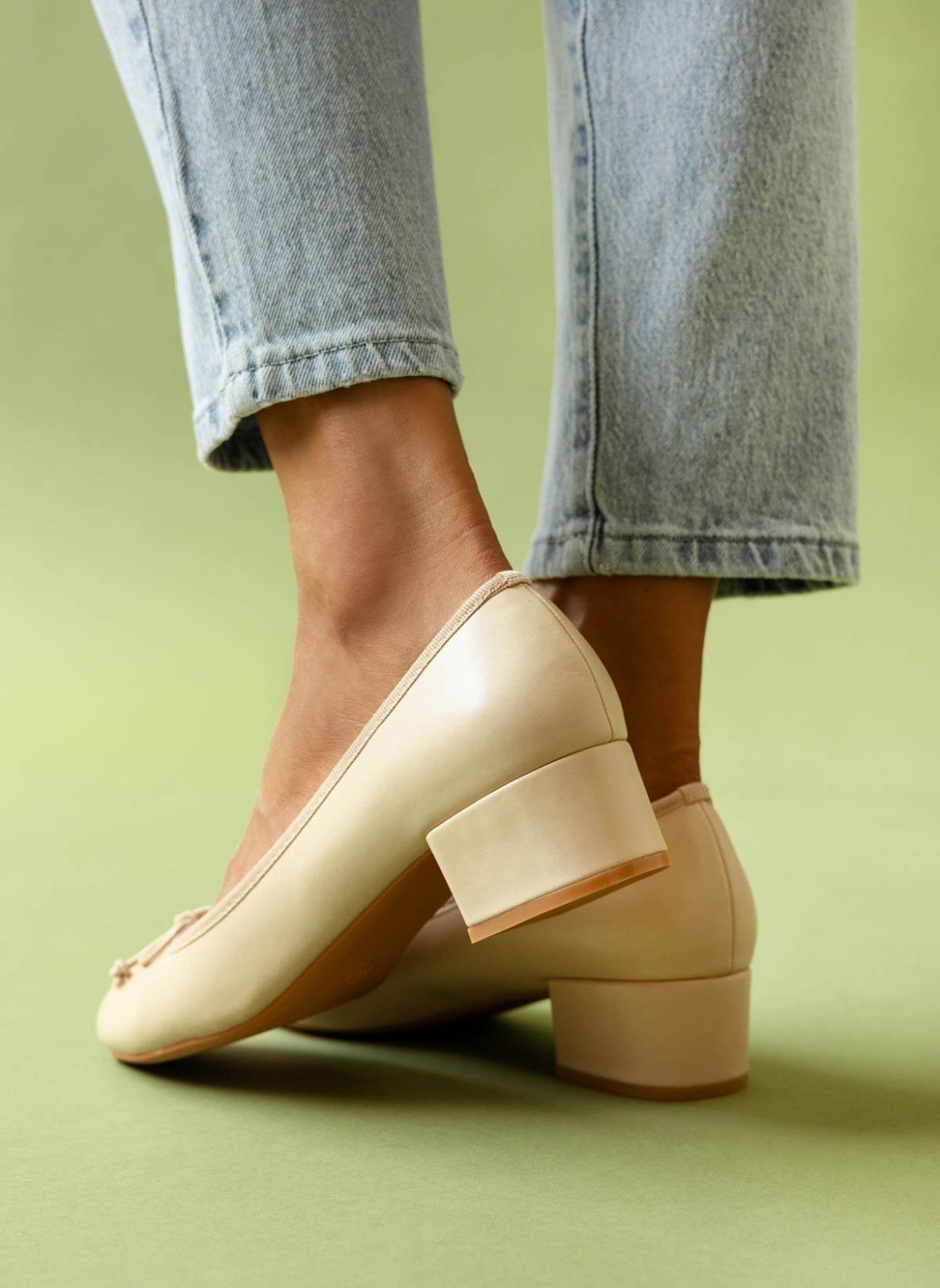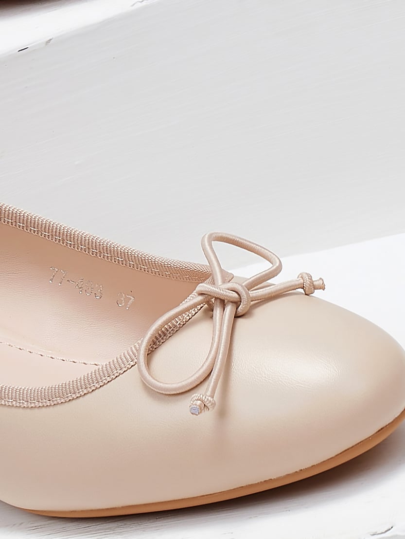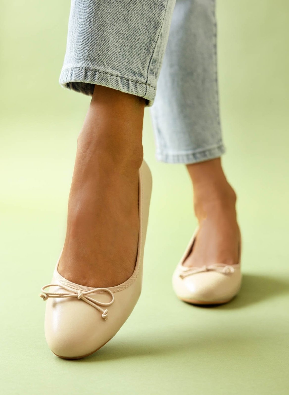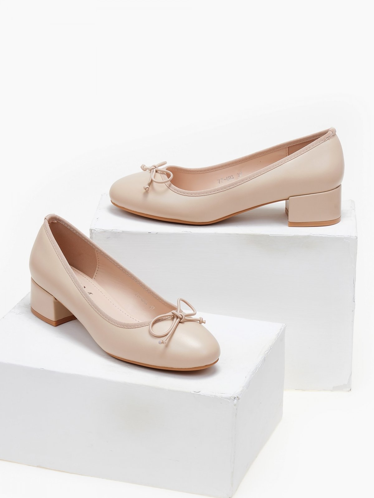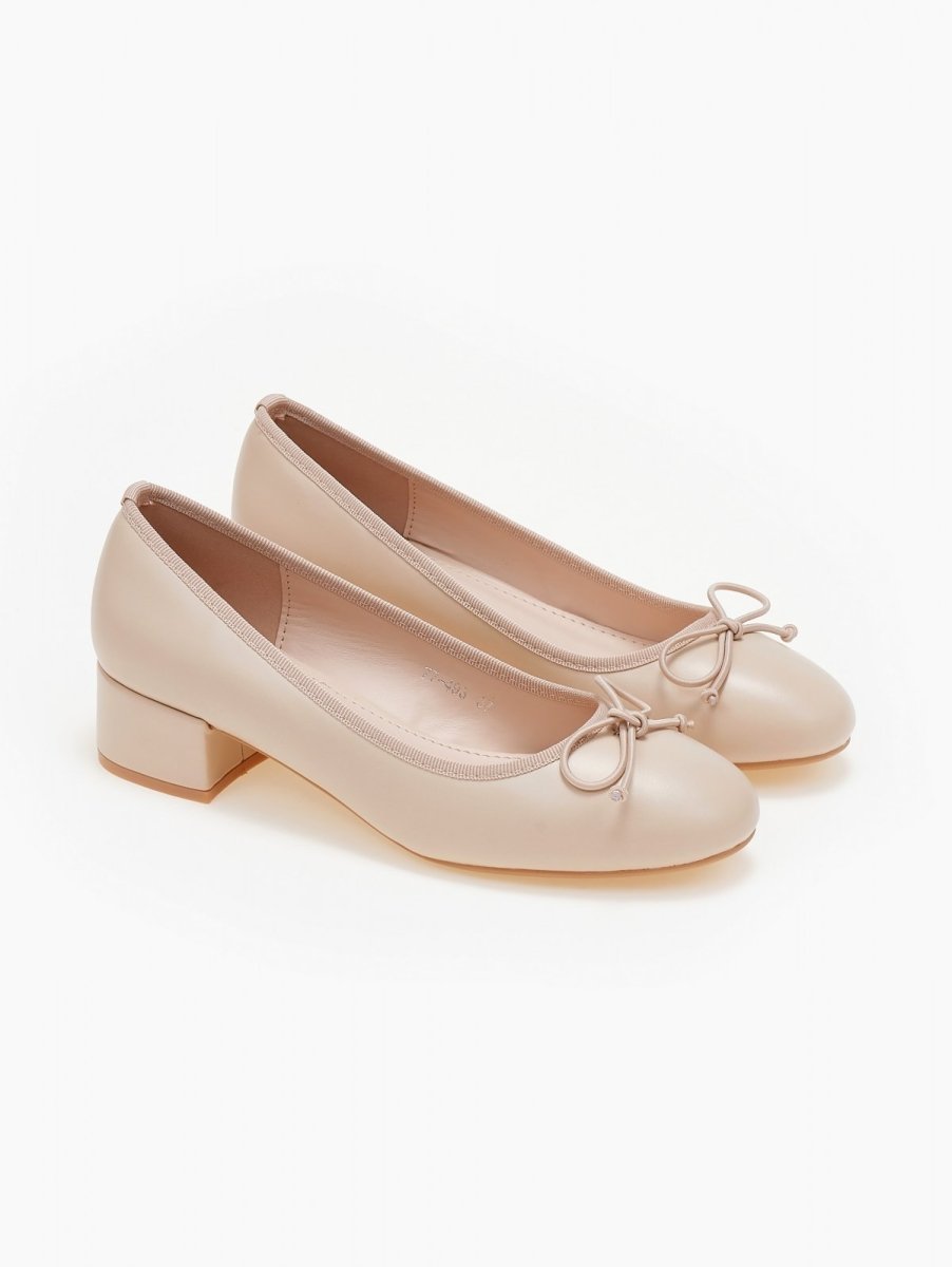 Μπαλαρίνες με χαμηλό τετράγωνο τακούνι. Έχουν λεπτό φιογκάκι στο επάνω μέρος. Στρογγυλή γραμμή.