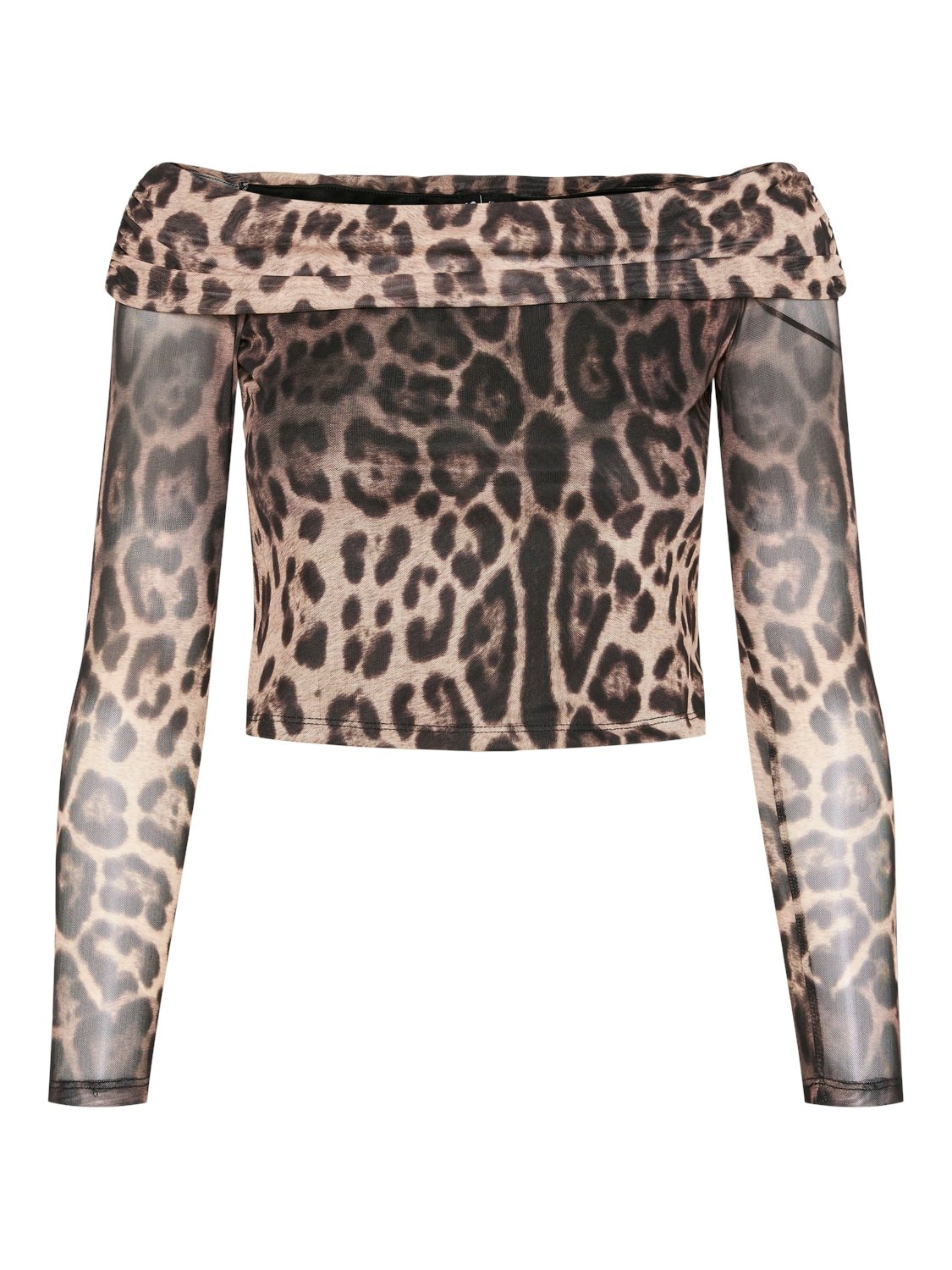 Μπλούζα με ανοιχτούς ώμους PIECES. Animal print σχέδιο. Εφαρμοστή γραμμή.