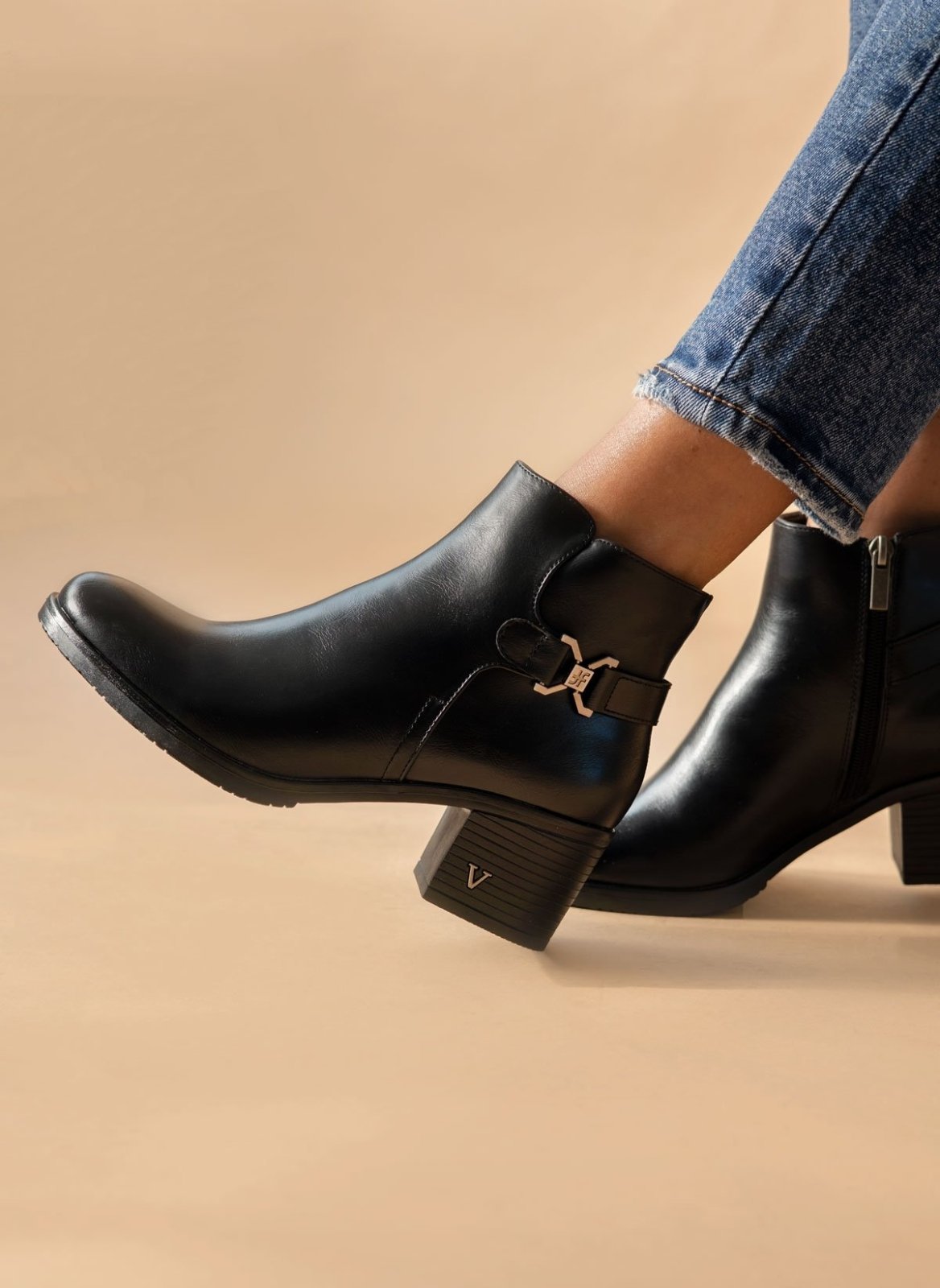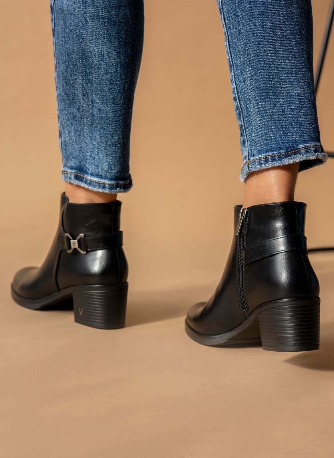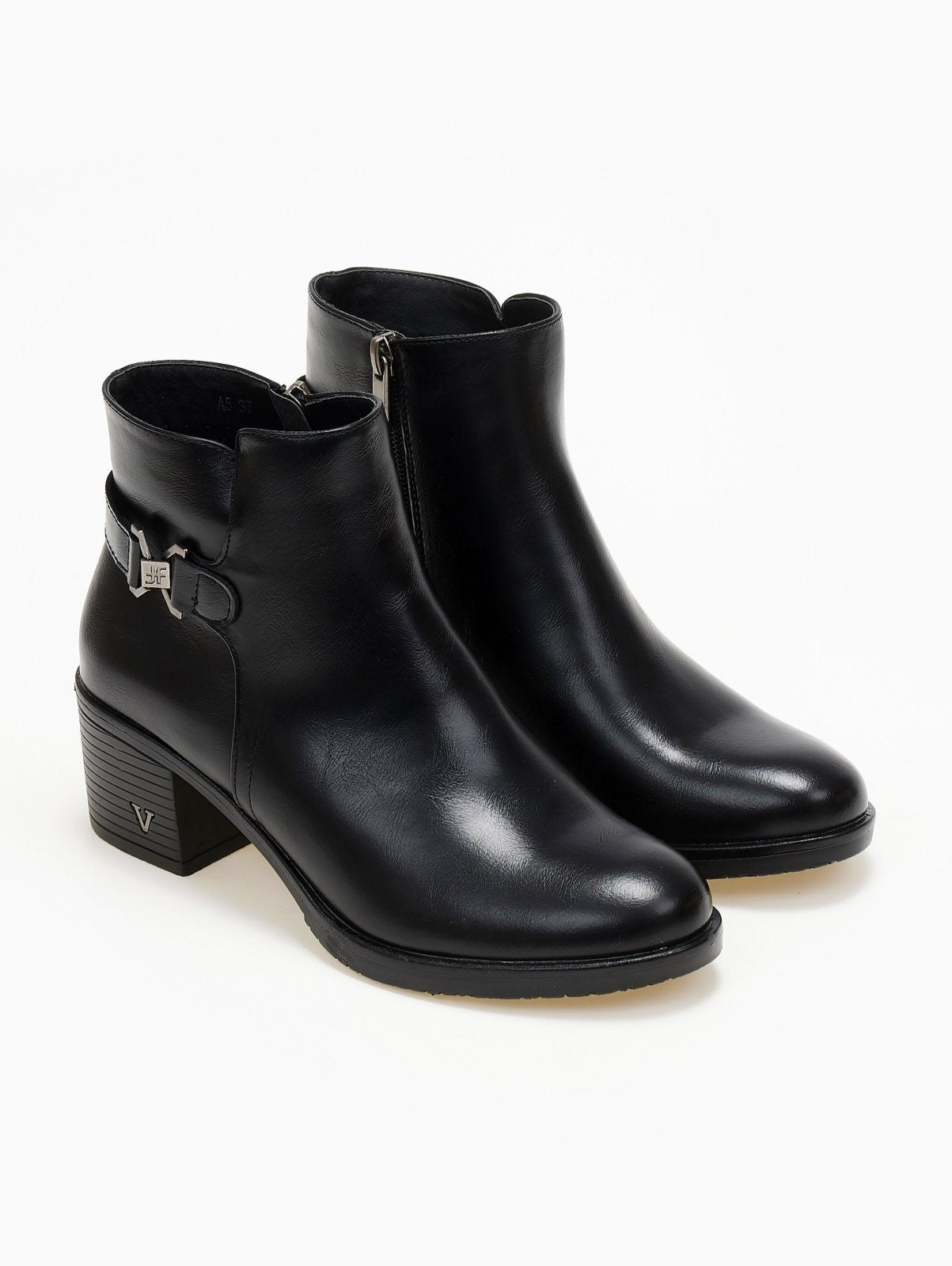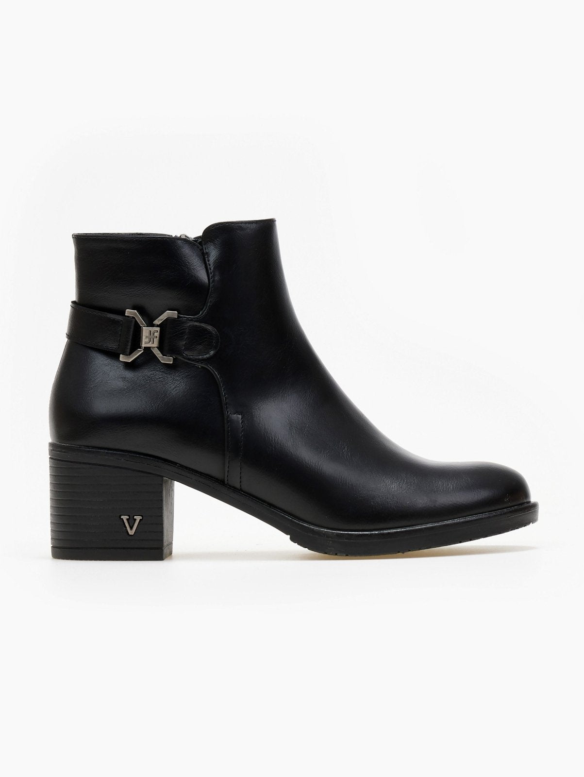 Μποτάκια αστραγάλου casual με διακριτικό μεταλλικό στοιχείο στο τακούνι. Έχουν ζωνάκι με μεταλλικό σχέδιο στο πλάι. Κλείνουν με φερμουάρ.