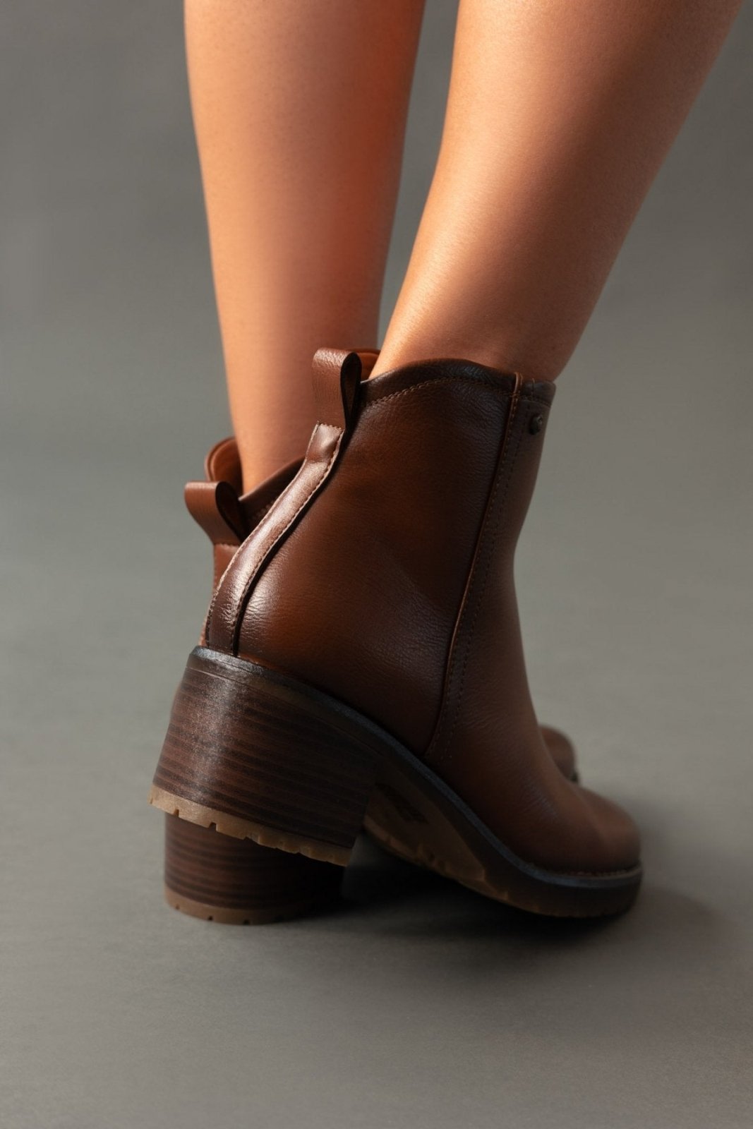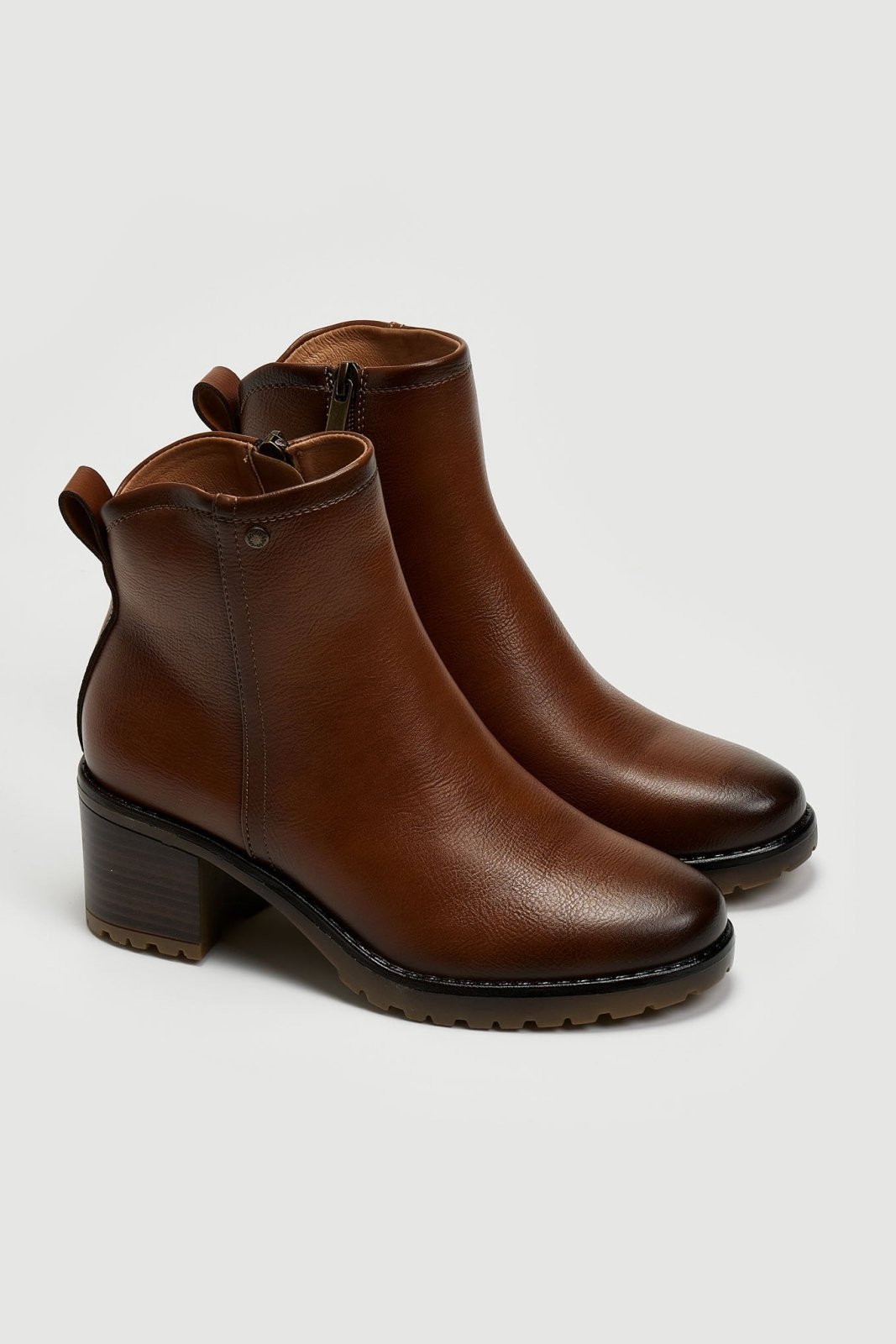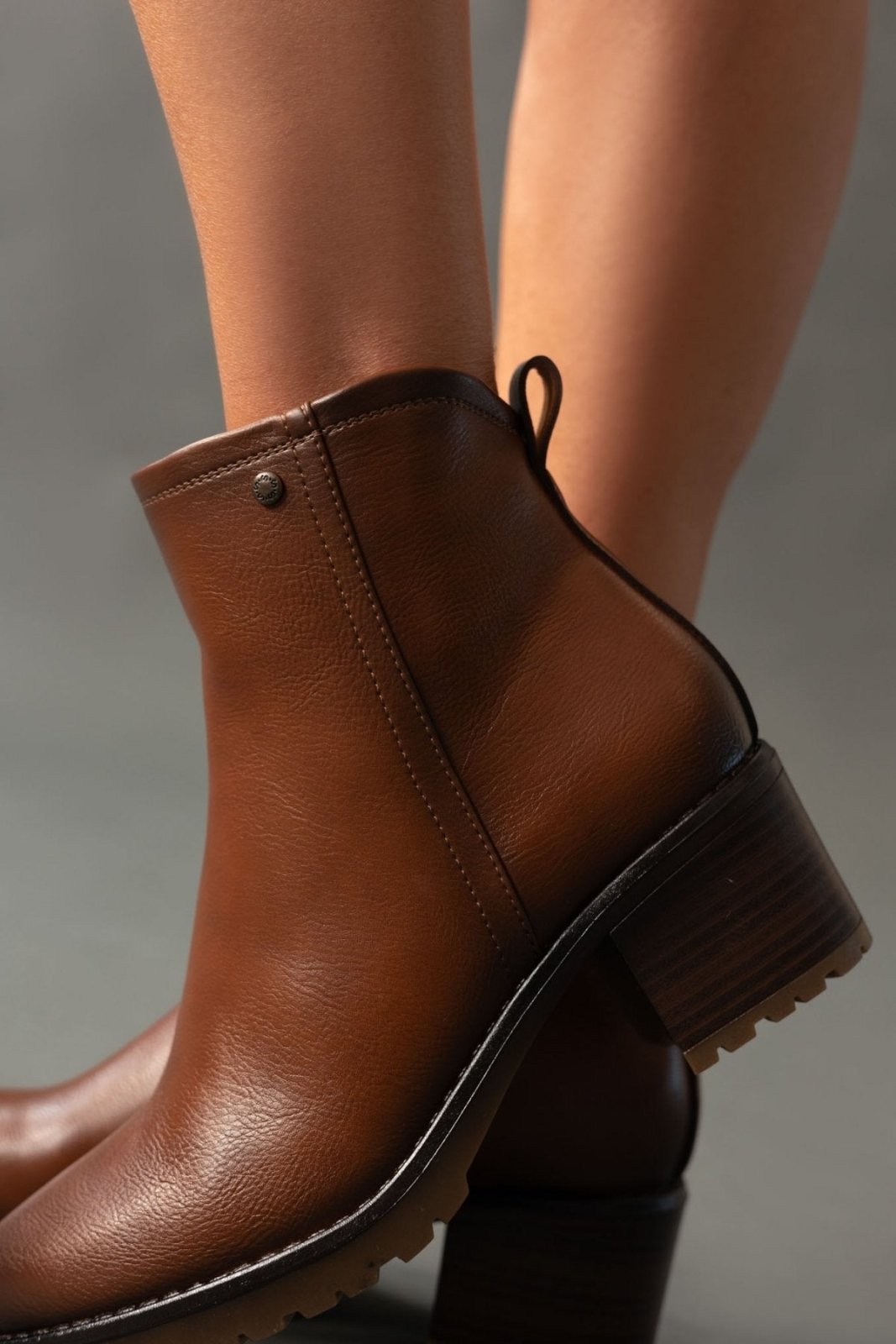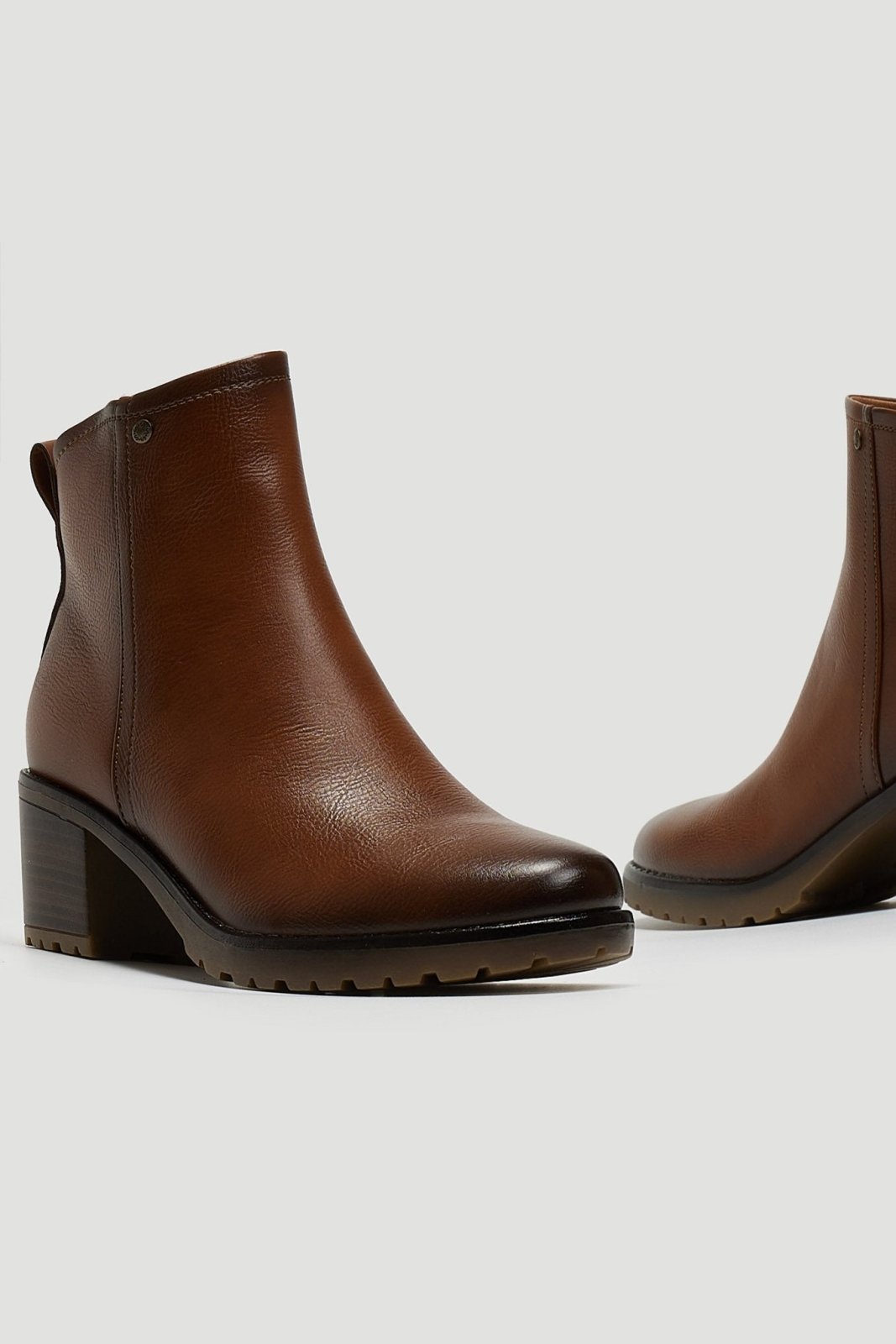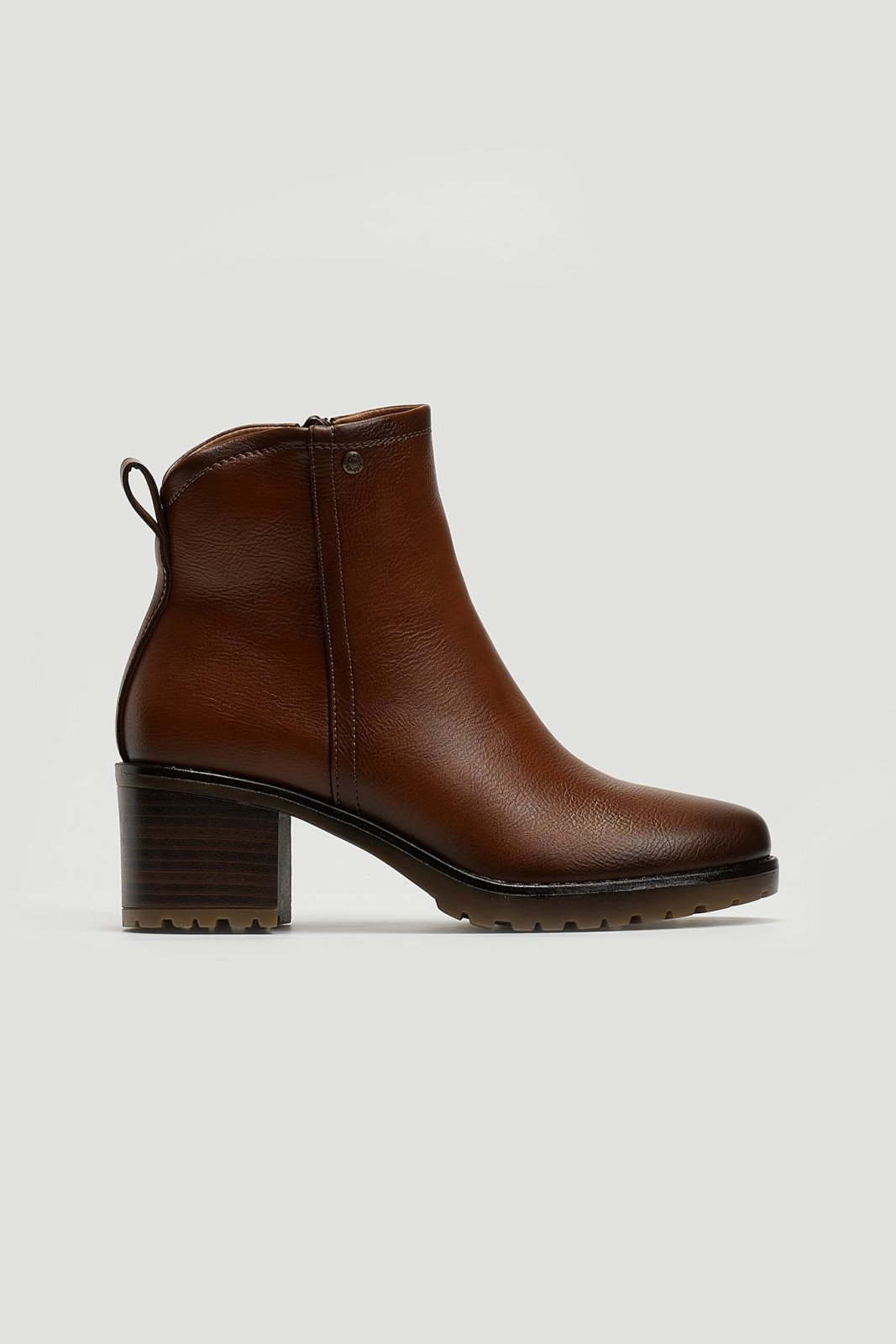 Μποτάκια αστραγάλου με τακούνι. Άνισο τελείωμα με θηλάκι πίσω. Στρογγυή γραμμή.