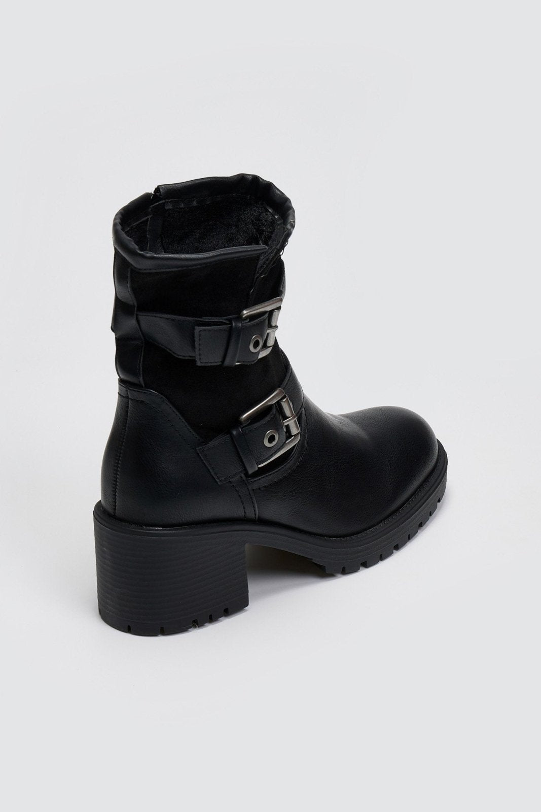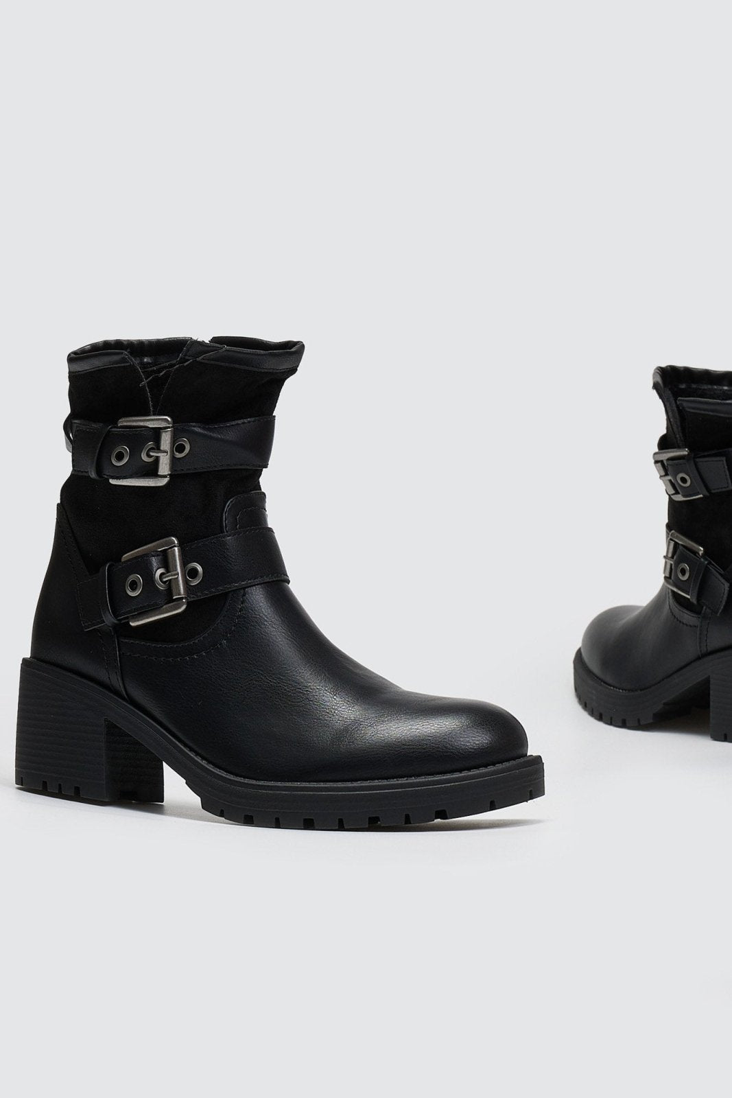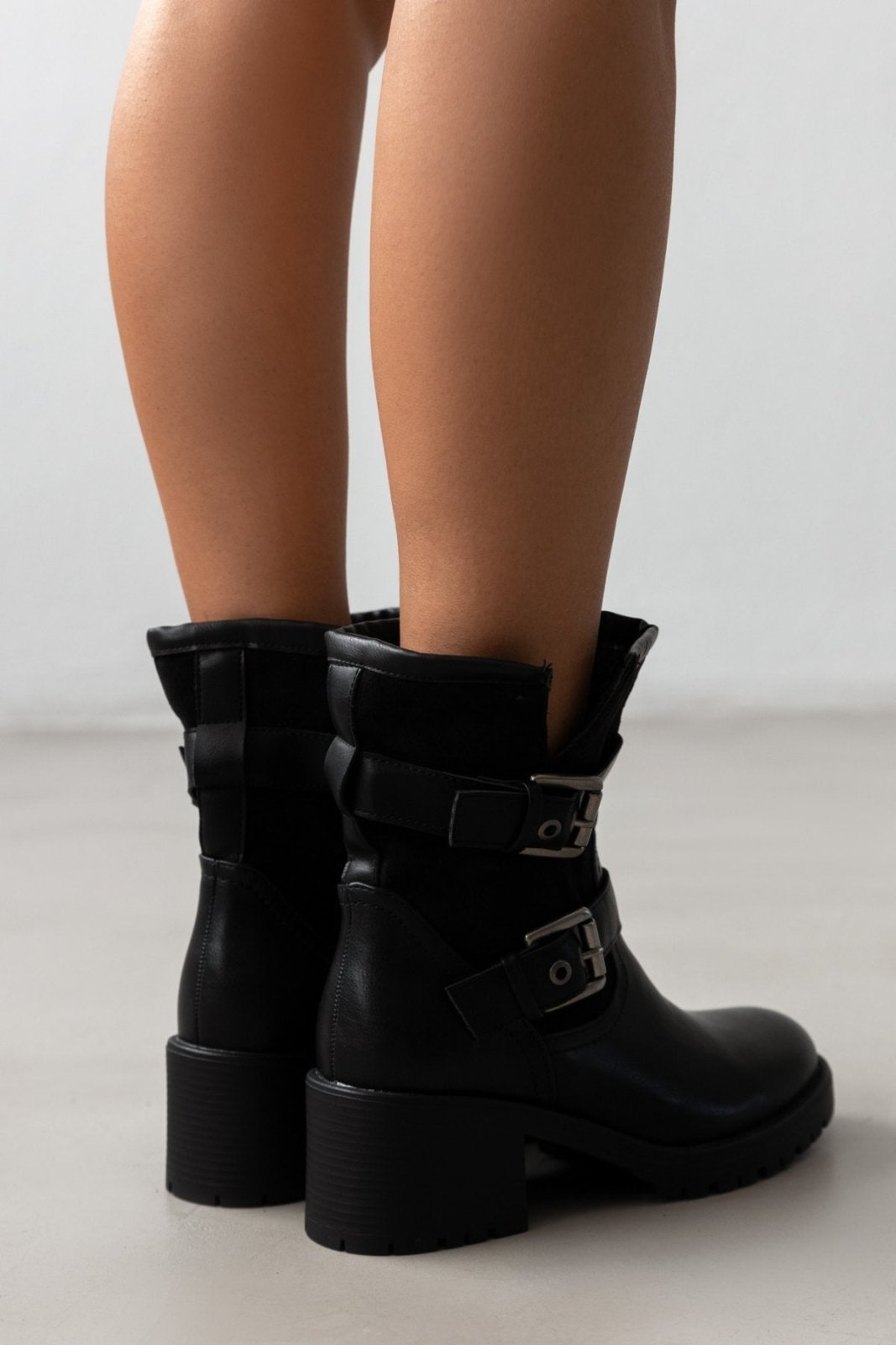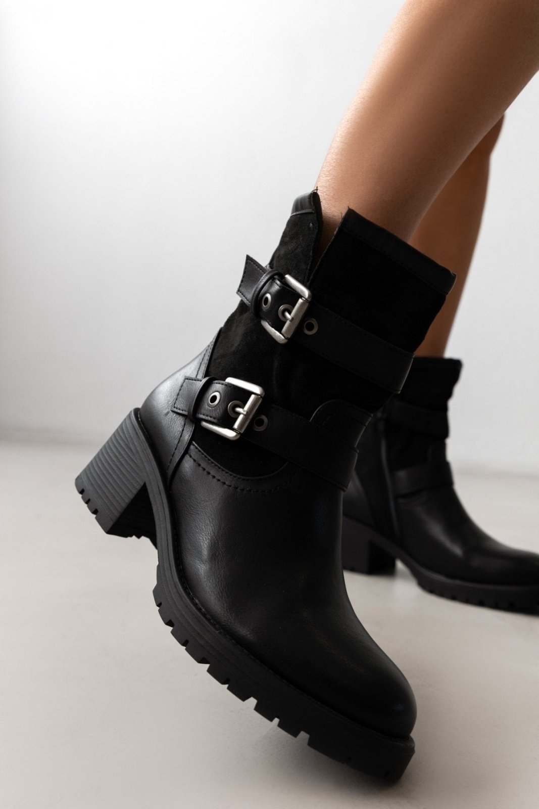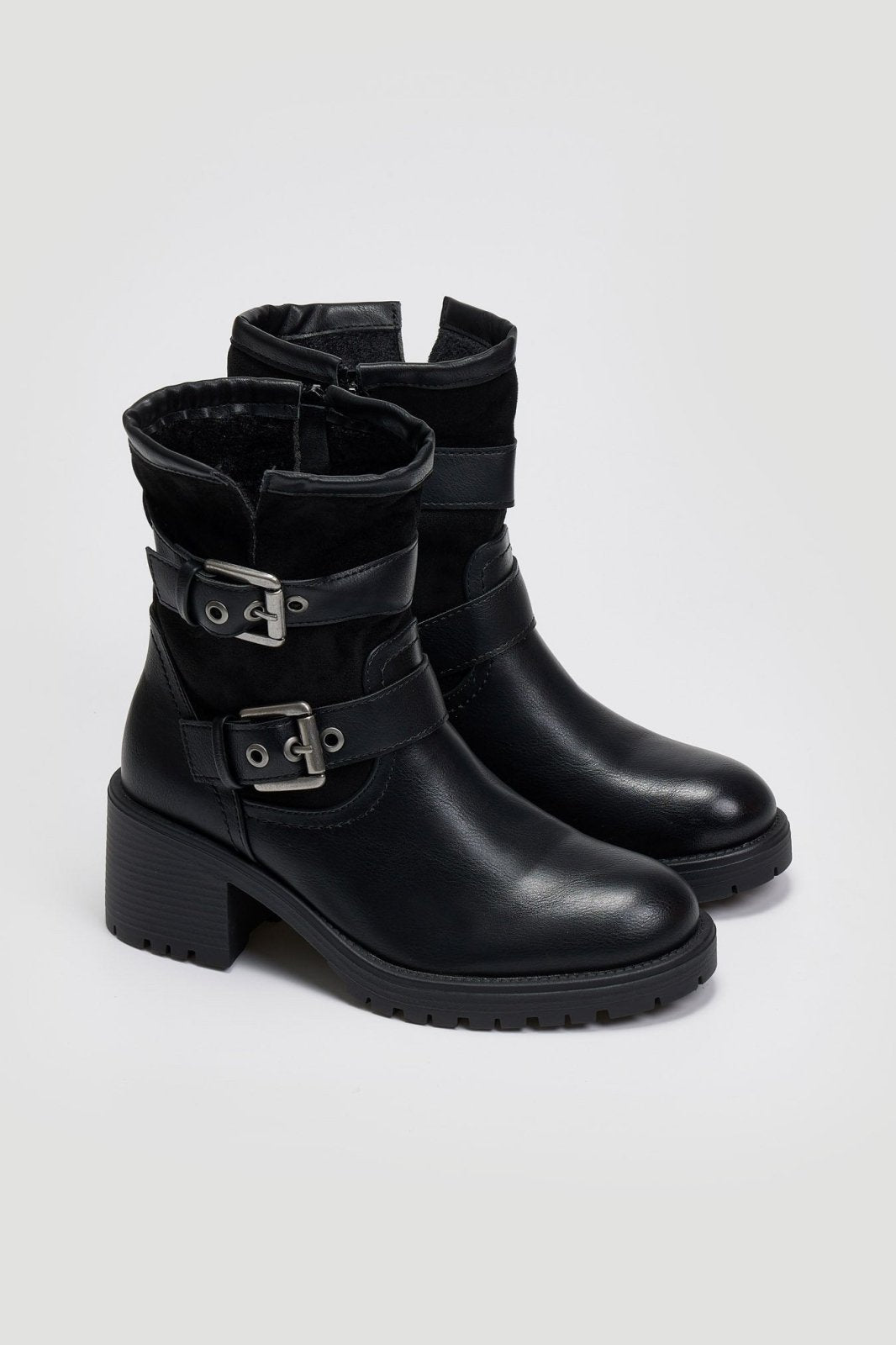 Μποτάκια σε συνδιασμό υλικών ERYNN. Έχουν λουράκια με μεταλλικούς τοκάδες. Στρογγυλή γραμμή. Χοντρό τετράγωνο τακούνι.