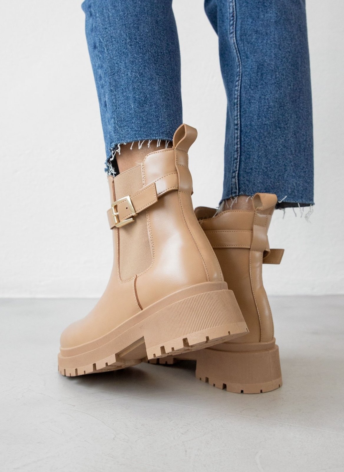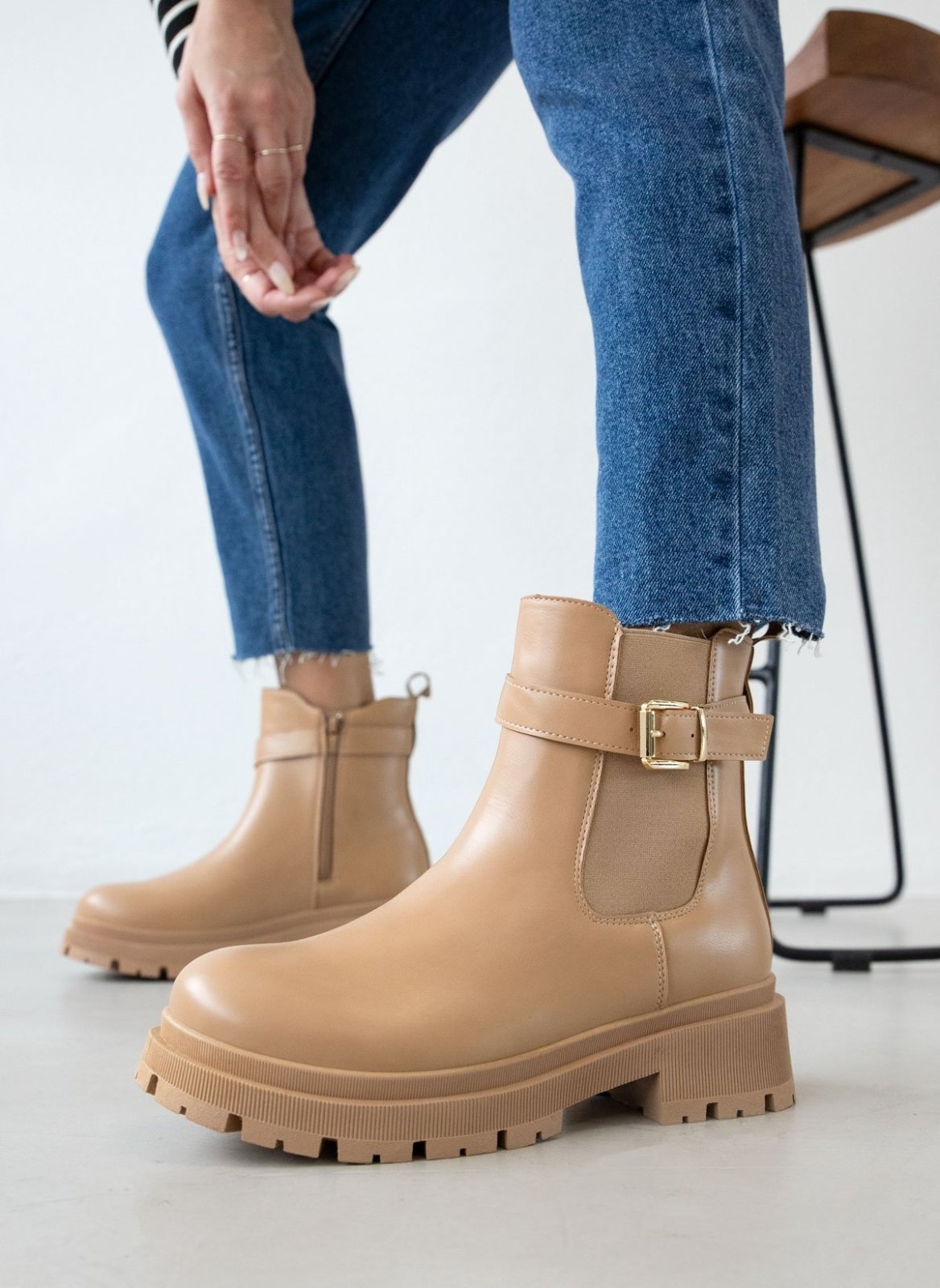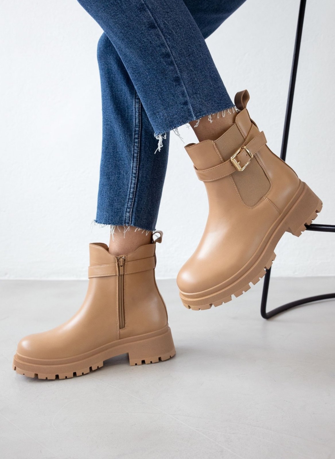 Μποτάκια biker με chunky Τρακτερωτή σόλα. Έχουν λαστιχο στην εξωτερική τους πλευρά. Ζωνάκι διακοσμητικό στο ύψος του αστραγάλου. Κλείνουν με φερμουάρ.