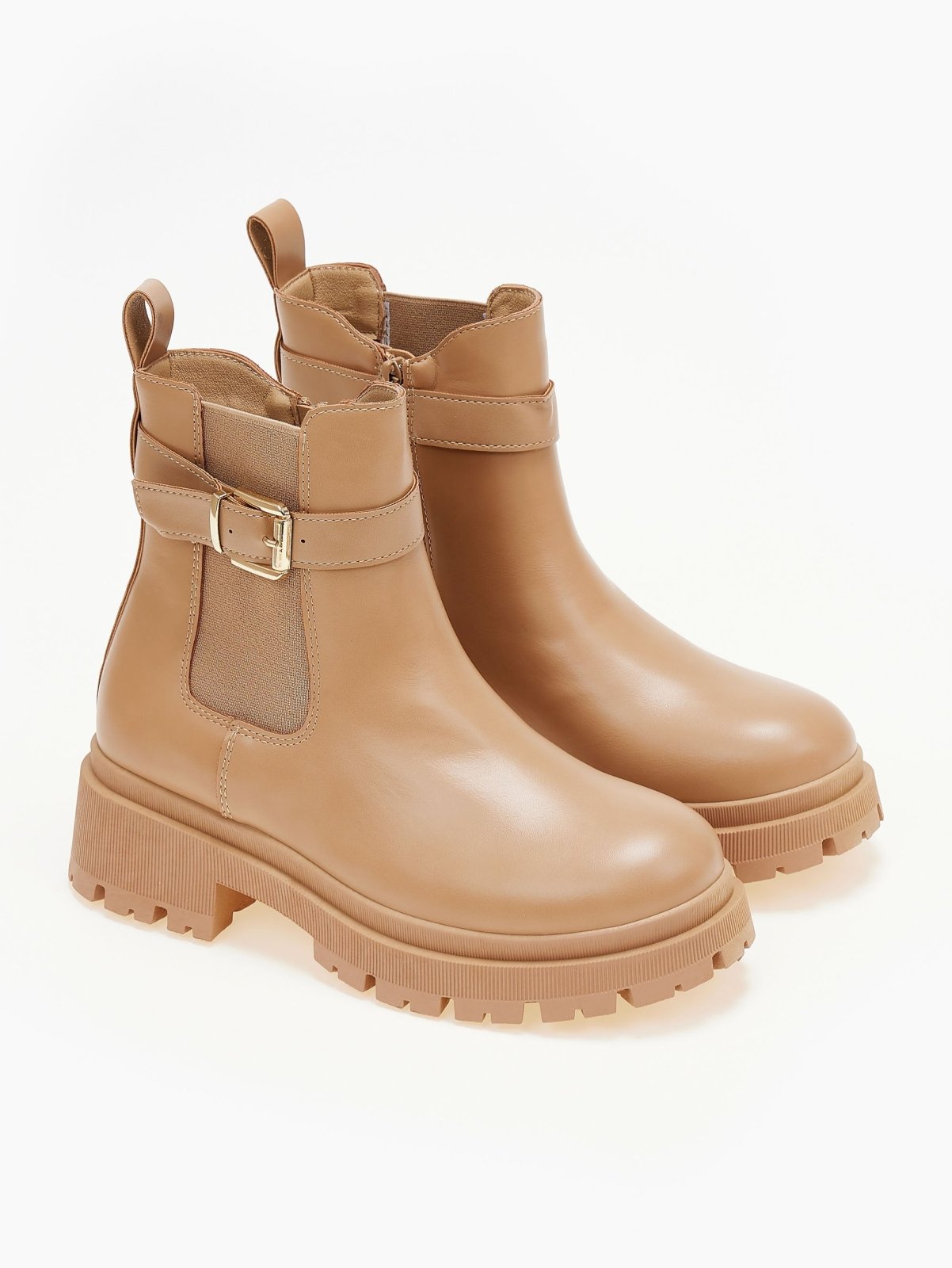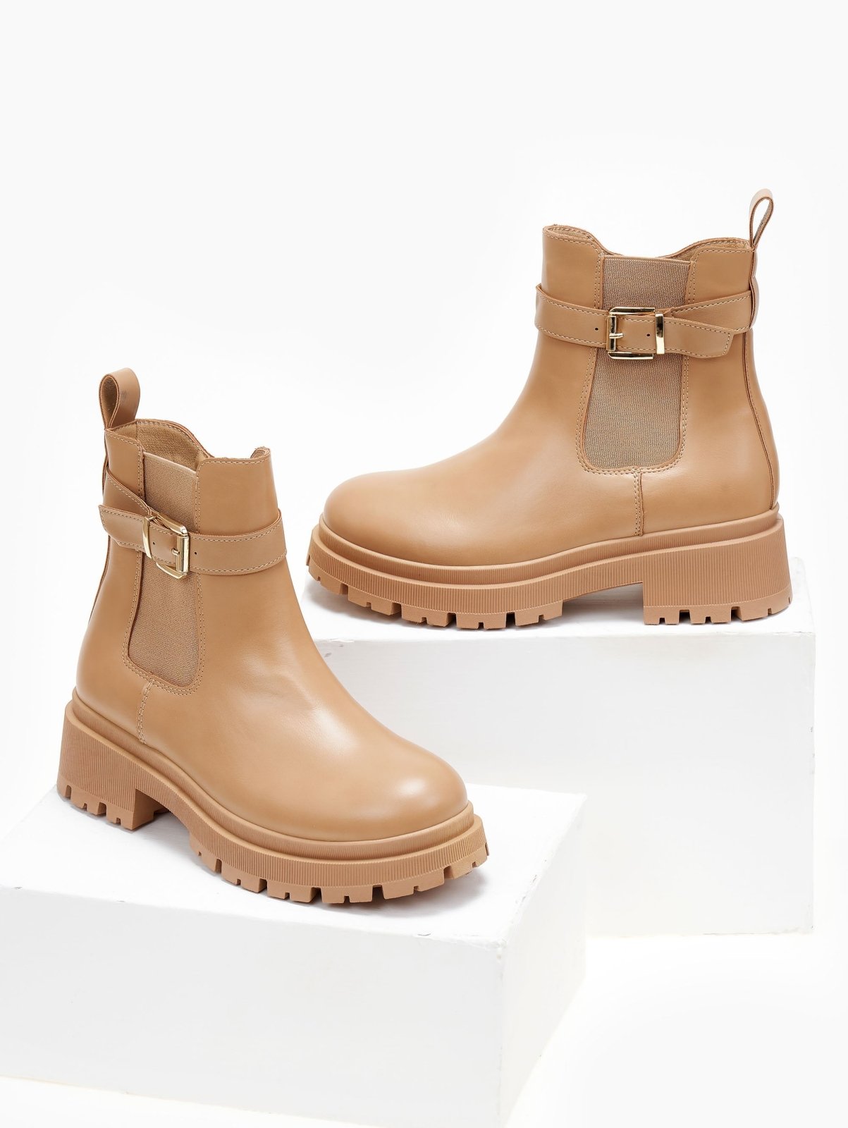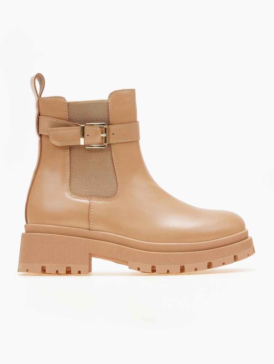 Μποτάκια biker με chunky Τρακτερωτή σόλα. Έχουν λαστιχο στην εξωτερική τους πλευρά. Ζωνάκι διακοσμητικό στο ύψος του αστραγάλου. Κλείνουν με φερμουάρ.