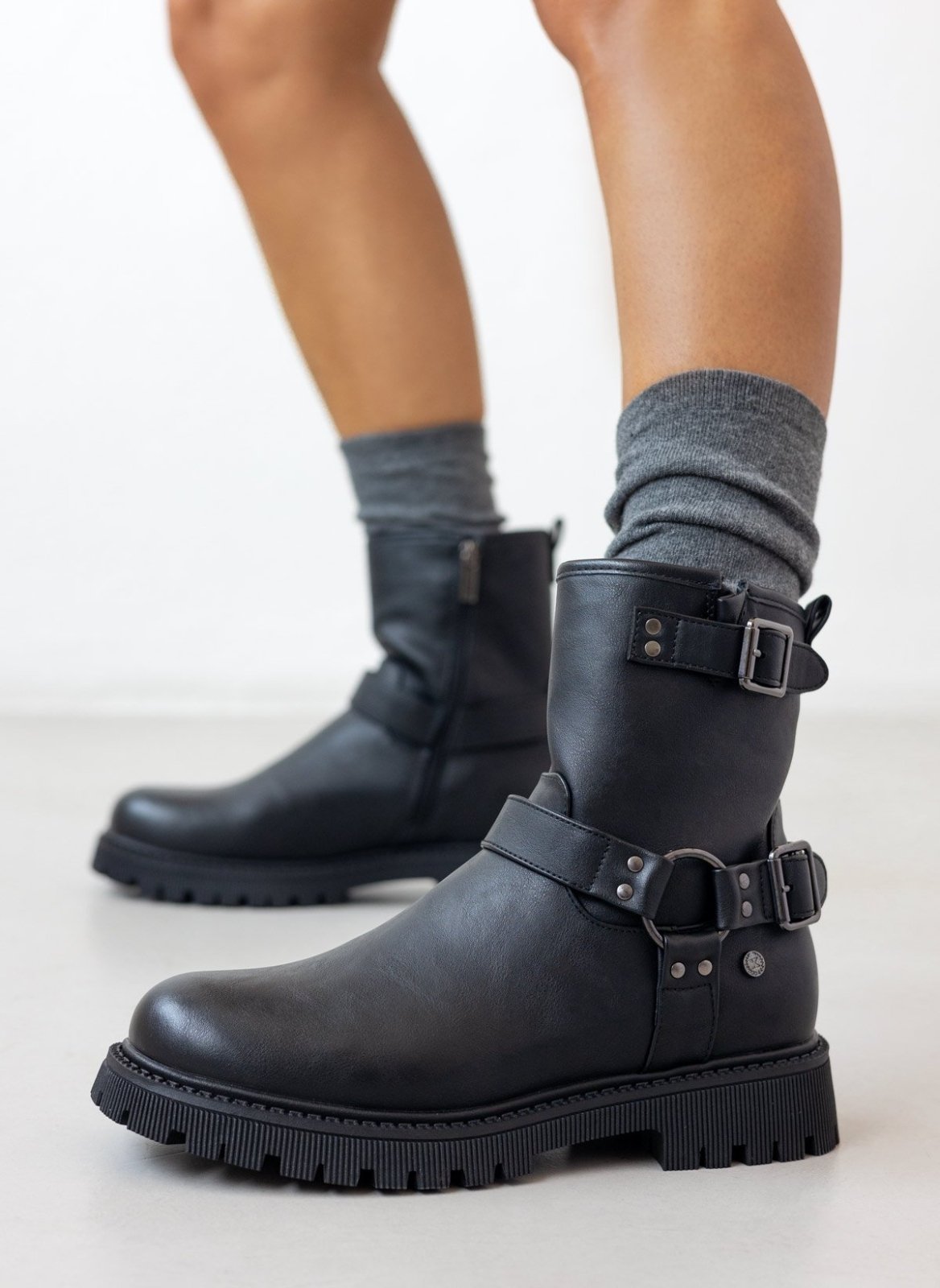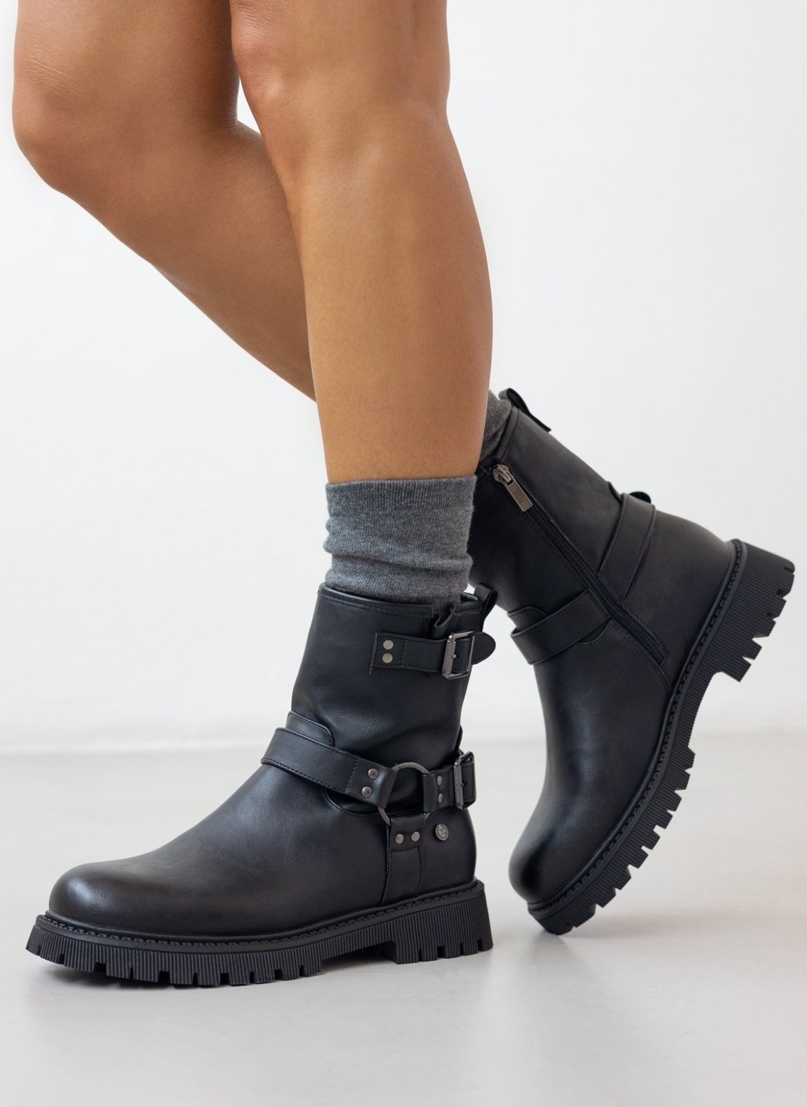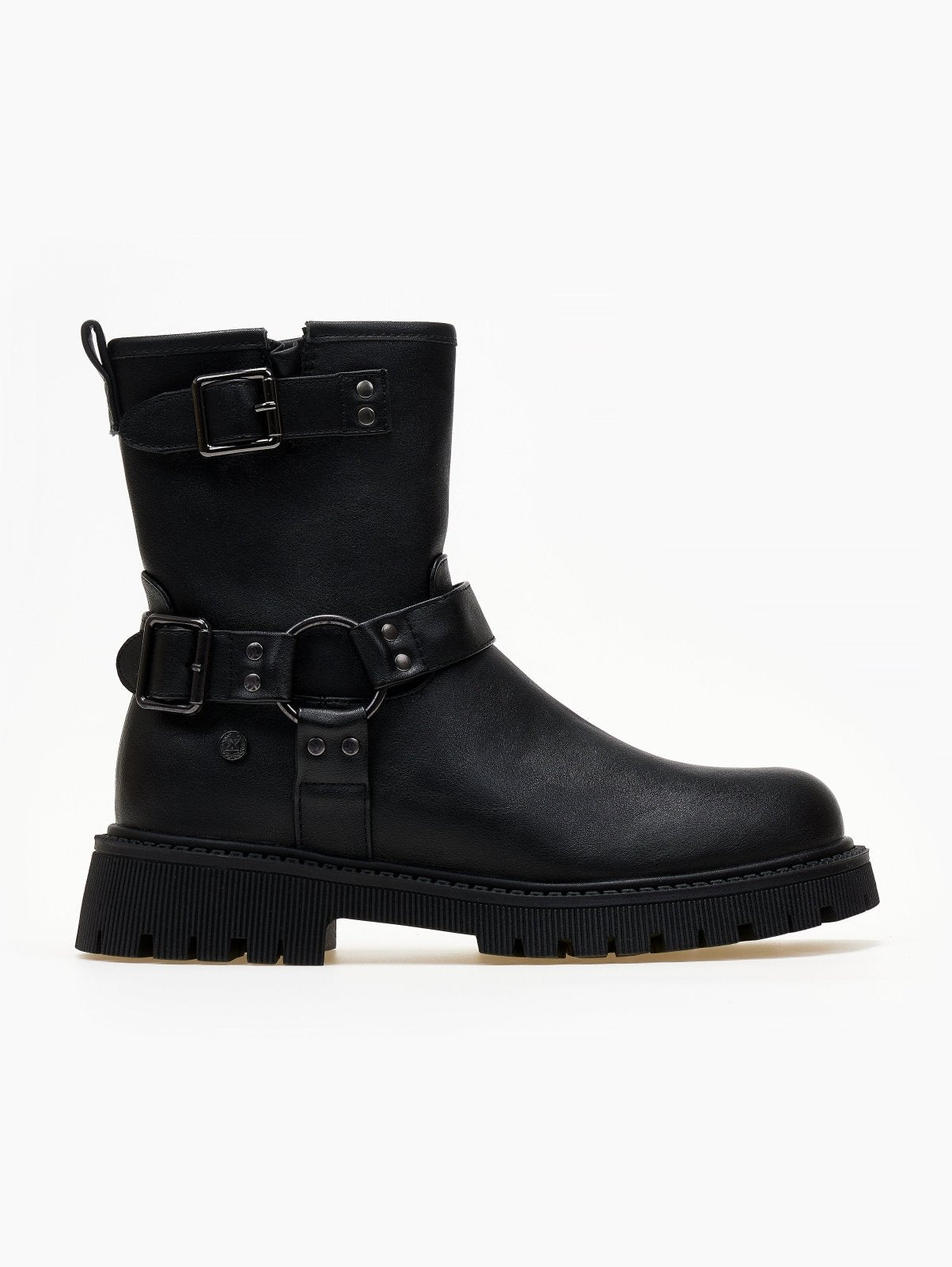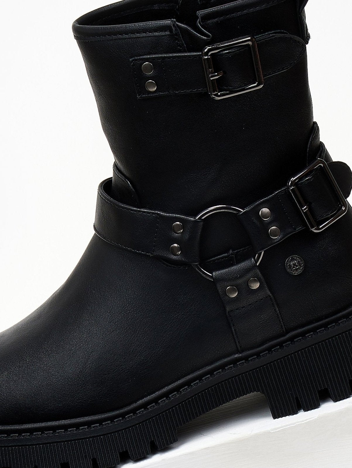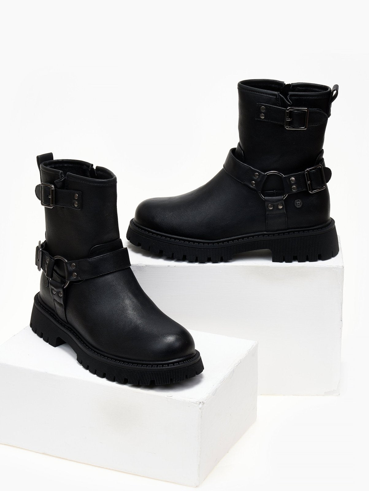 Μποτάκια biker με κρίκους Xti. Σόλα με ανάγλυφο σχέδιο. Κλείνουν με φερμουάρ στο πλάι. Comfort μαλακός πάτος με memory foam. Peta Vegan approved.