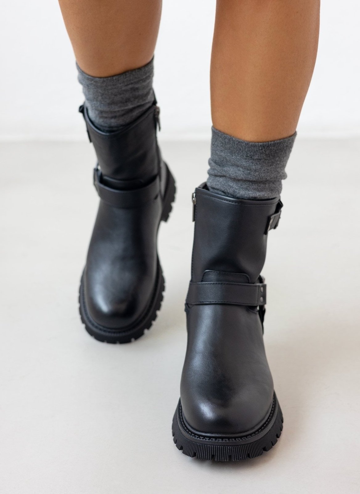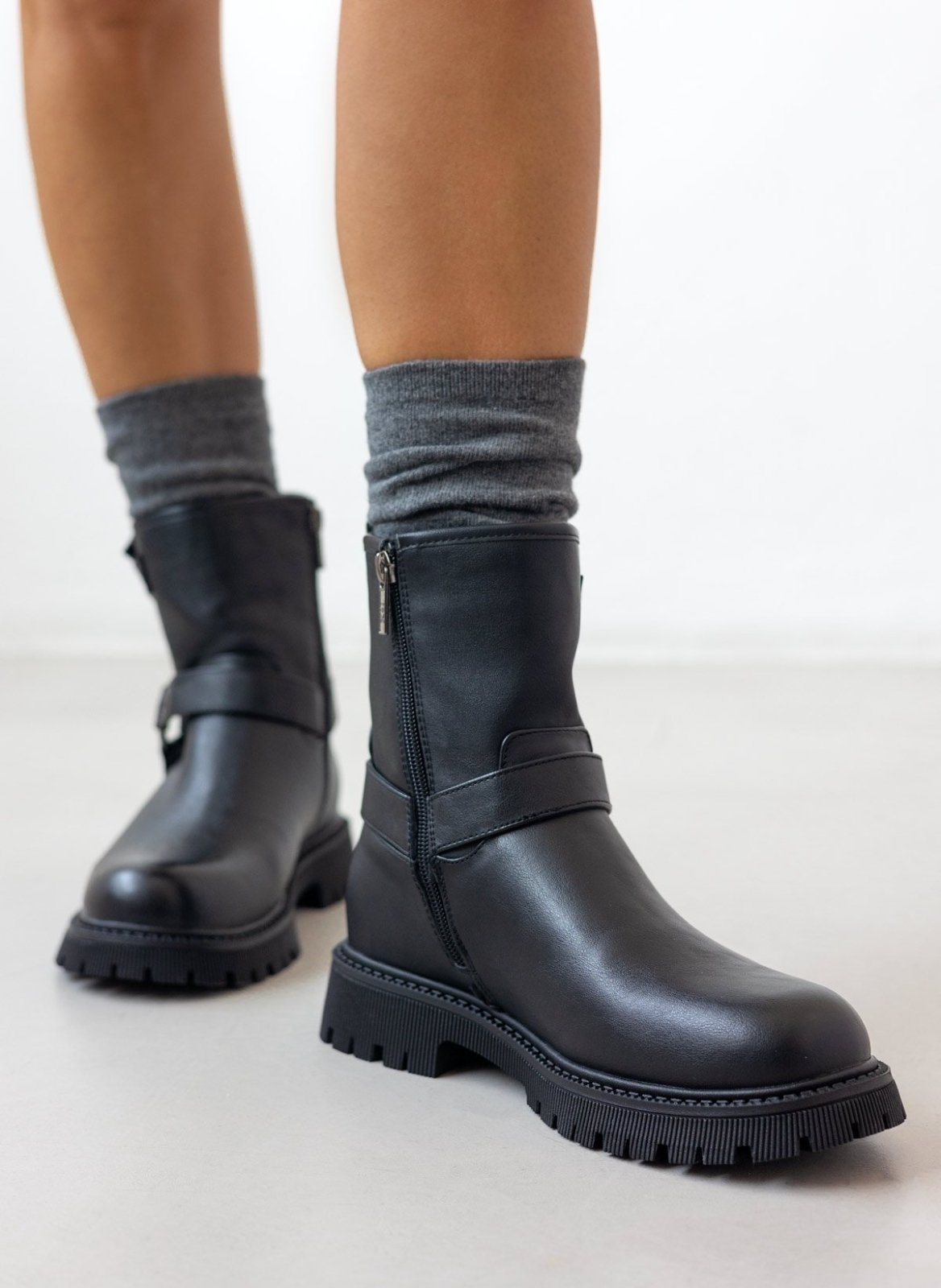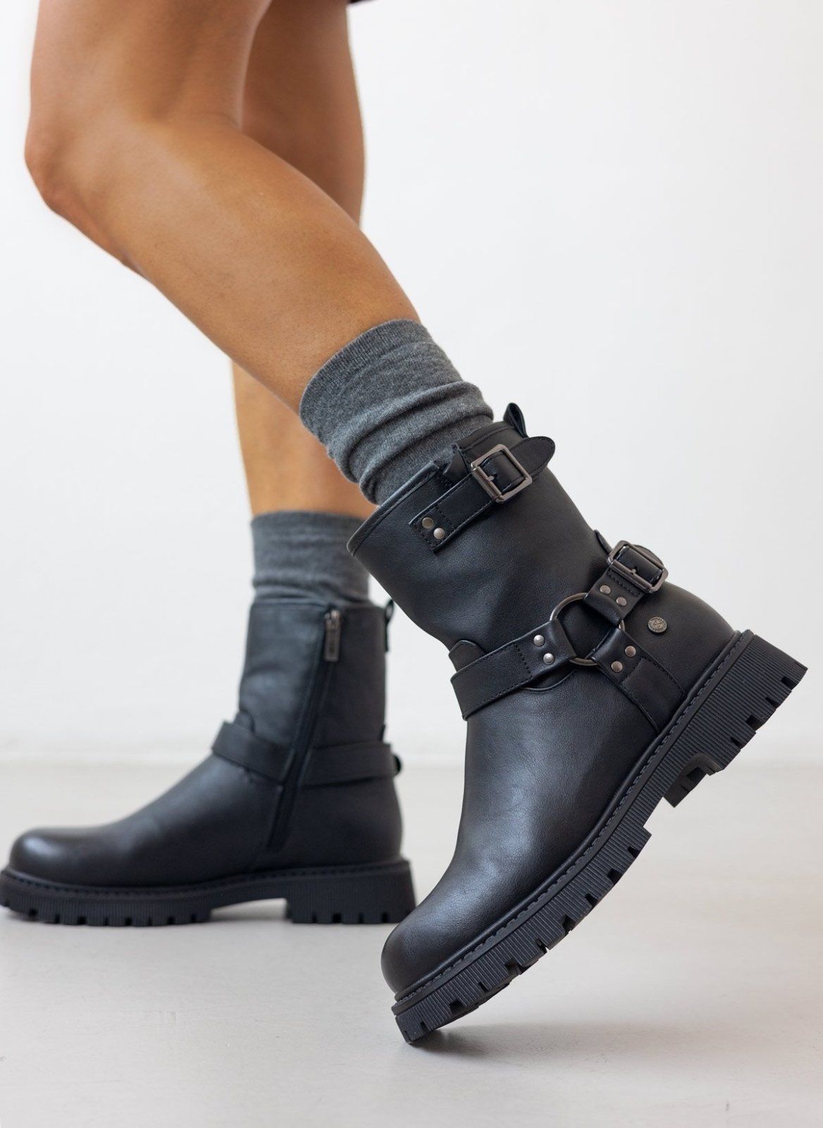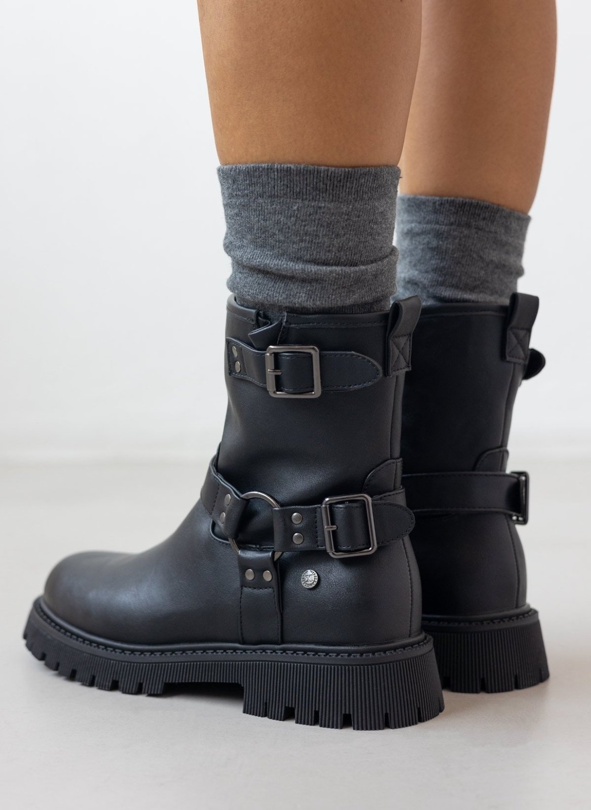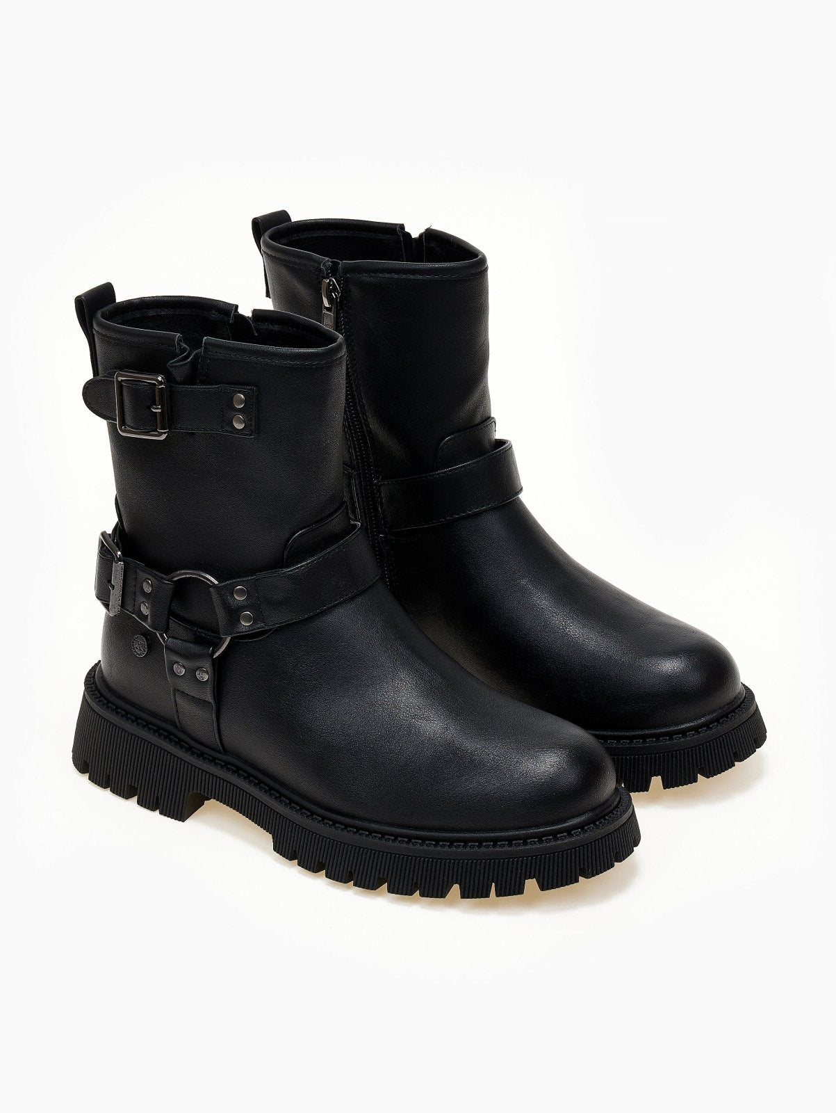 Μποτάκια biker με κρίκους Xti. Σόλα με ανάγλυφο σχέδιο. Κλείνουν με φερμουάρ στο πλάι. Comfort μαλακός πάτος με memory foam. Peta Vegan approved.