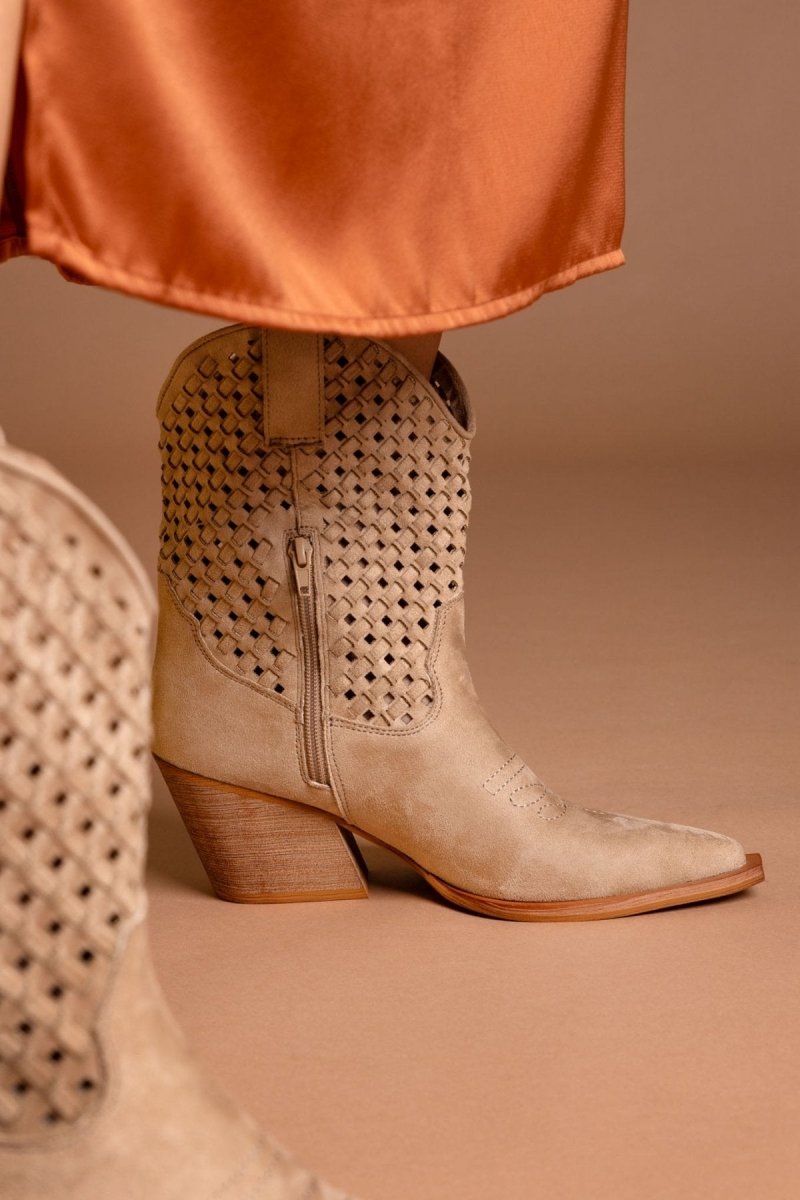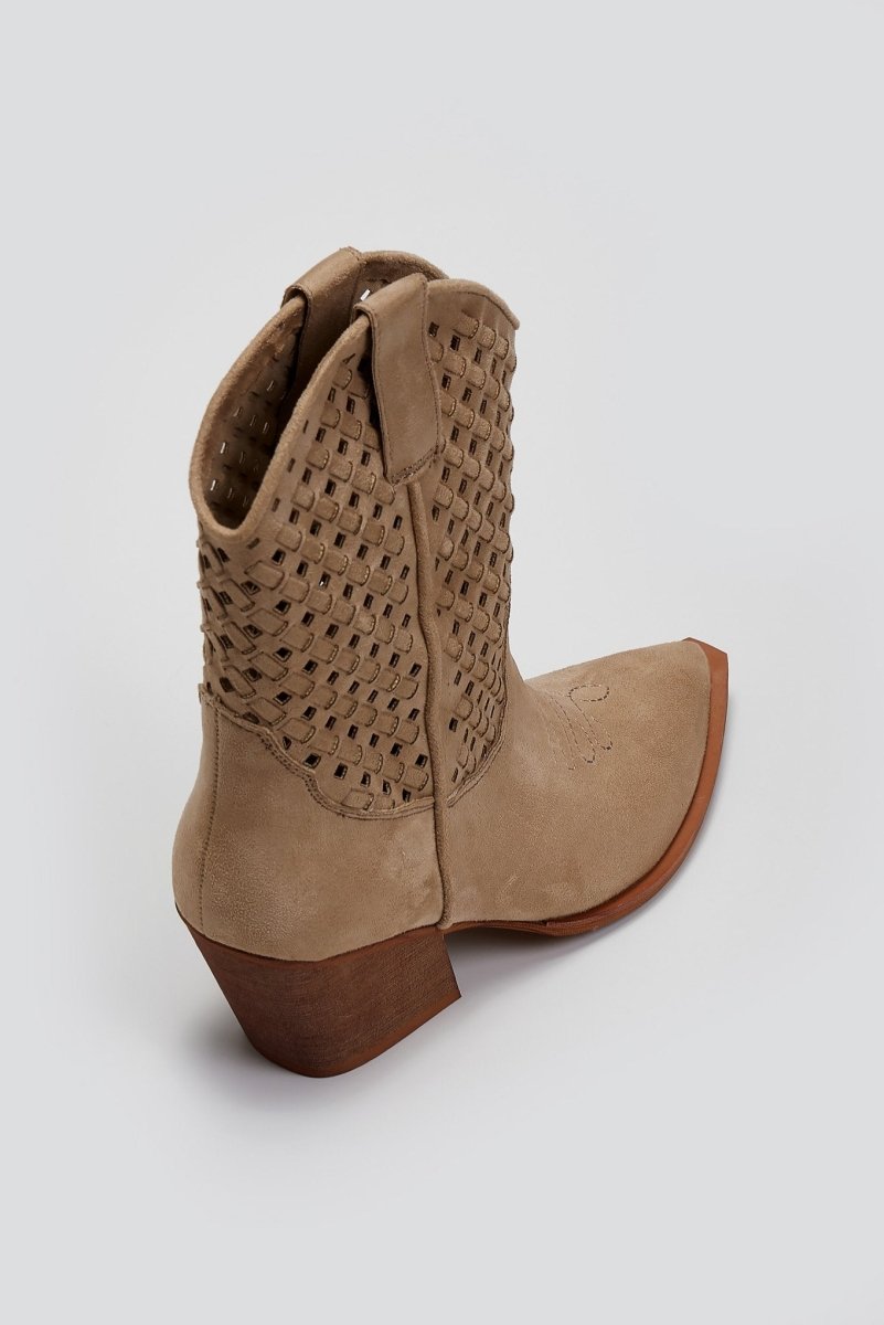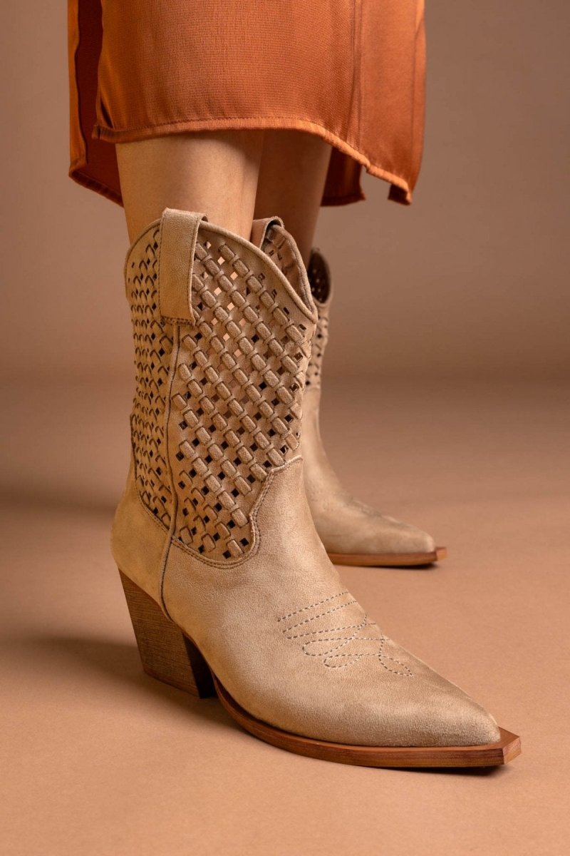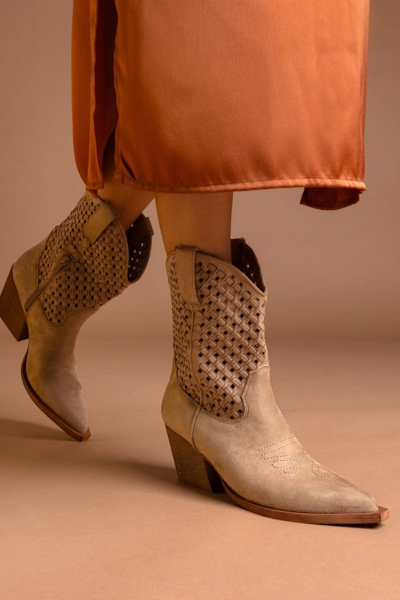 Μποτάκια μυτερά cowboy με διάτρητο σχέδιο CORINA. Σχέδιο με ραφές στο επάνω μέρος. Οβάλ τελείωμα με θηλάκια. Ξύλινο τακούνι