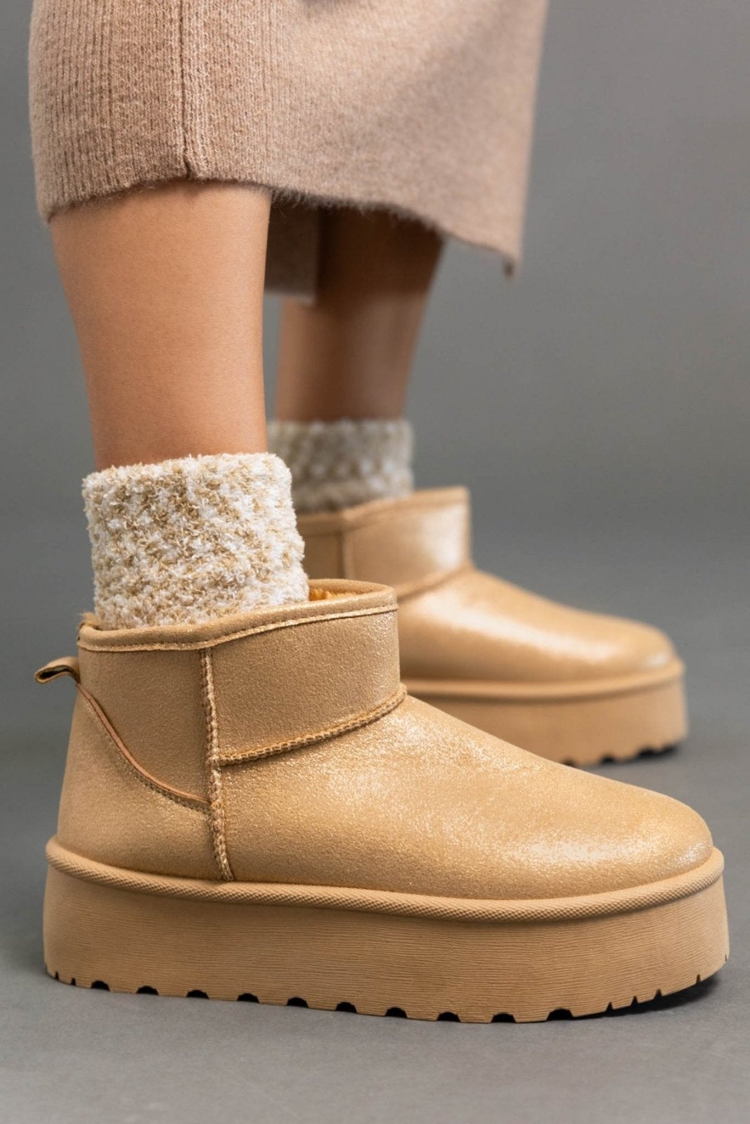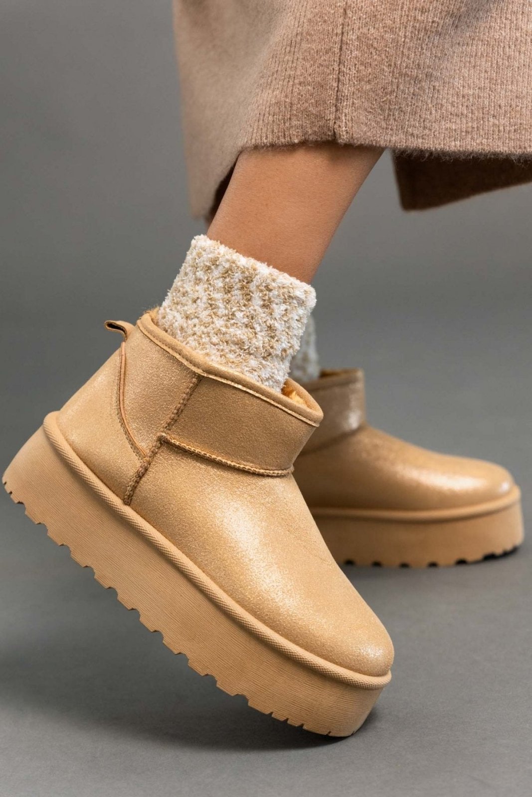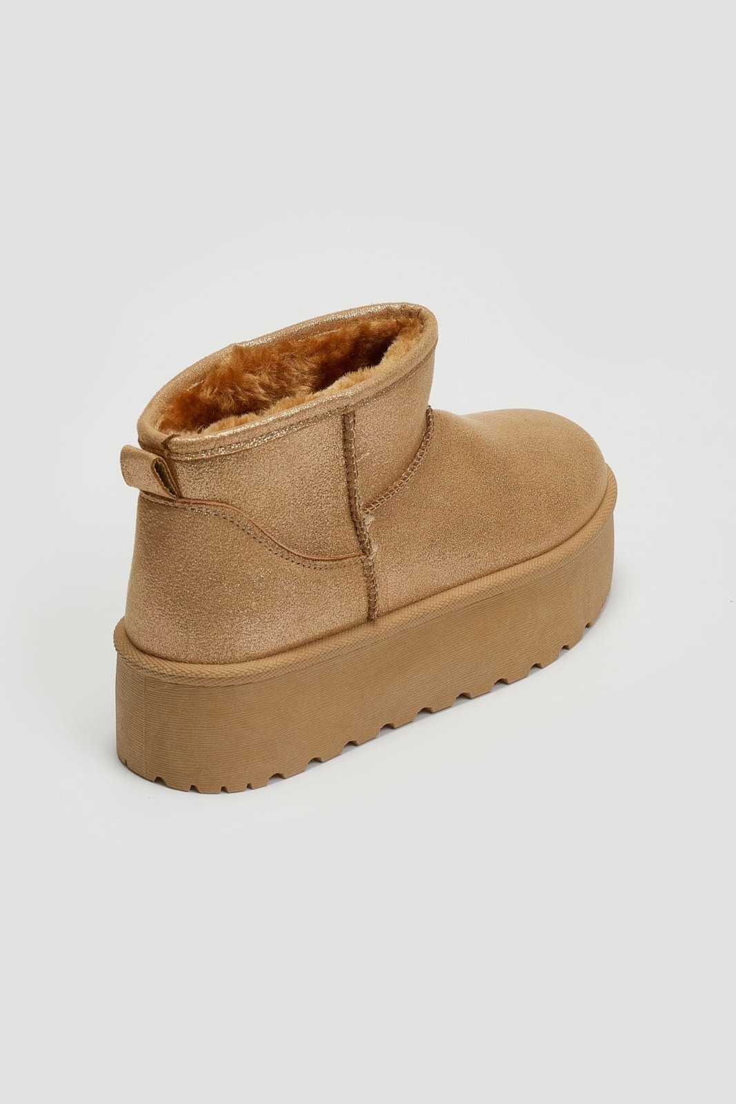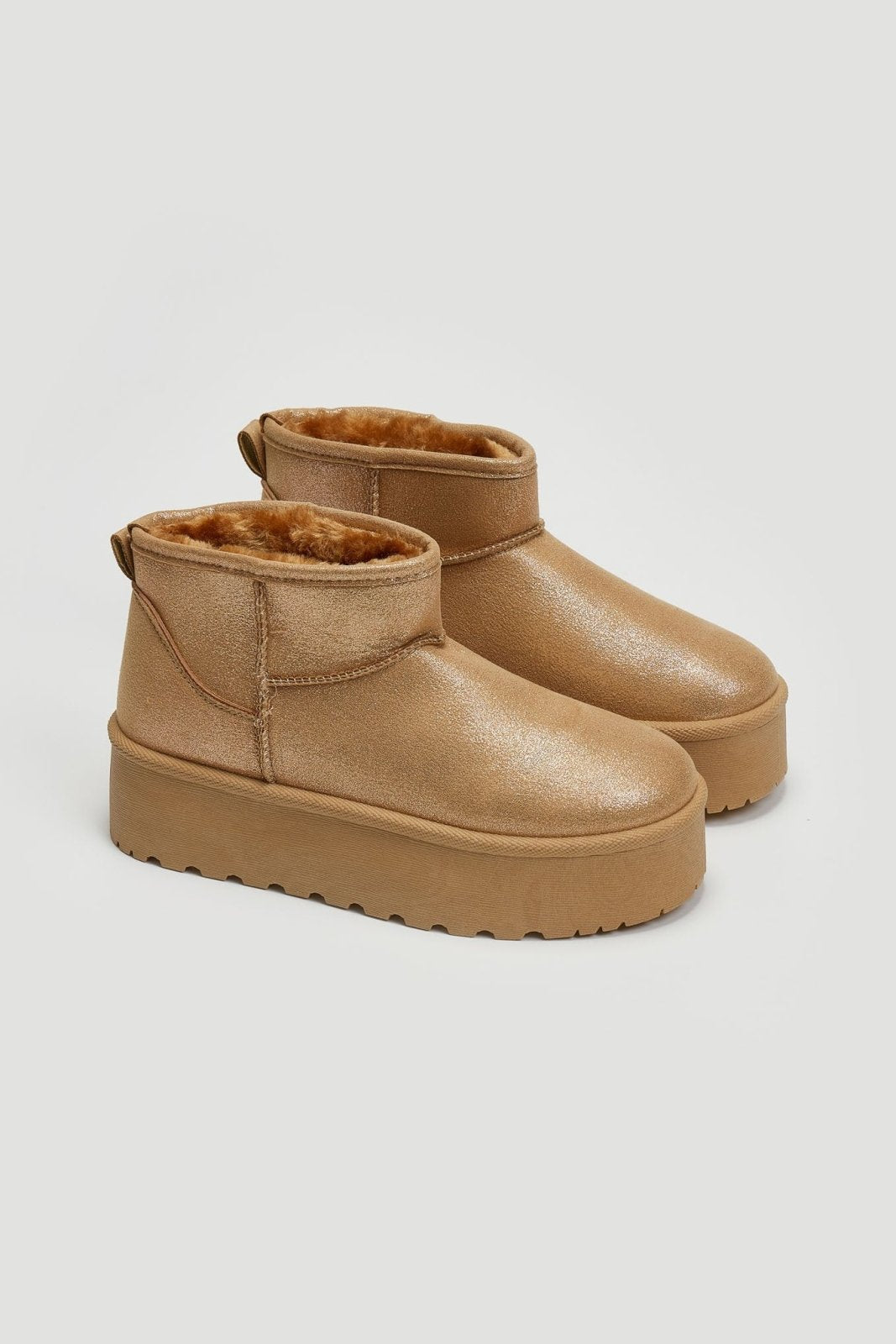 Μποτάκια κοντά σε γυαλιστερές αποχρώσεις ERYNN. Επένδυση με συνθετική γούνα. Ψηλή flatform σόλα.