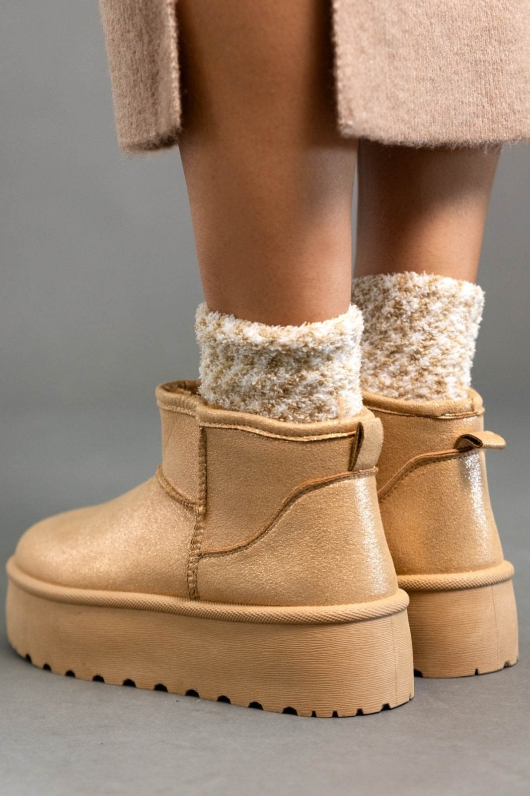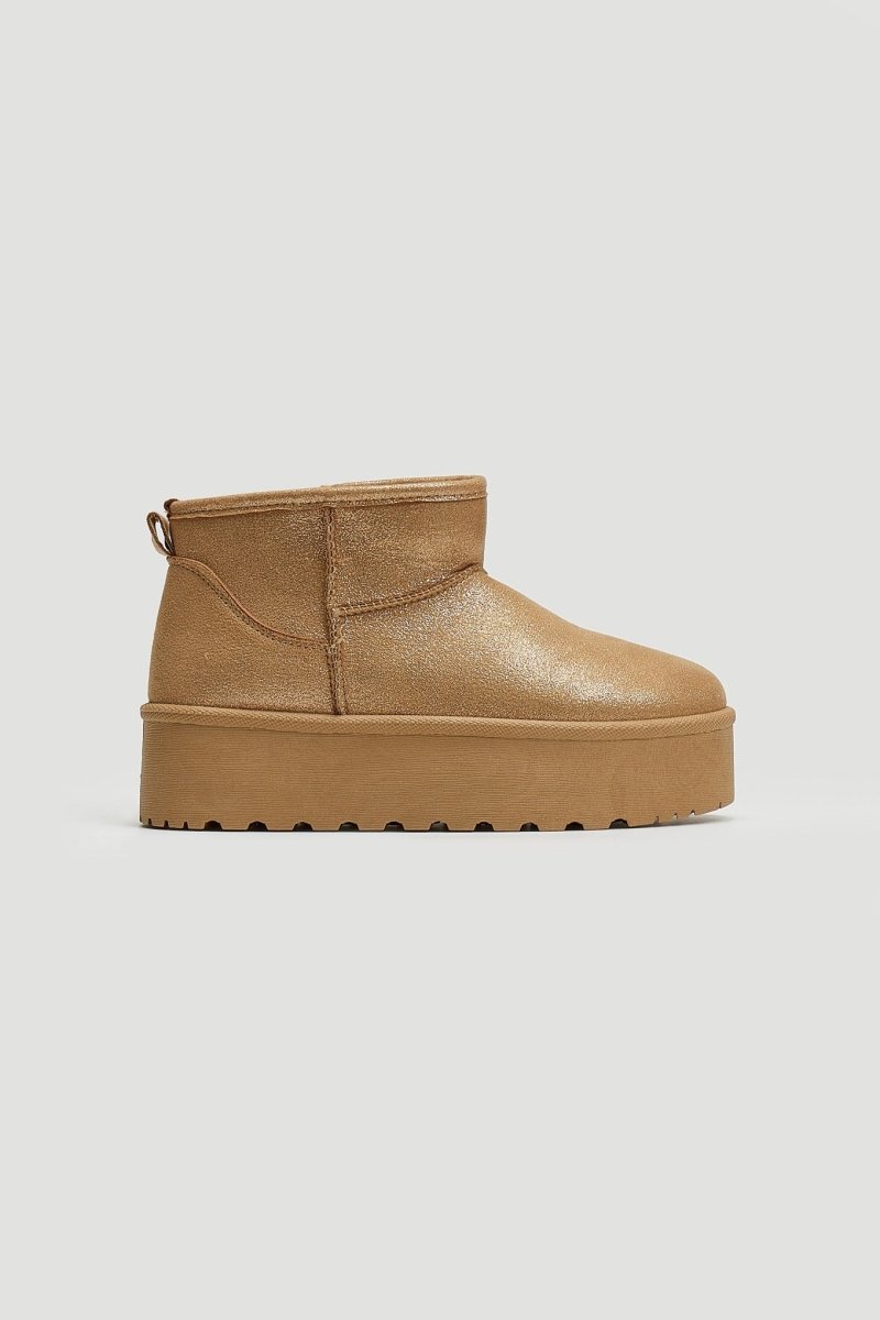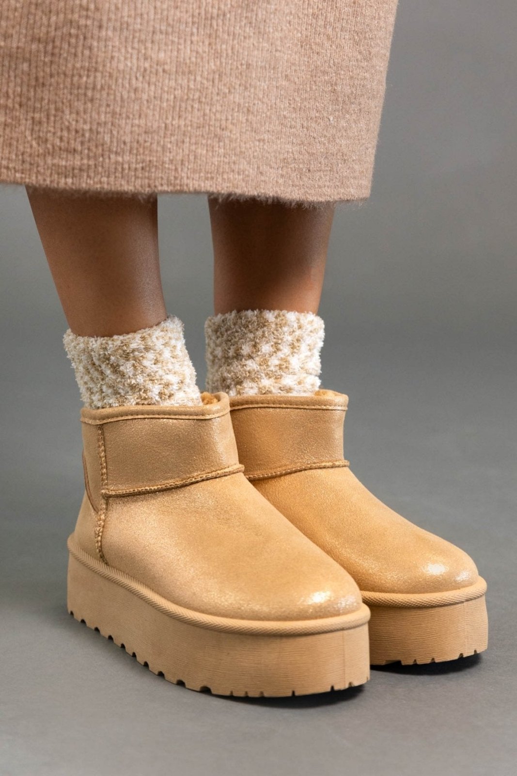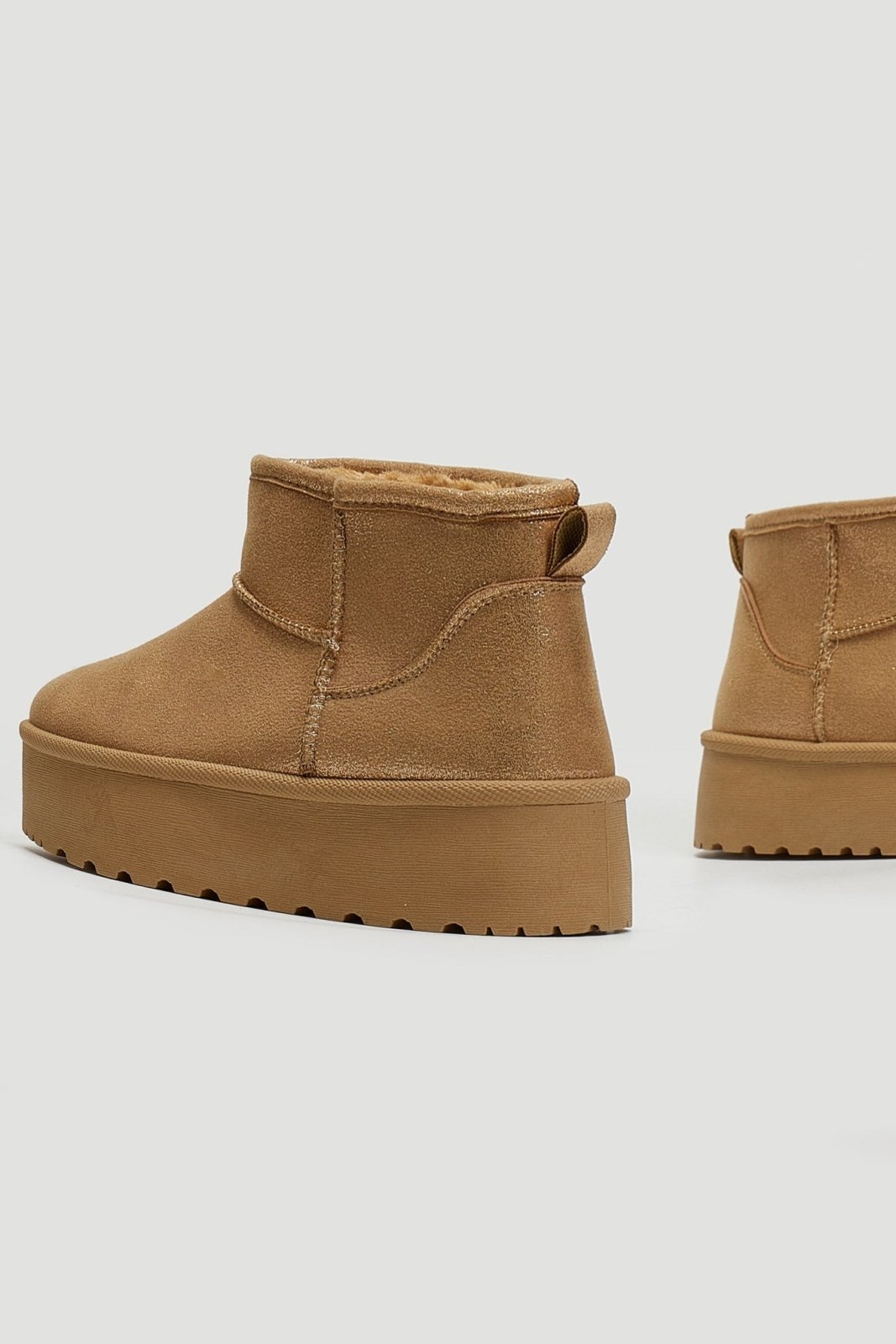 Μποτάκια κοντά σε γυαλιστερές αποχρώσεις ERYNN. Επένδυση με συνθετική γούνα. Ψηλή flatform σόλα.