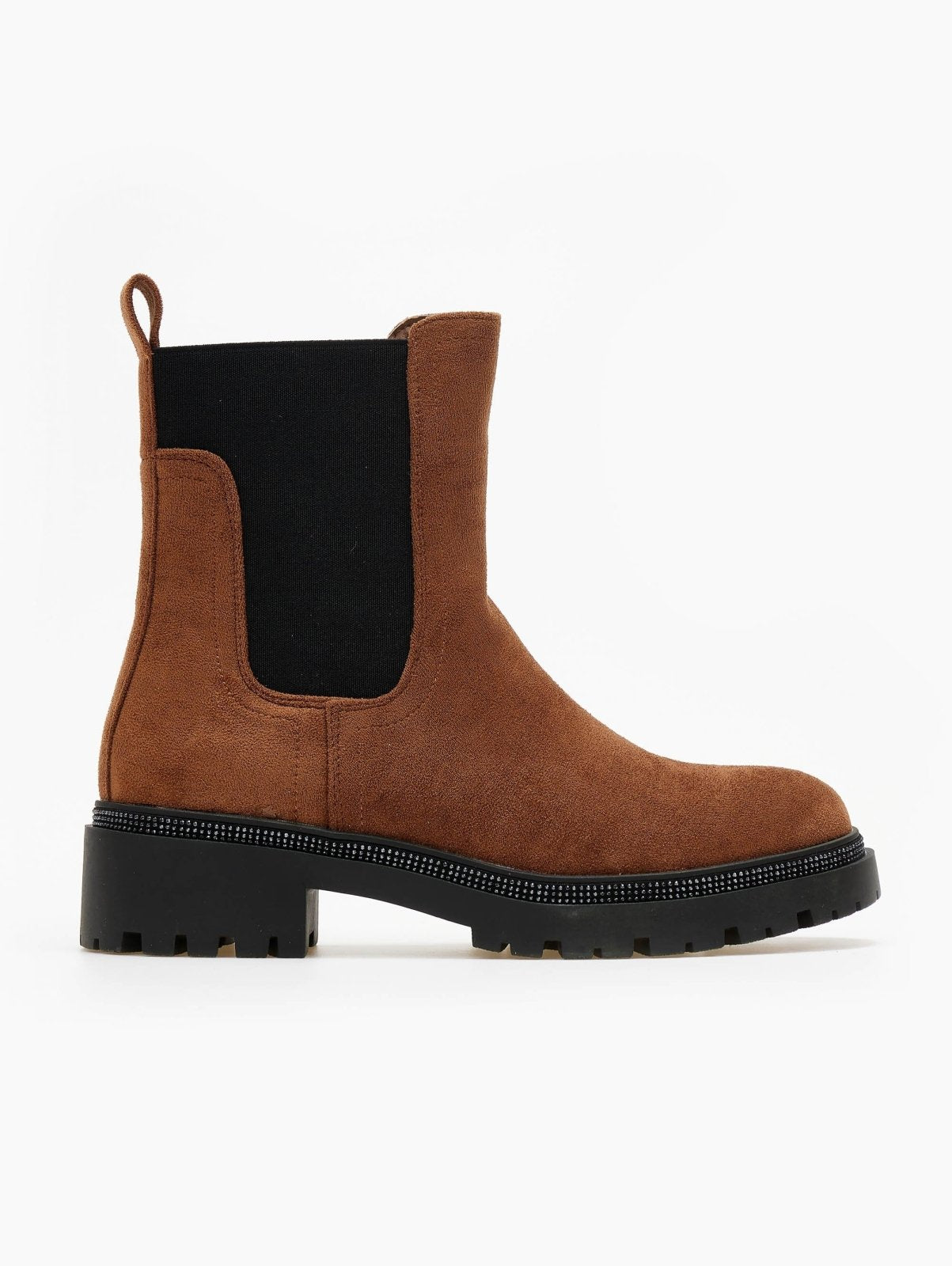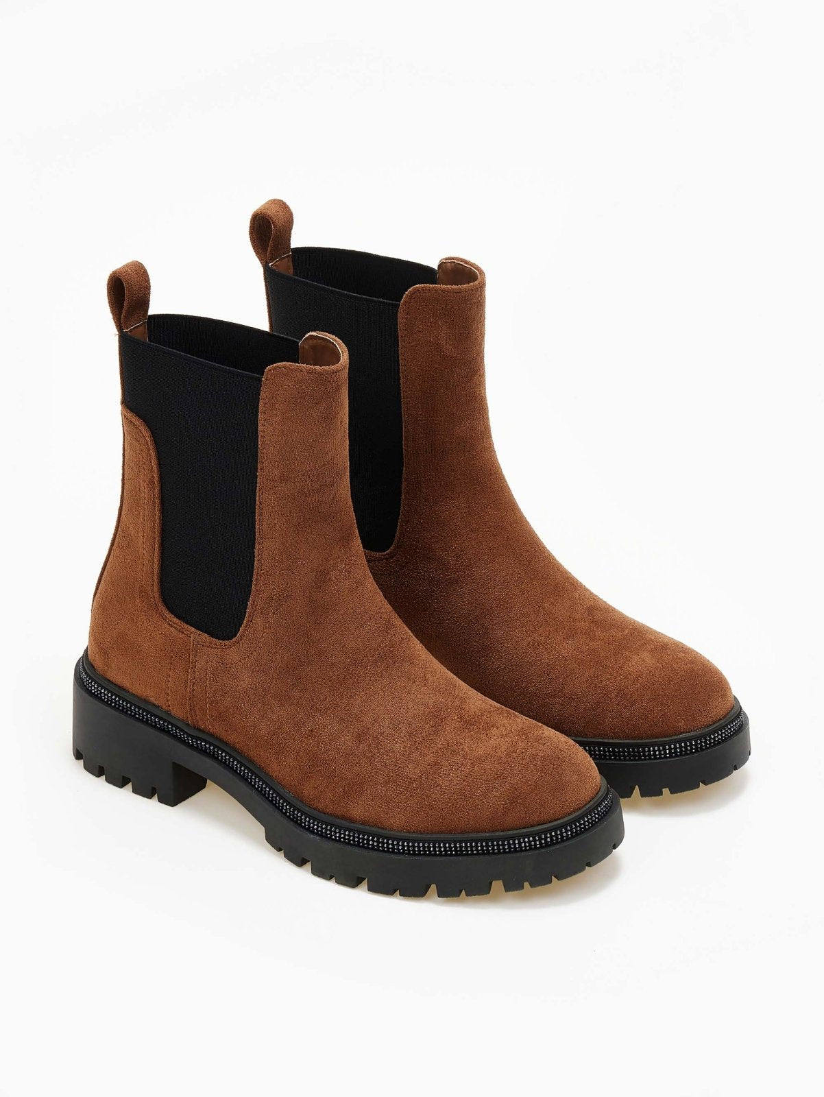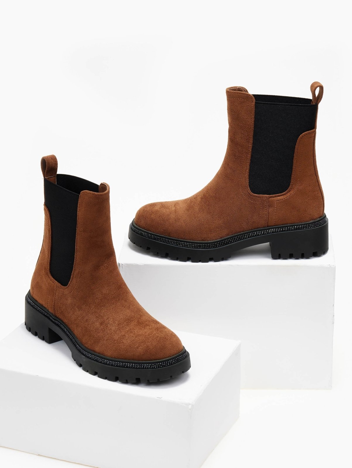 Μποτάκια suede με τρακτερωτή σόλα και χαμηλό τακούνι ERYNN. Έχουν λάστιχο στα πλαϊνά. Θηλάκια στο τελείωμα. Λεπτομέρεια με strassπεριμετρικά της σόλας.