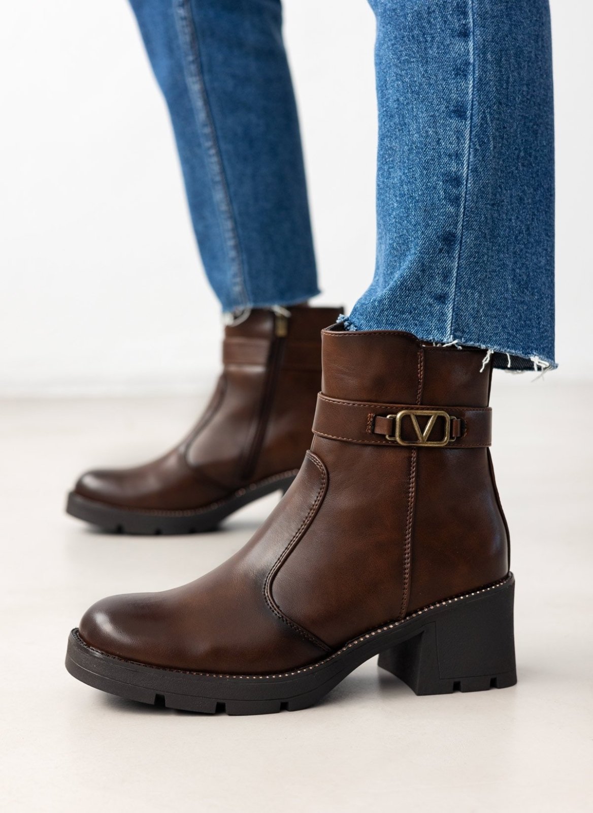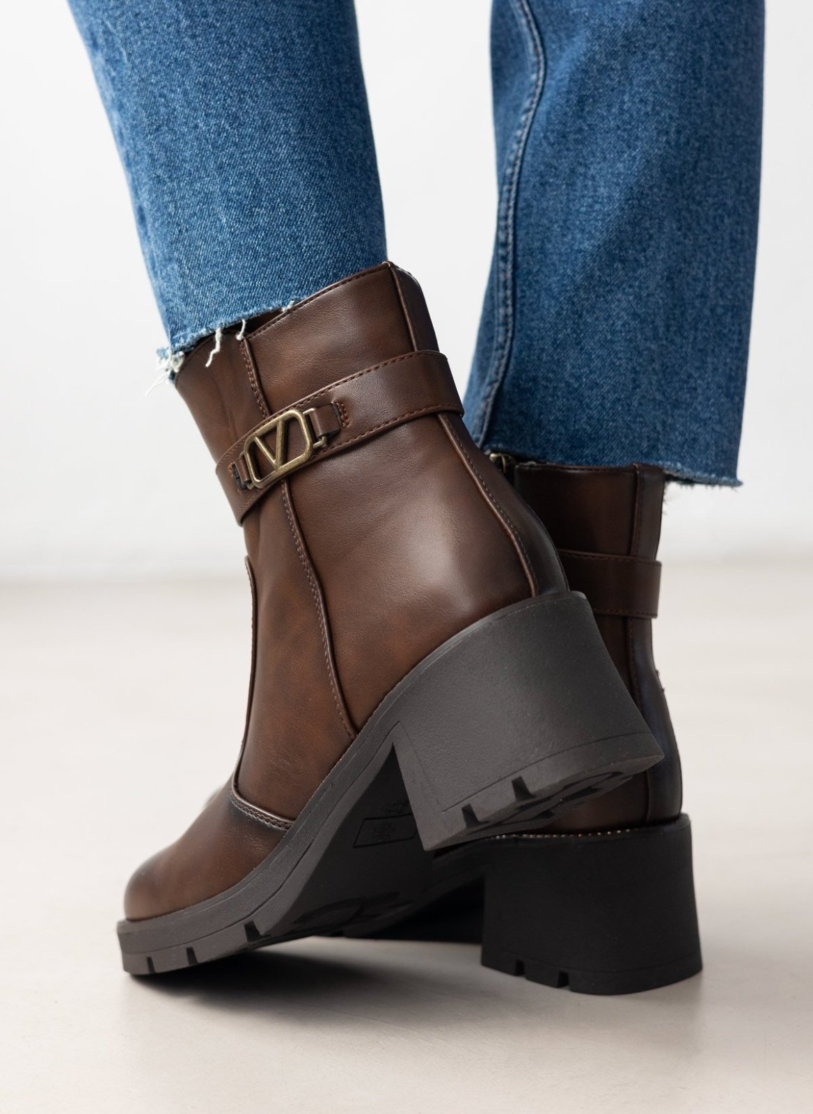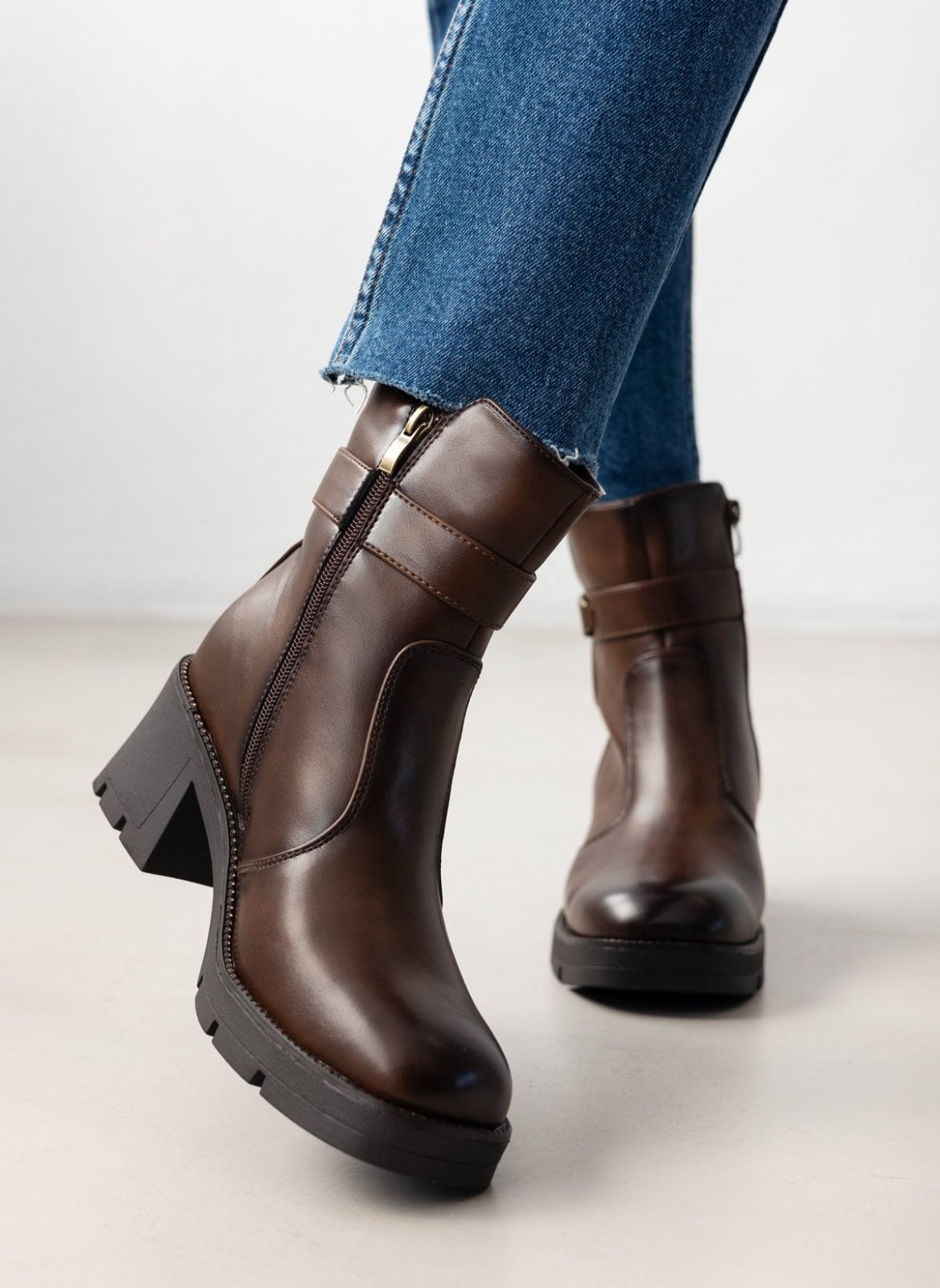 Μποτάκια με ζωνάκι και τοκά. Χοντρό τετράγωνο τακούνι. Λεπτομέρεια με στρας περιμετρικά της σόλας. Καρέ γραμμή.