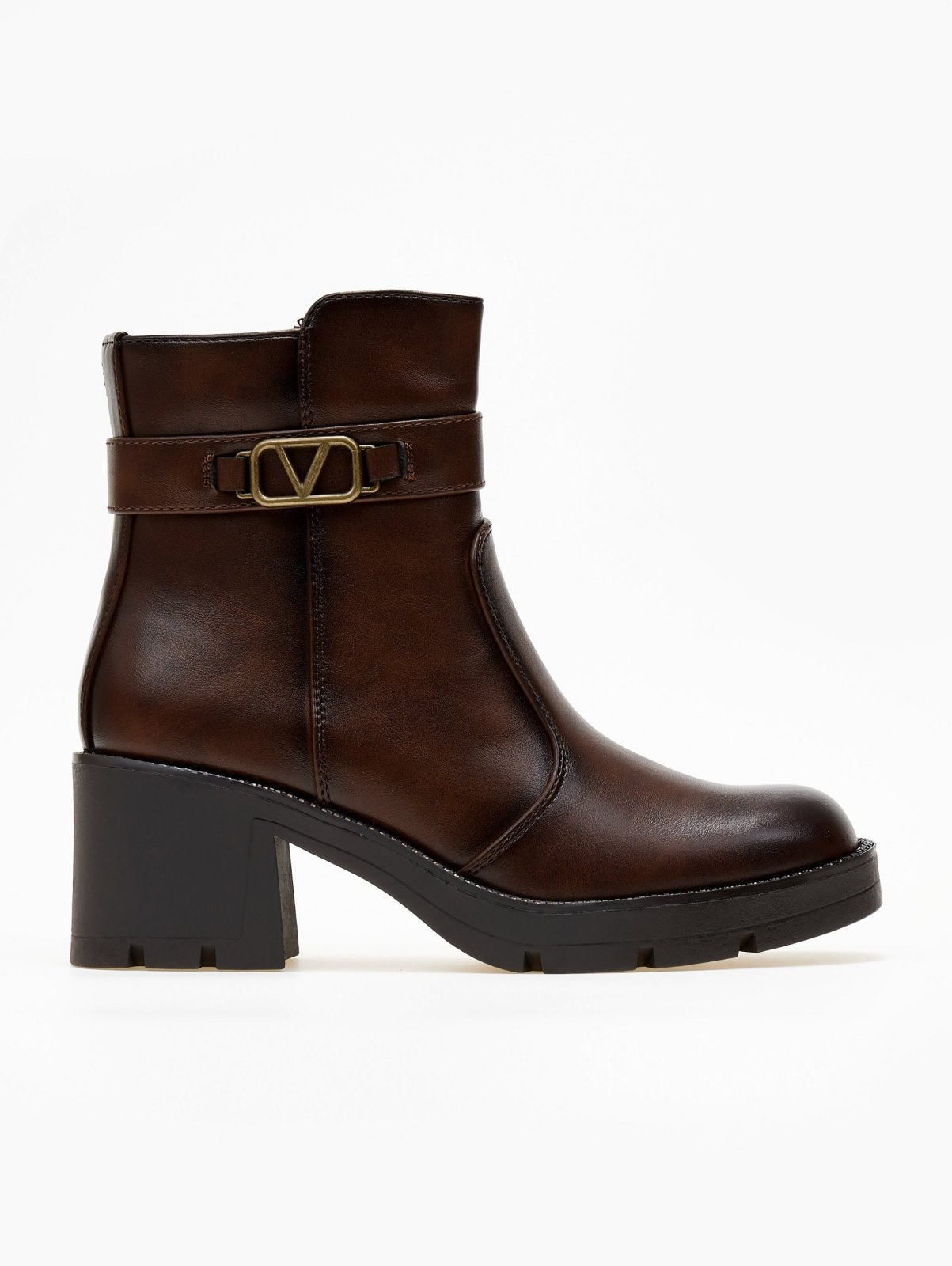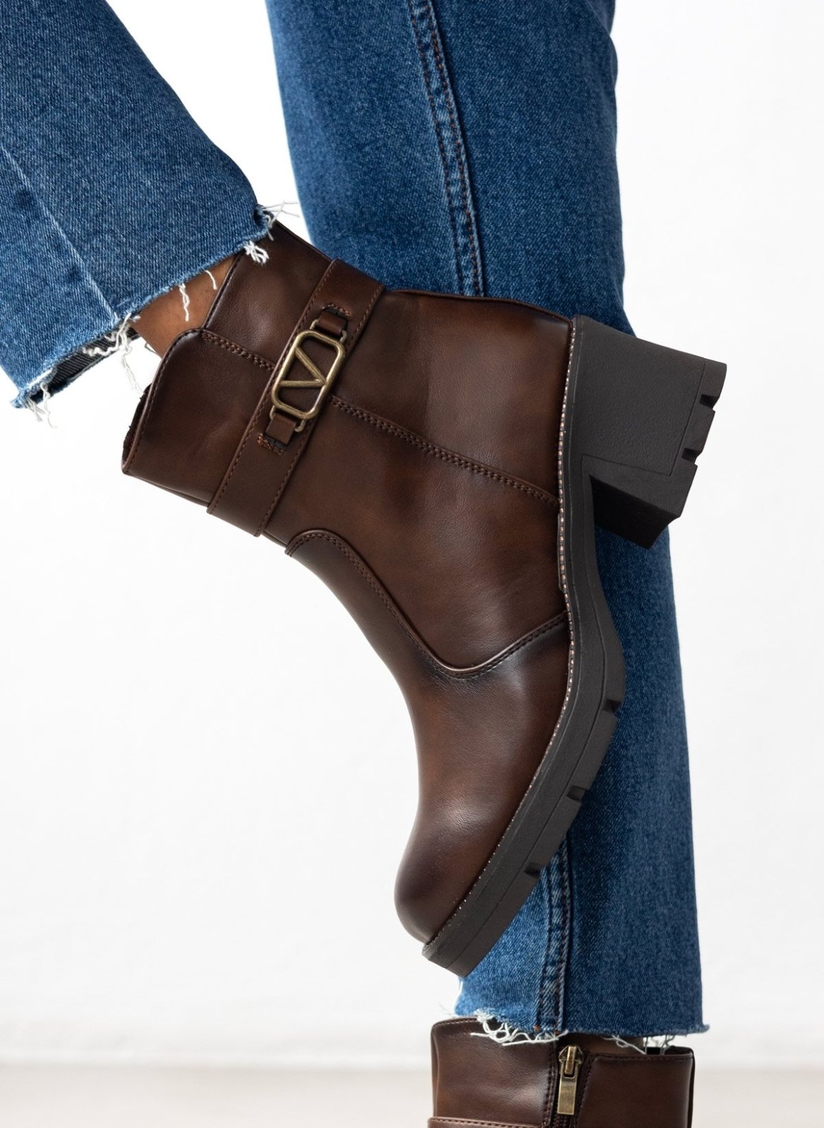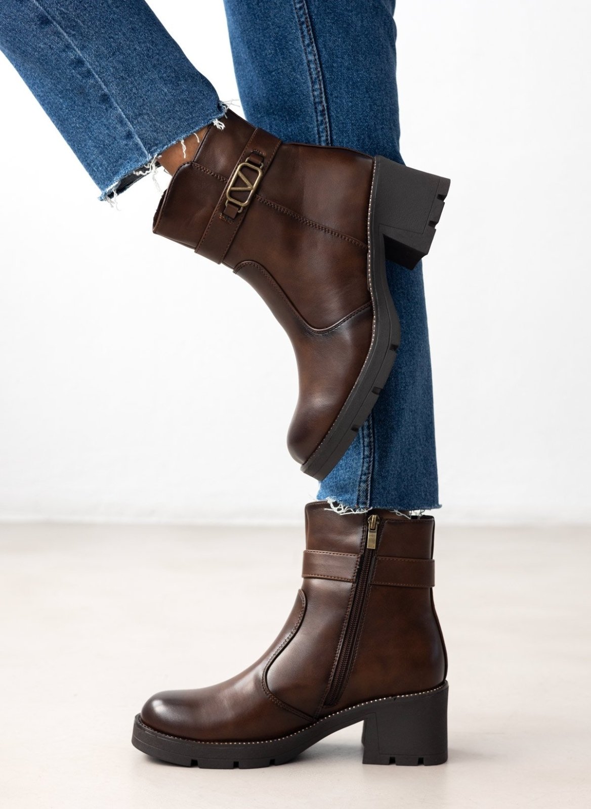 Μποτάκια με ζωνάκι και τοκά. Χοντρό τετράγωνο τακούνι. Λεπτομέρεια με στρας περιμετρικά της σόλας. Καρέ γραμμή.