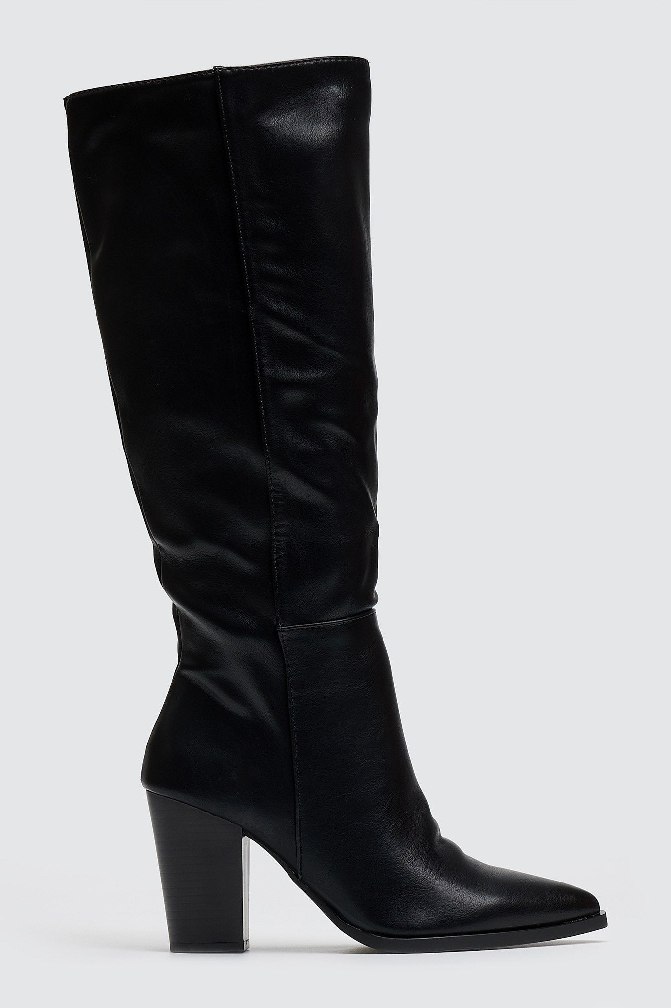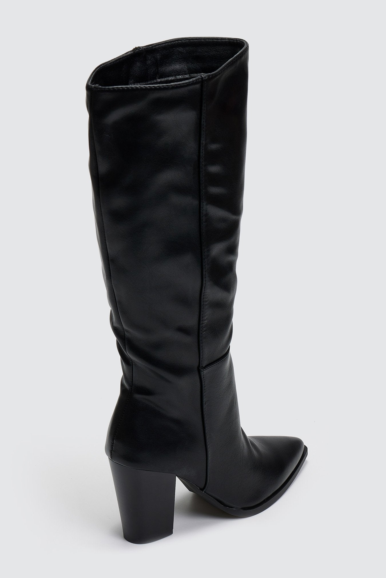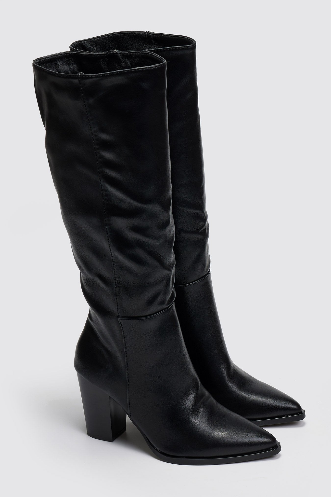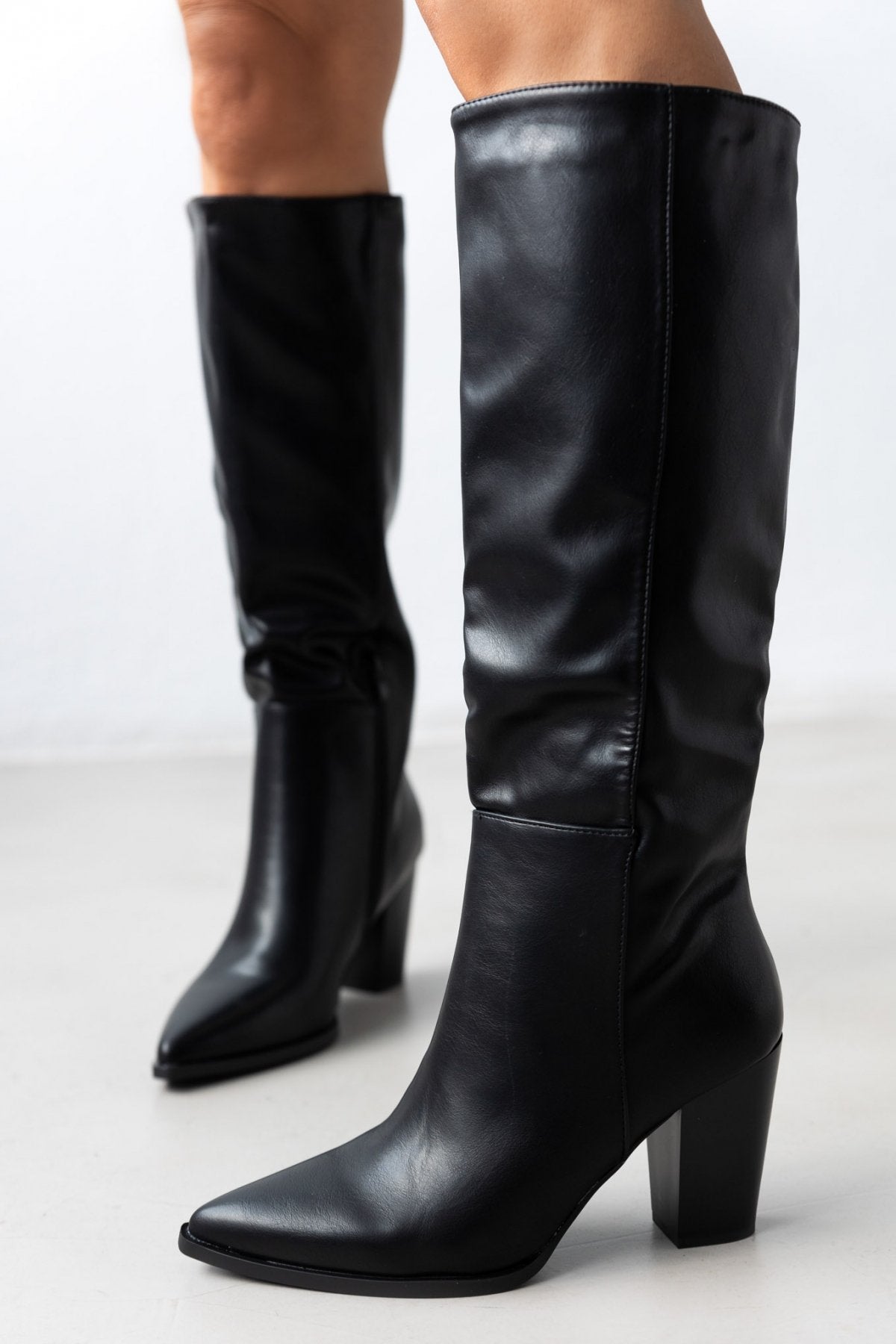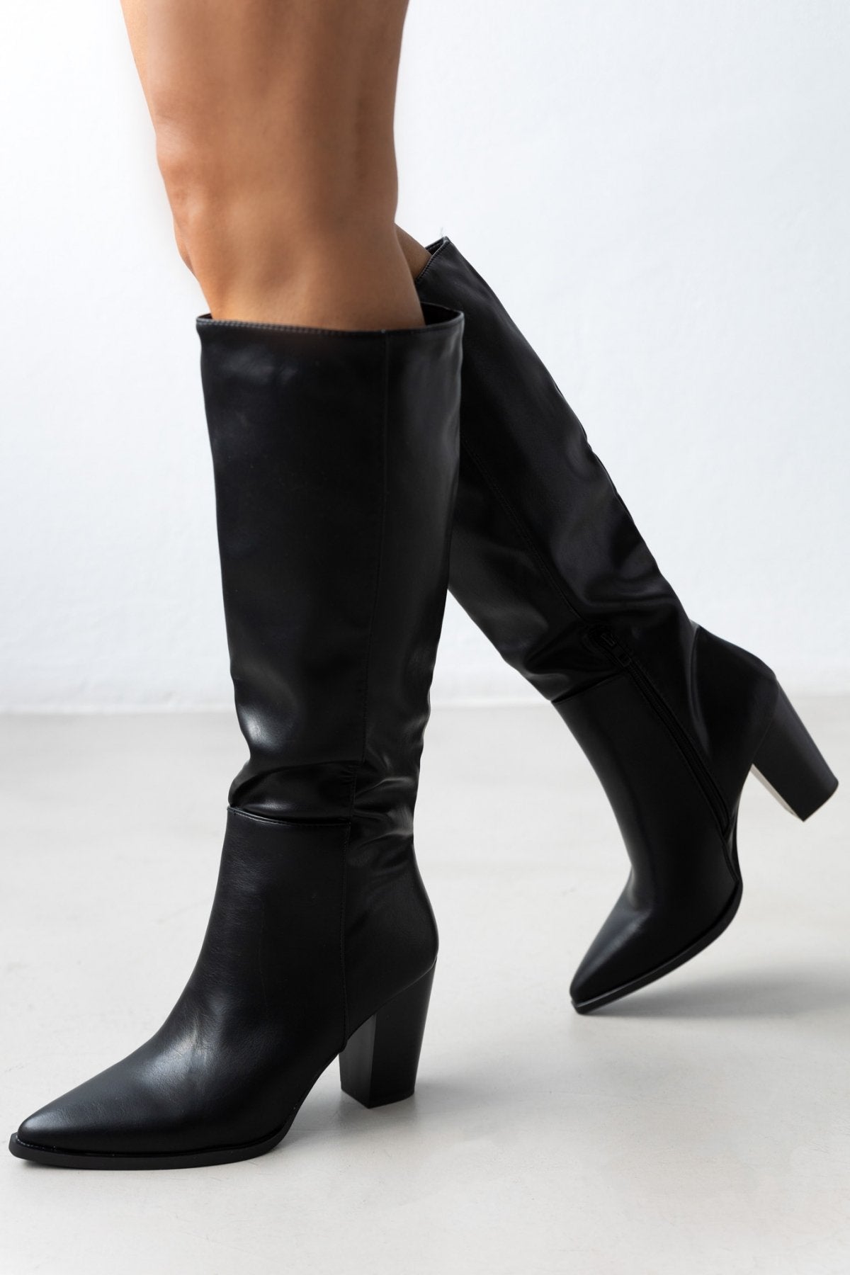 Μπότες μυτερές με χοντρό τακούνι. Εφαρμοστή γραμμή στη γάμπα. Φερμουάρ στην εσωτερική τους πλευρά.