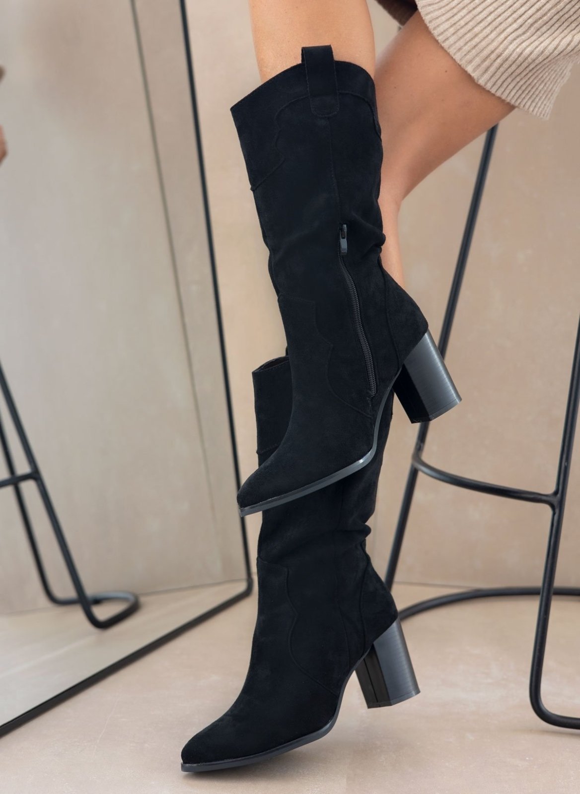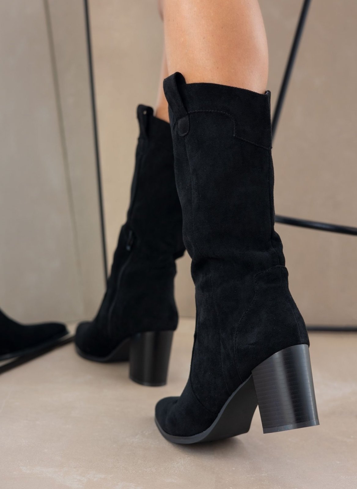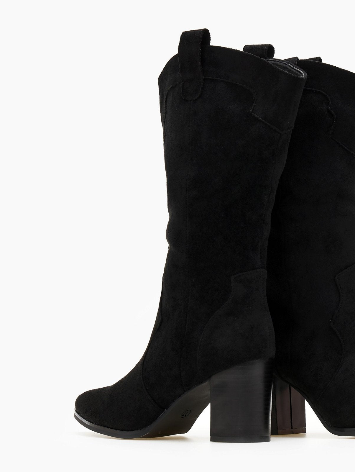 Μπότες western με ψηλό ξύλινο τακούνι. Έχουν οβάλ τελείωμα με θηλάκι. Μυτερή φόρμα.