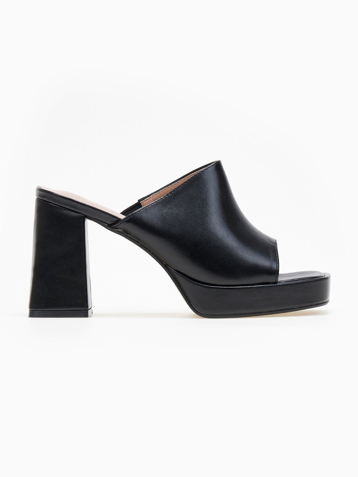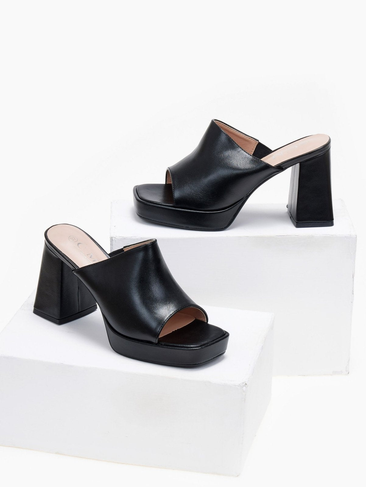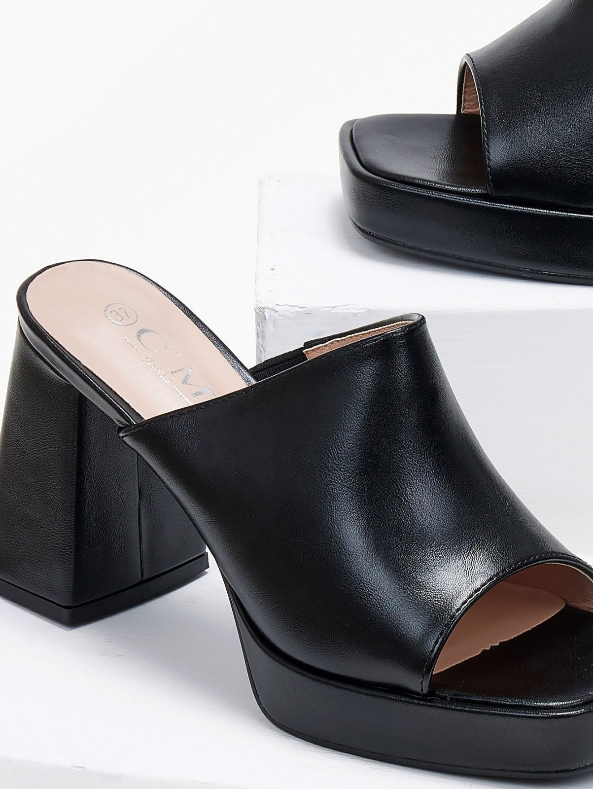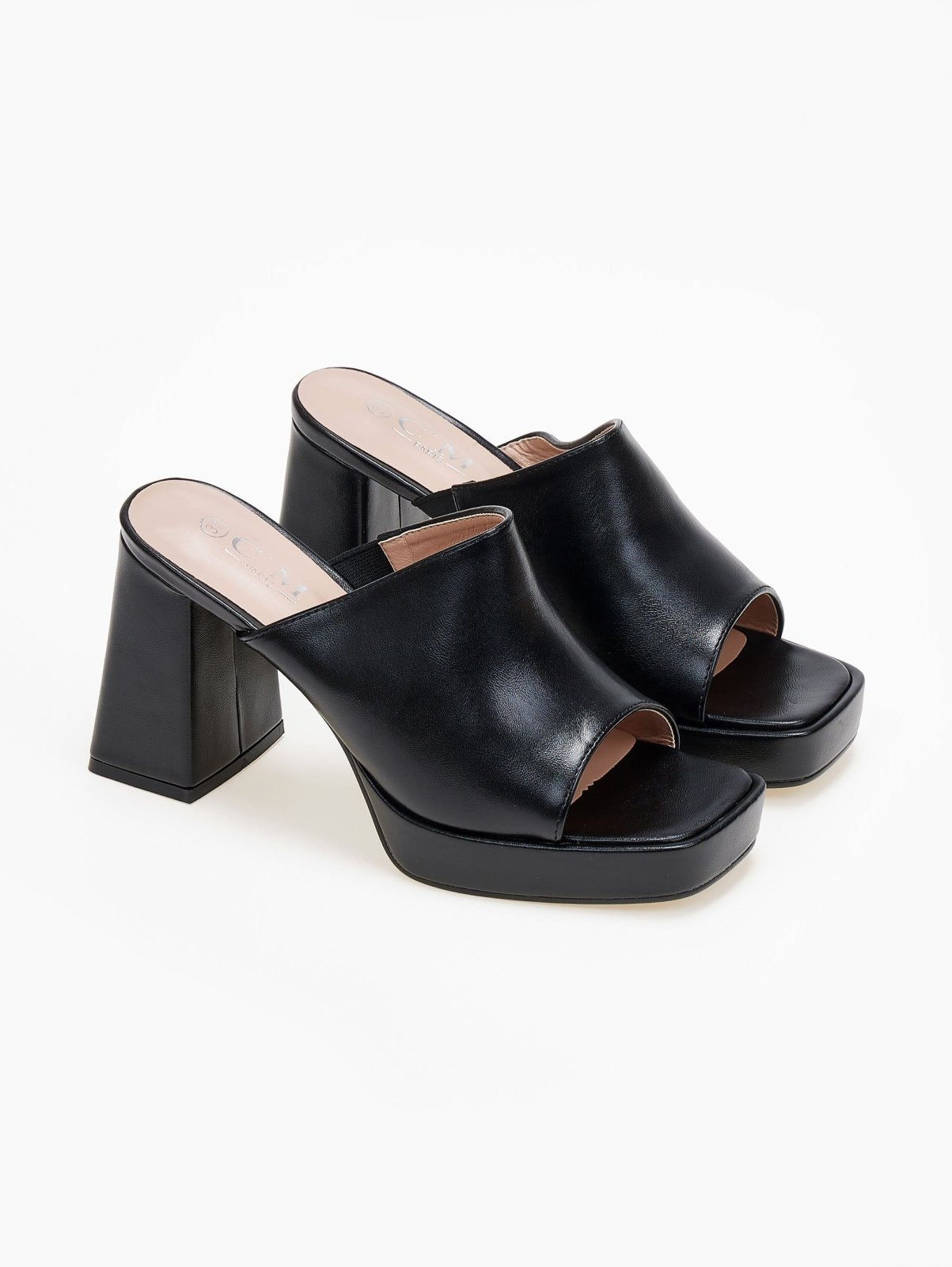 Mules με φαρδιά χωστή φάσα. Έχουν φιάπα και ψηλό χοντρό τακούνι. Καρέ γραμμή στα δάκτυλα.