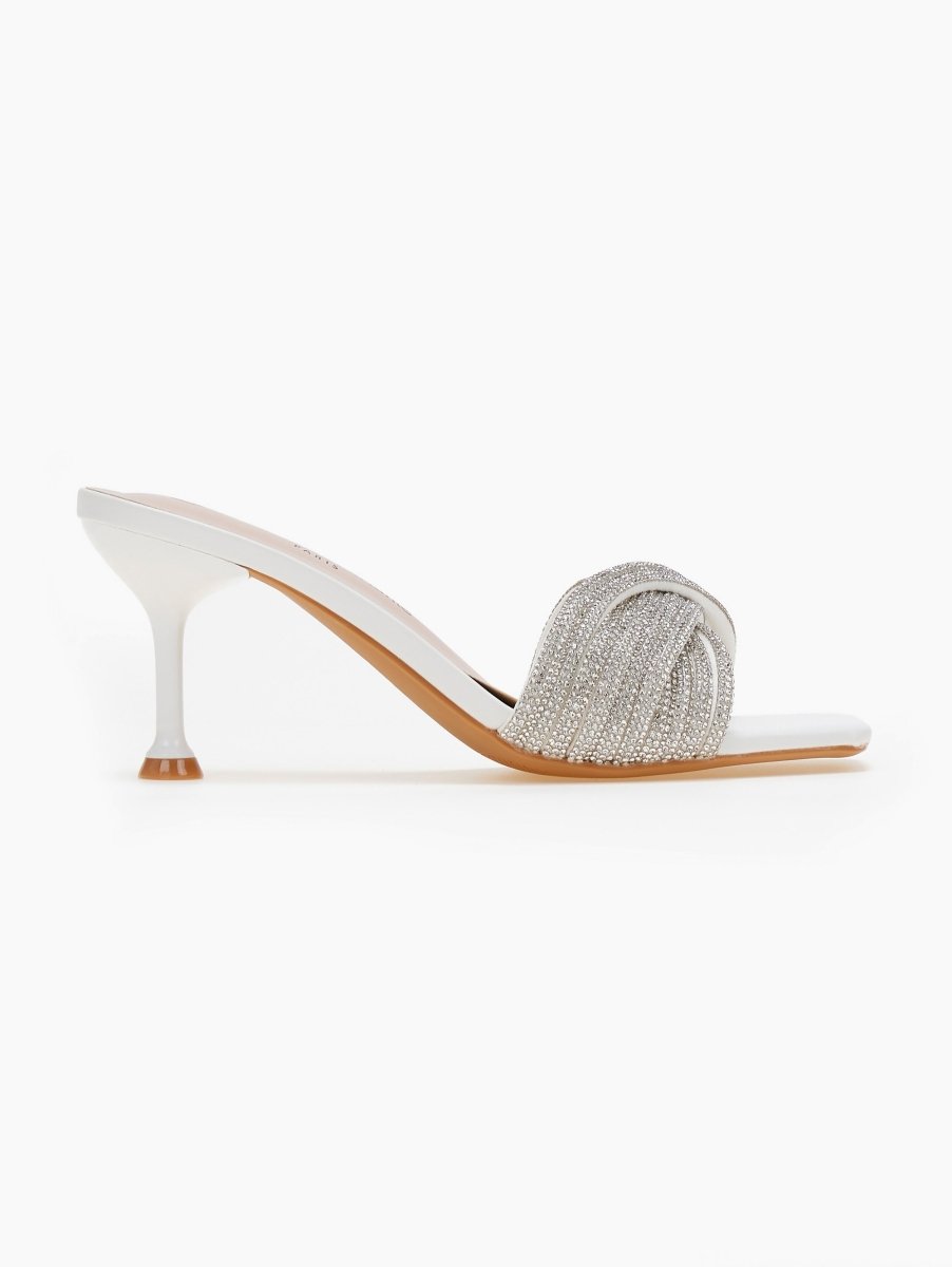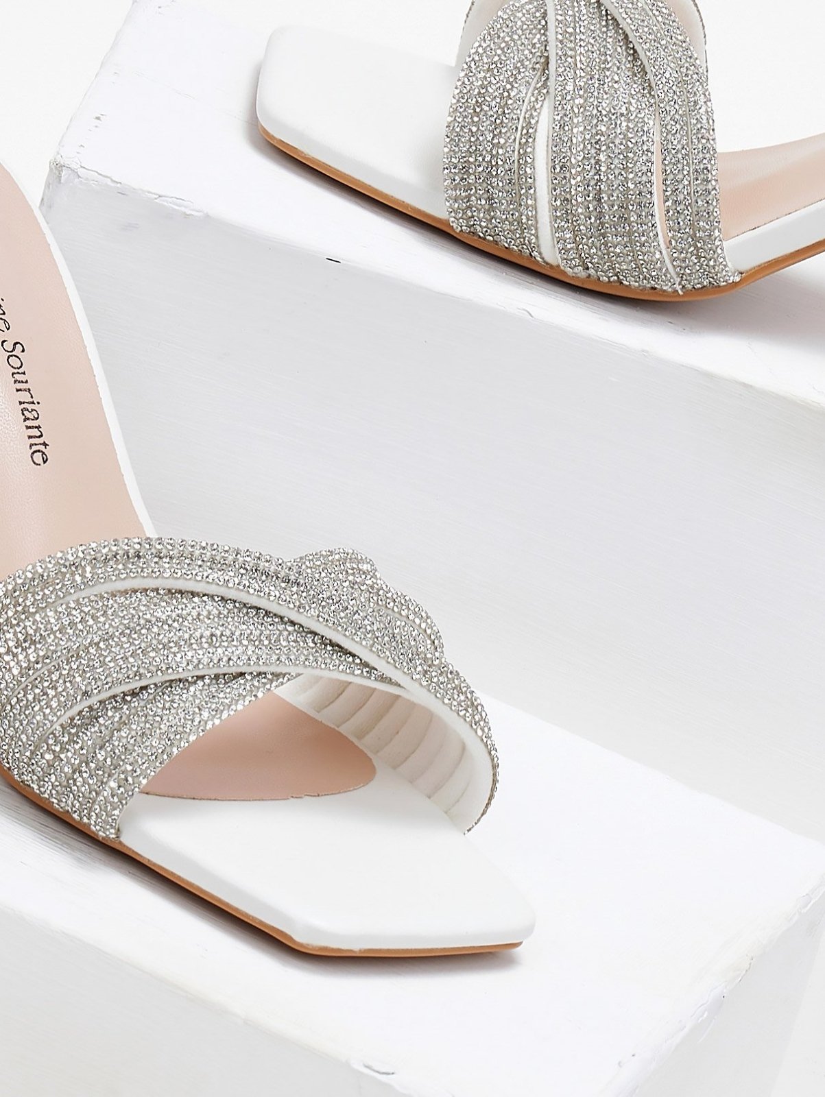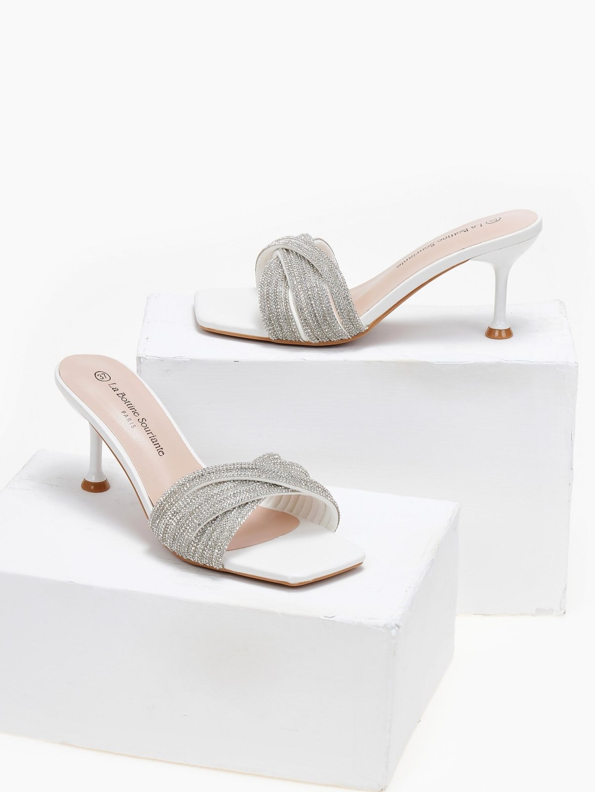 Mules με λεπτό τακούνι. Έχουν φάσα με περαστές στρας σειρές. Καρέ γραμμή.